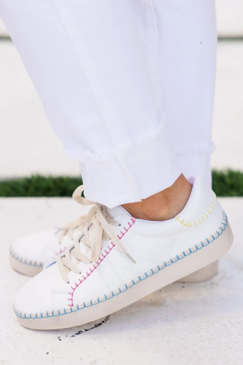 Say goodbye to boring shoes with our Days That Fade Sneakers! These white sneakers feature colorful stitching details for a fresh and fun vibe that will make your outfit pop! Perfect for adding a quirky touch to your style!