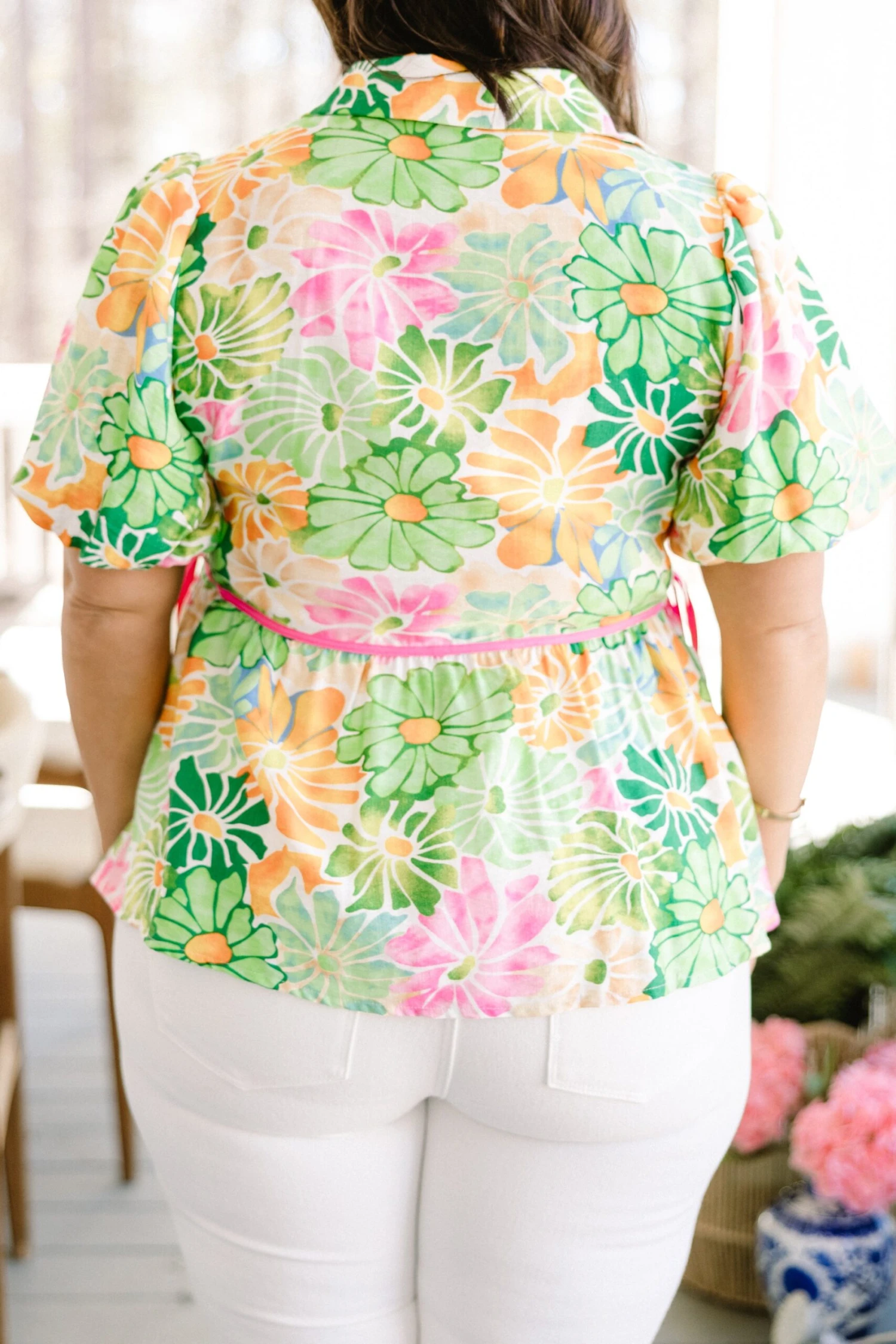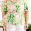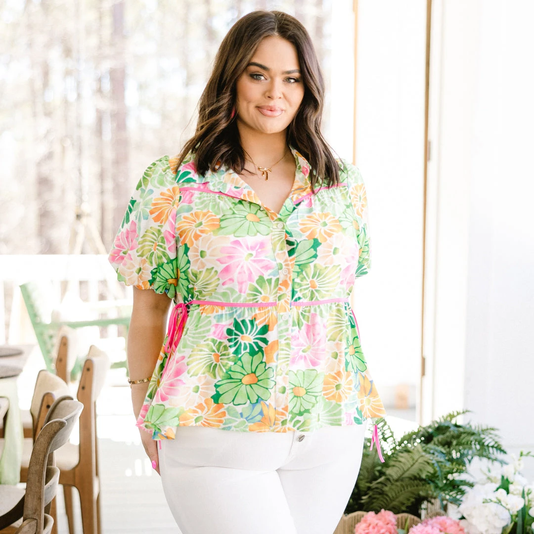 Elevate your style with this top in green floral! This charming top features elegant elastic puff sleeves, delicate pink colored piping details, and a collared button down design! Perfect for any occasion, this top adds a touch of sophistication to any outfit! Experience the beauty and comfort in one!
