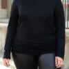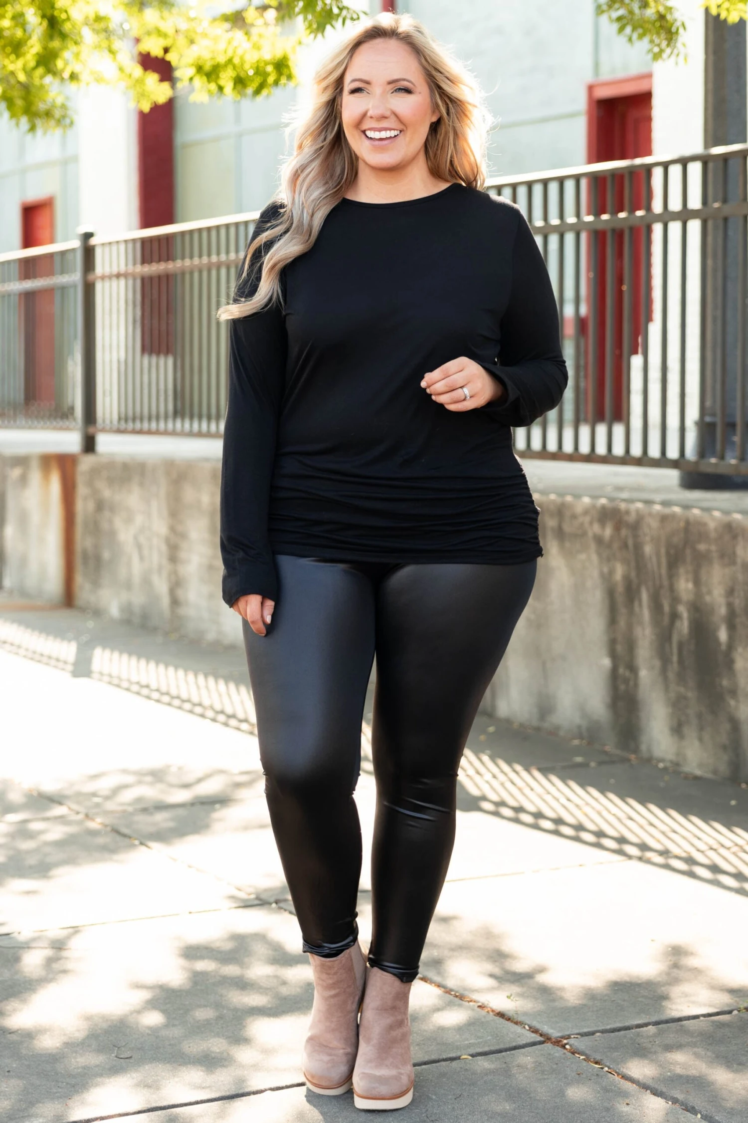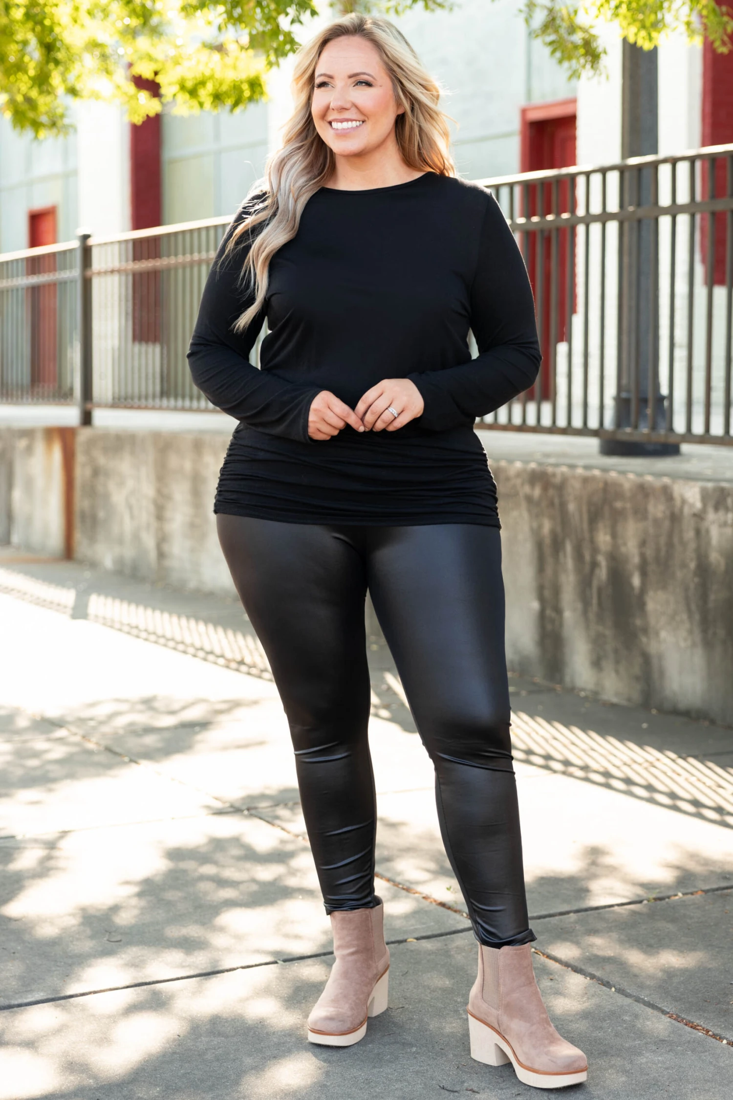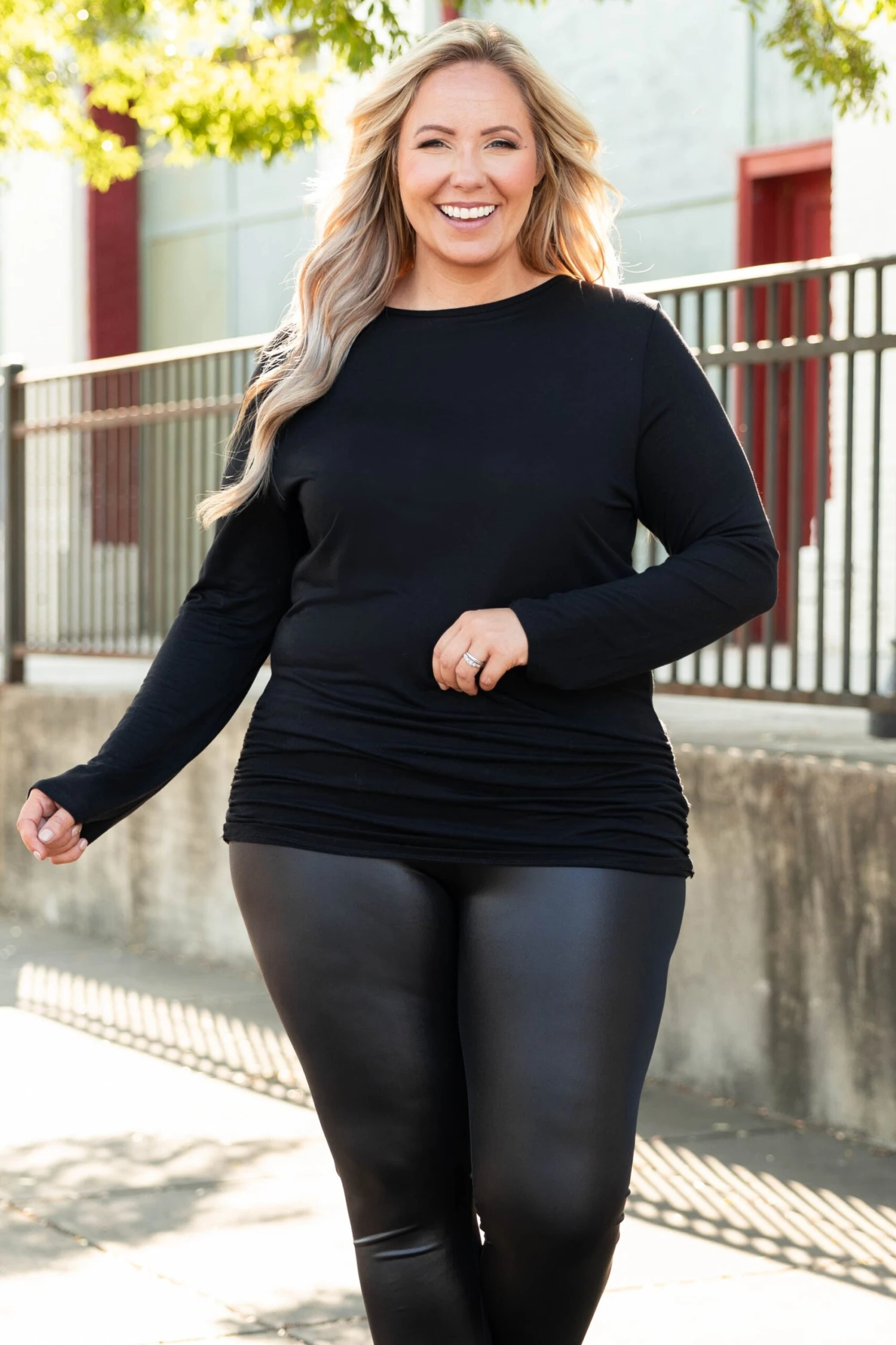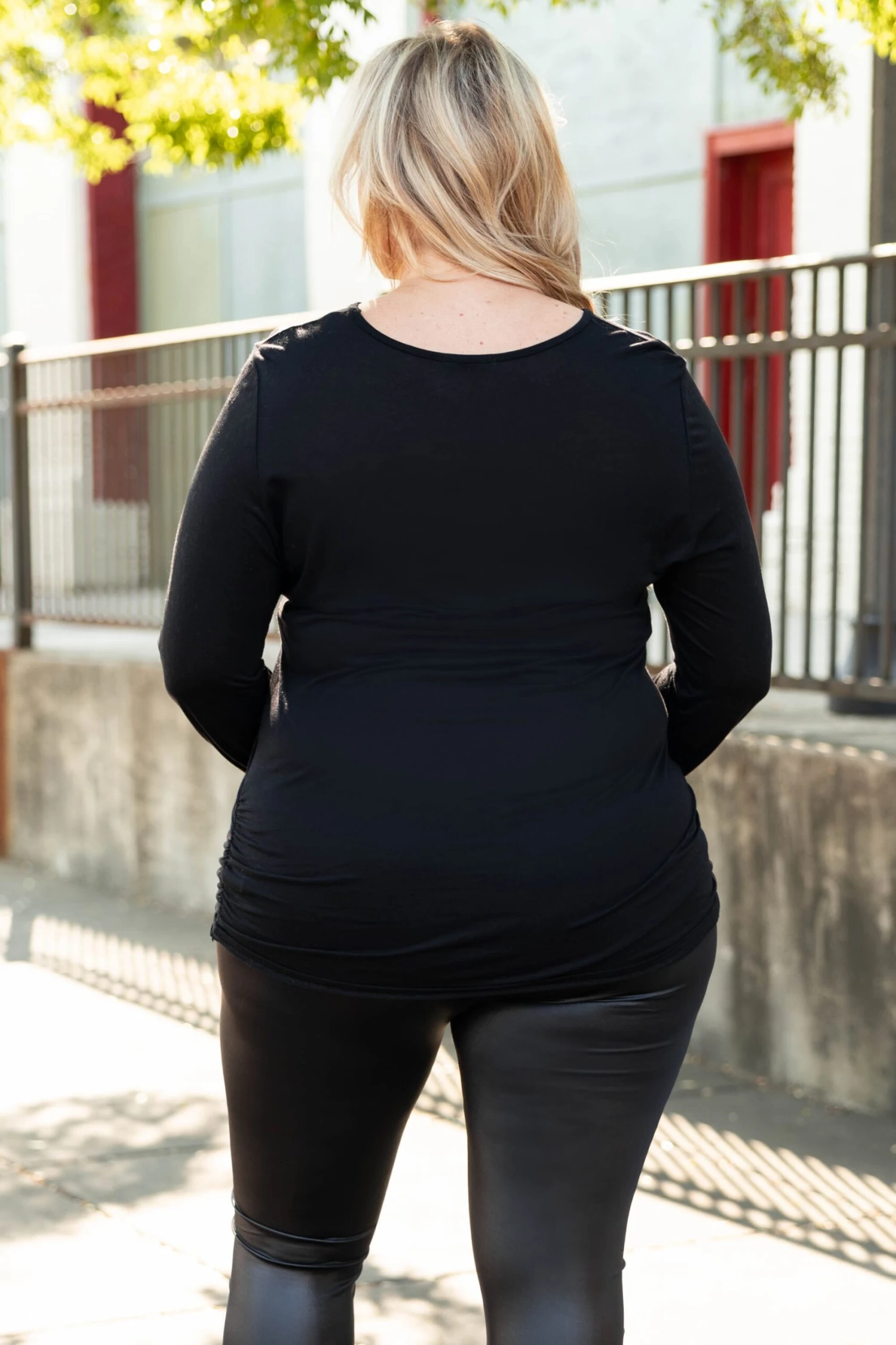 Make some new memories in this beautiful top! This top has a neutral, black color and the ruched sides are so figure flattering and chic! Dress this top up with some colored pants and heels or leggings and booties for a sassy, casual look!