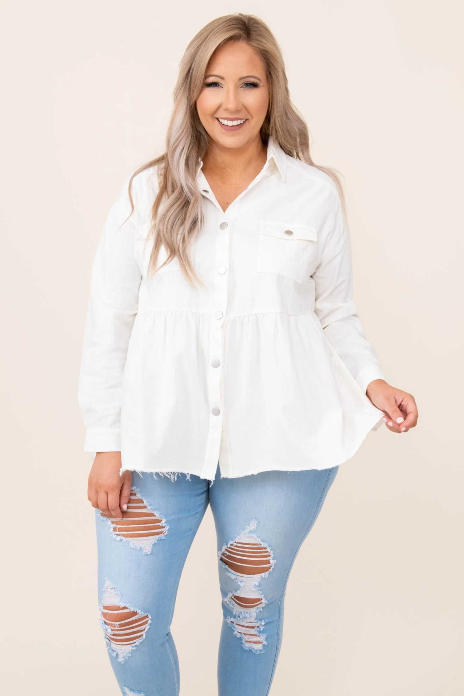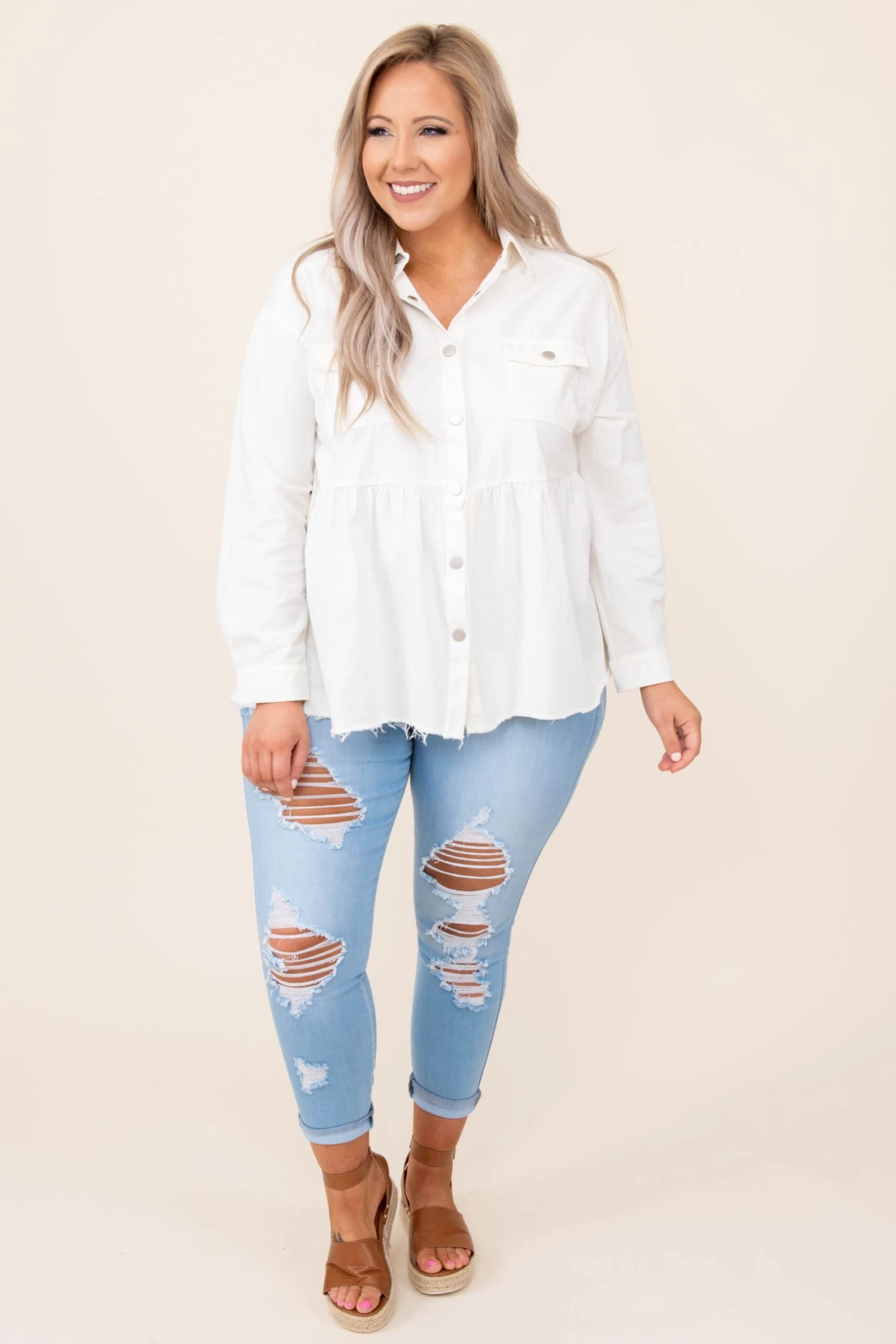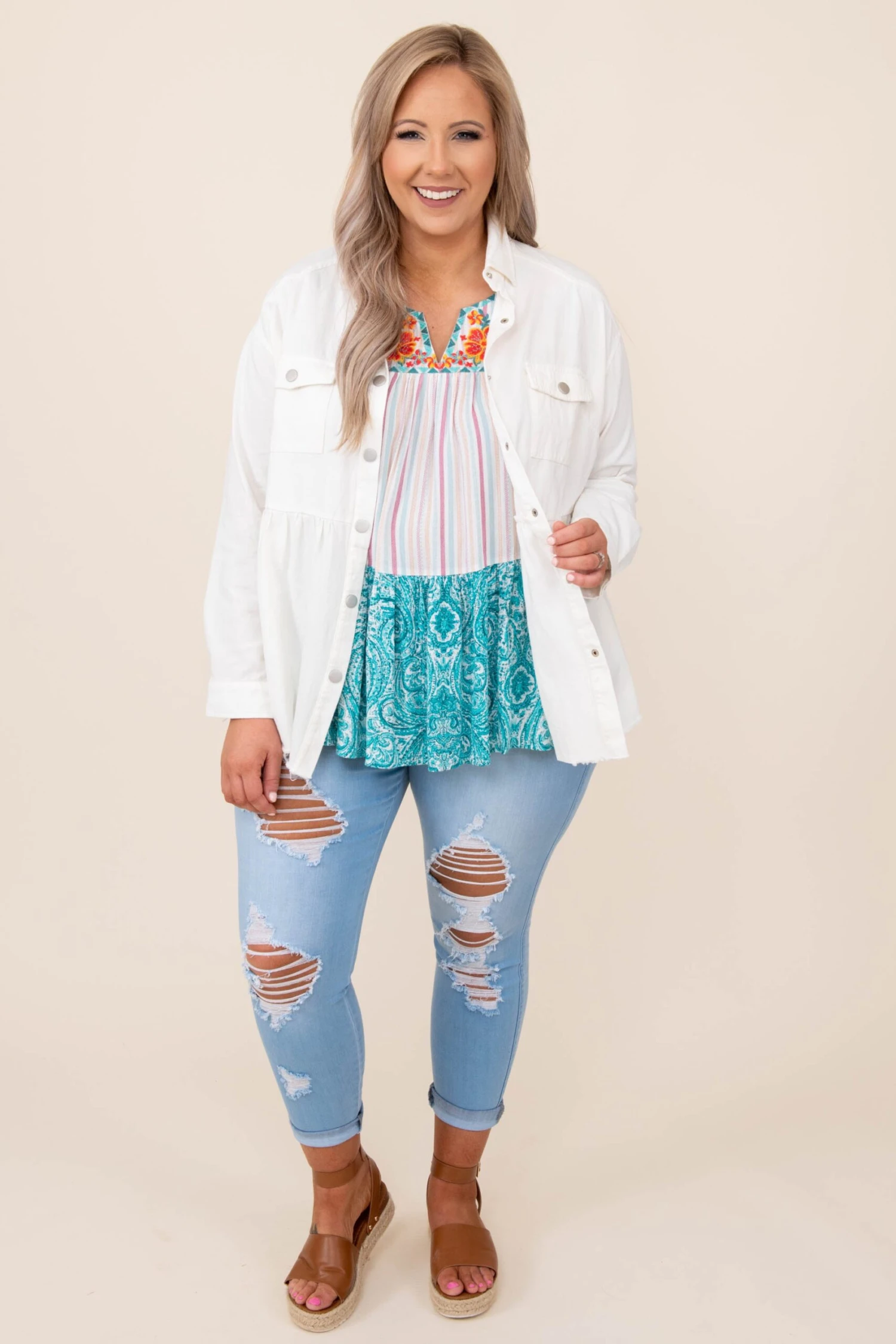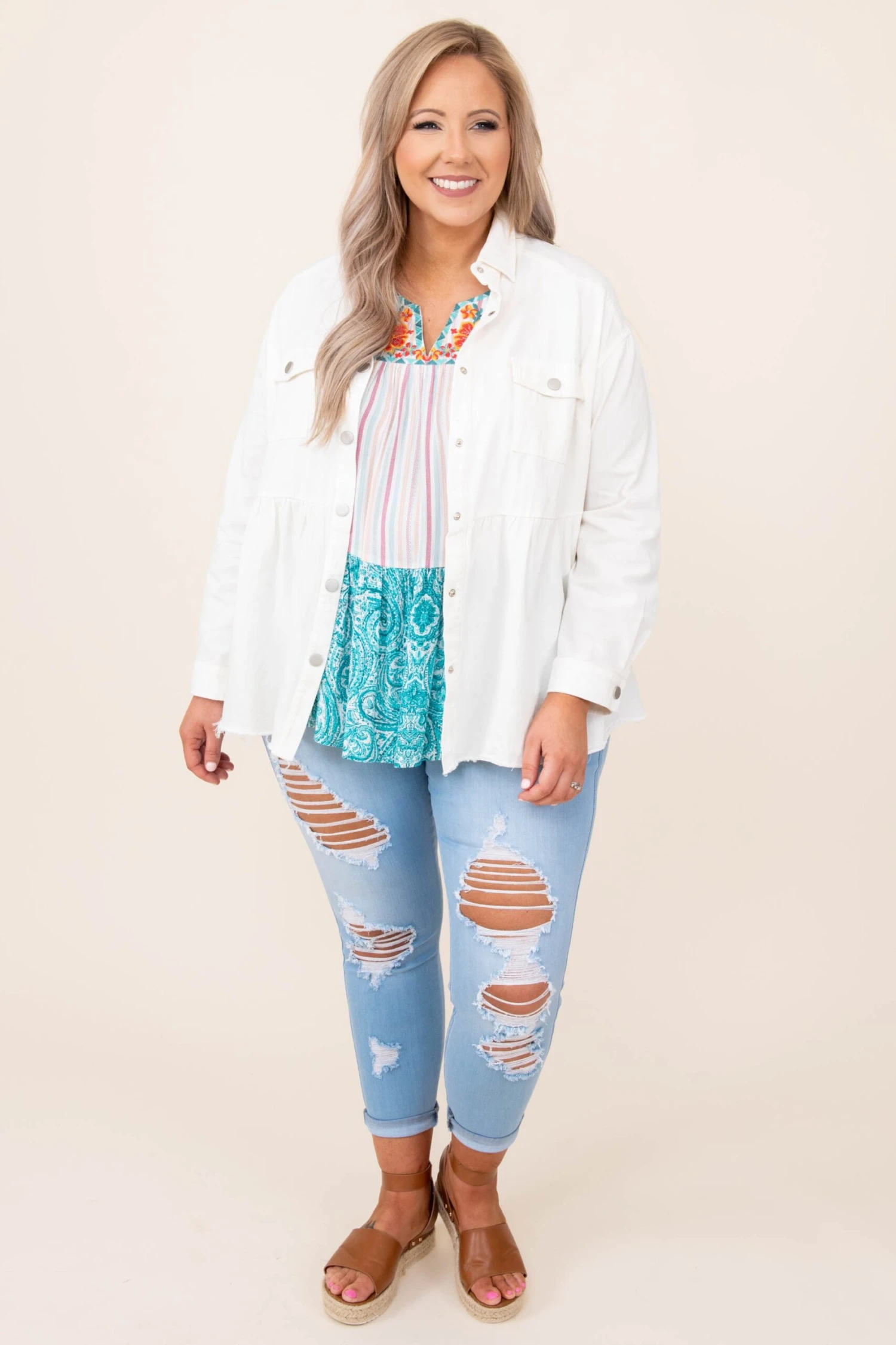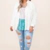 Be cozy and chic in this jacket! It features a classic denim fabric with chic distressing! It’s comfortable for all-day wear, has a flowy fit, and features the perfect length to pair with all of your jeans and jeggings!  Simply pair this jacket with a basic top or graphic tee for an effortlessly trendy look!
