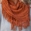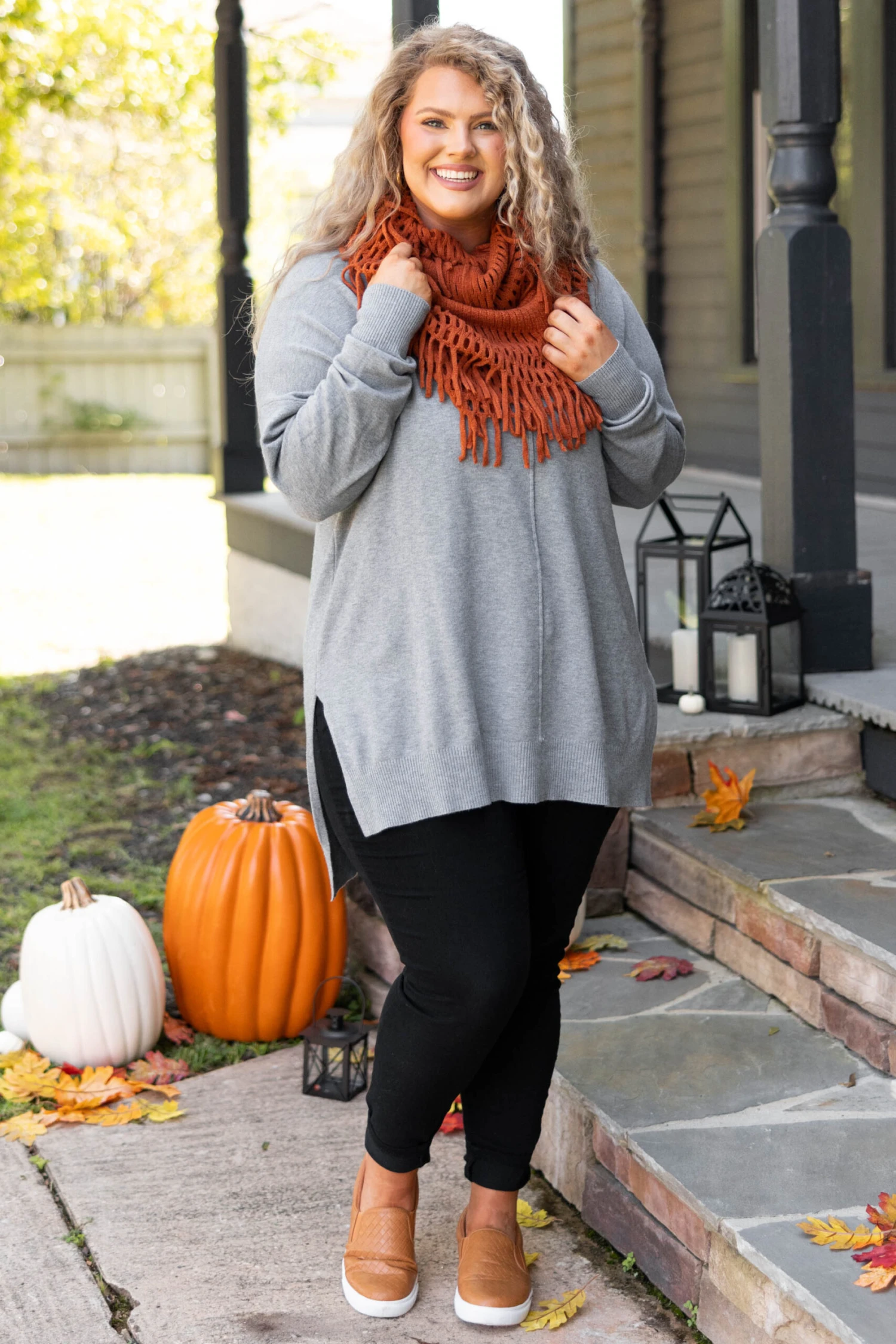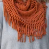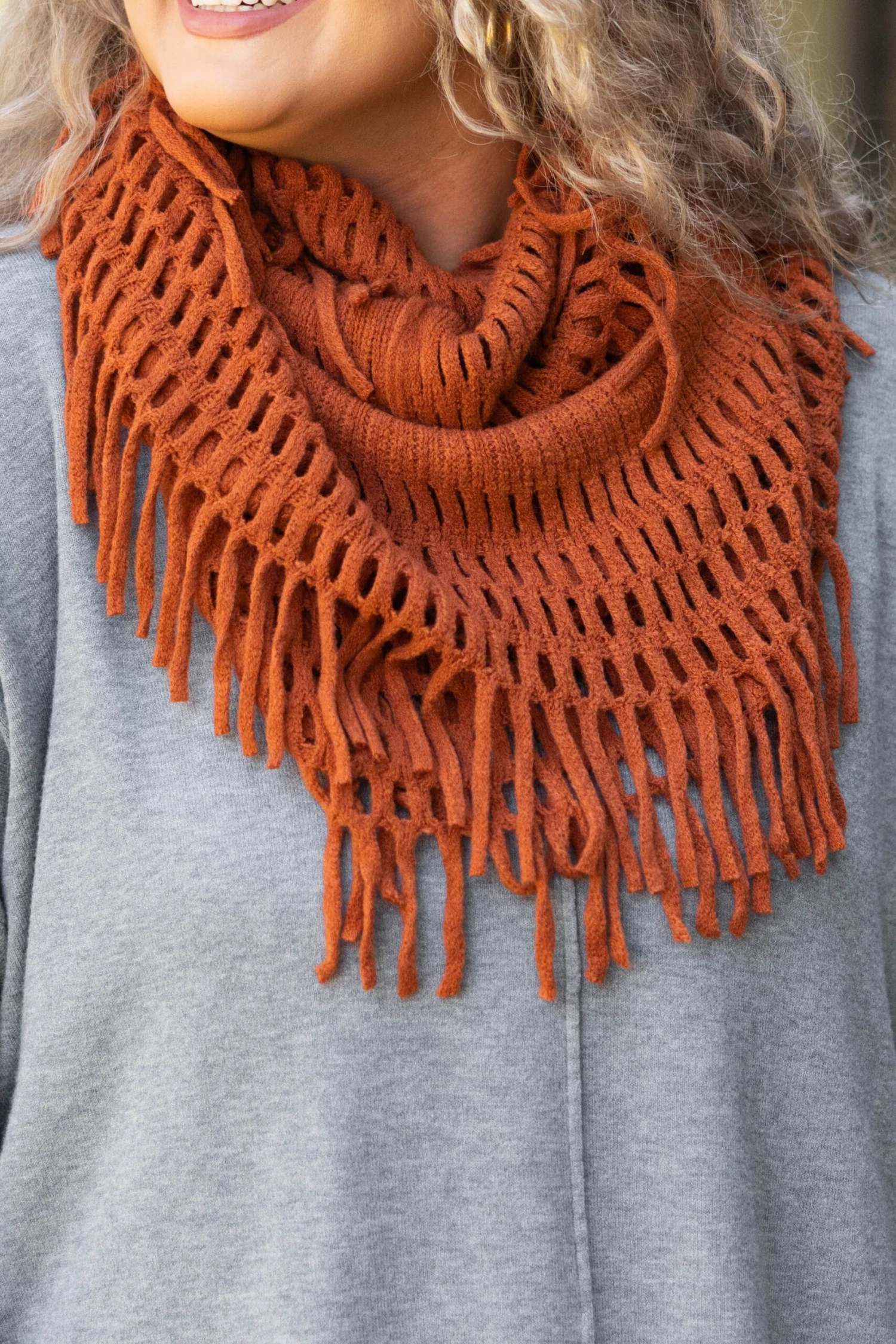 Enjoy a cozy getaway with this scarf! This scarf has a beautiful rust color, infinity style, and a knitted design that is SO sweet! Style this scarf with all of your favorite outfits this season for a trendy chic look!