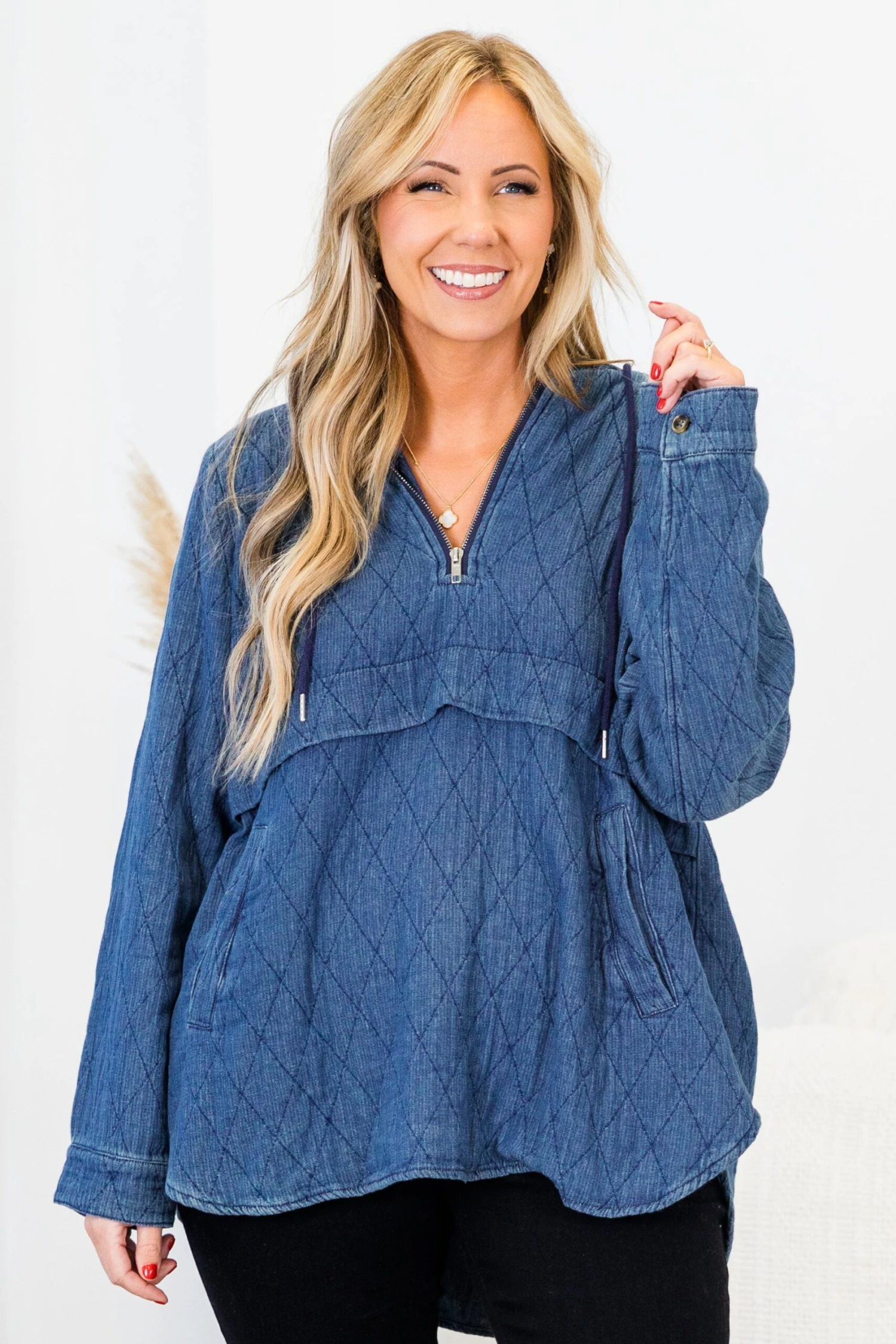 Introducing the Cozy In Carolina Hoodie, in a sleek and stylish blue geometric print! Stay warm and comfortable with the long sleeve design, three quarter zip detail, and hooded feature! Conveniently equipped with two side pockets for added functionality! Elevate your wardrobe with this must-have hoodie!