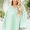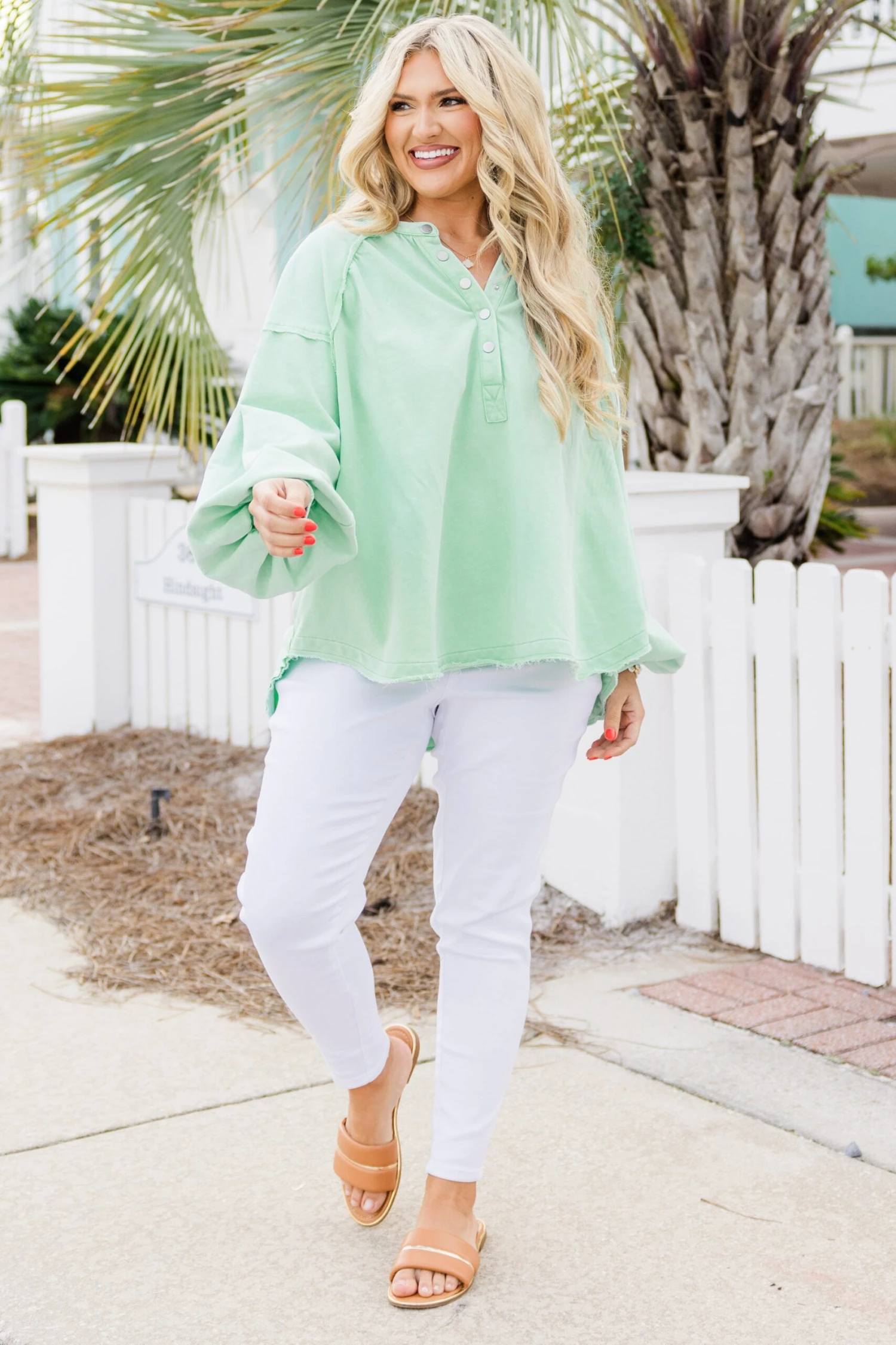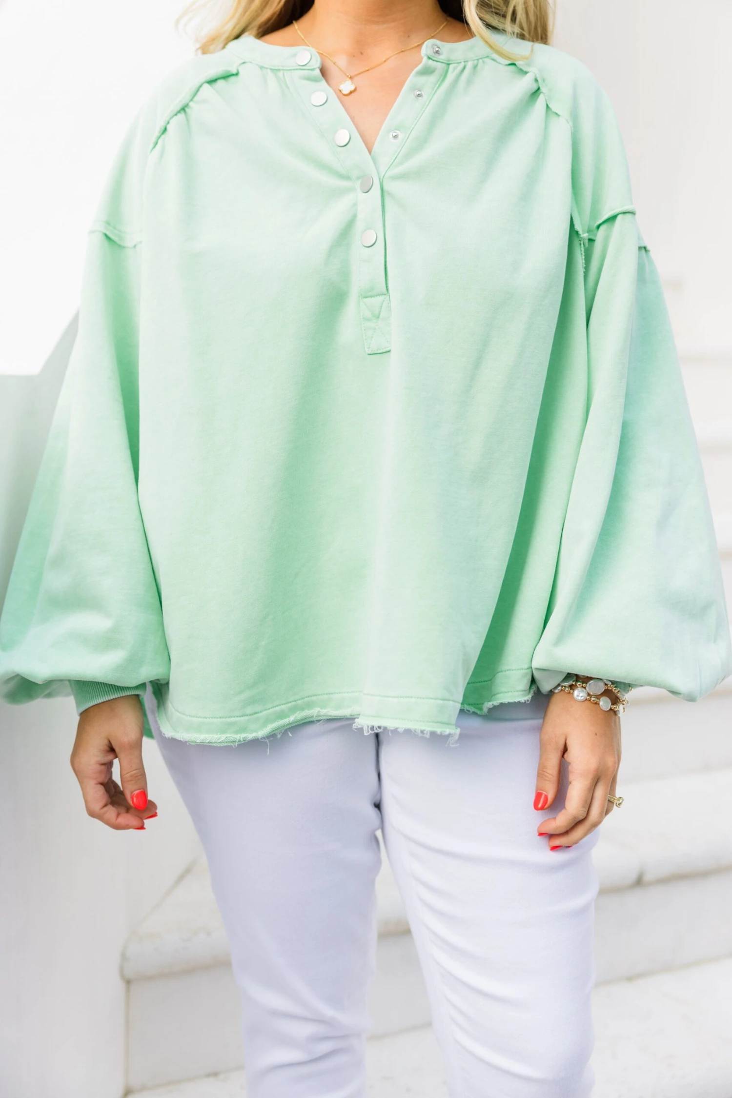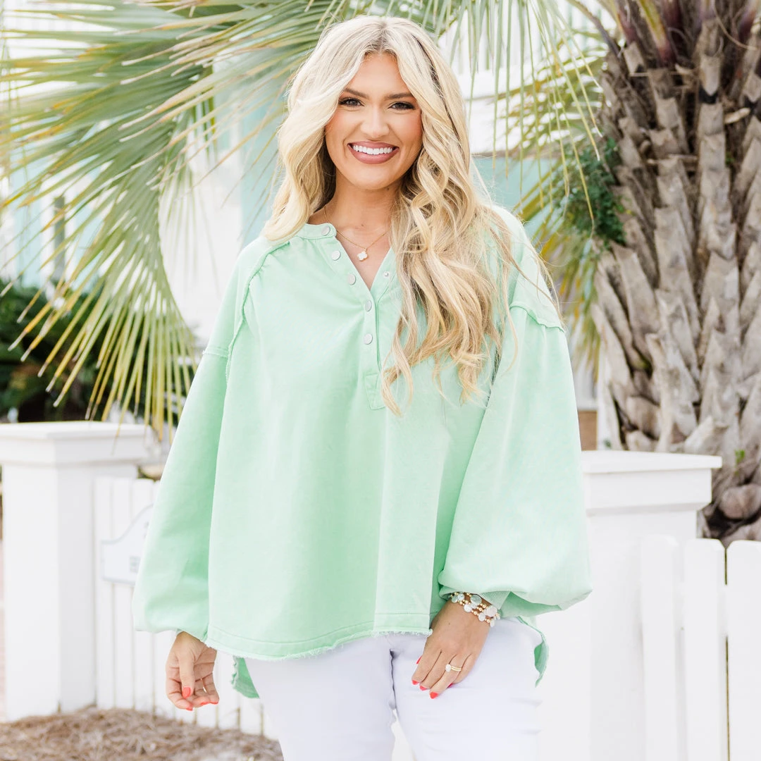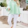 The Crimson Sunset Pullover in refreshing mint is a must-have addition to any wardrobe! With a raw hemline, exposed seam detail, and clasp buttons, this playful and stylish pullover is perfect for adding a pop of color to any outfit!
