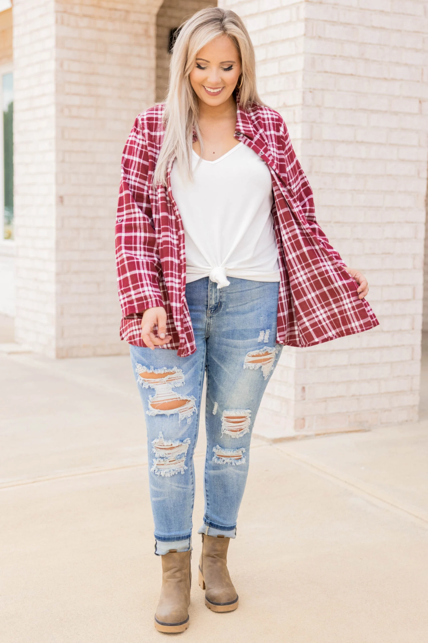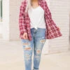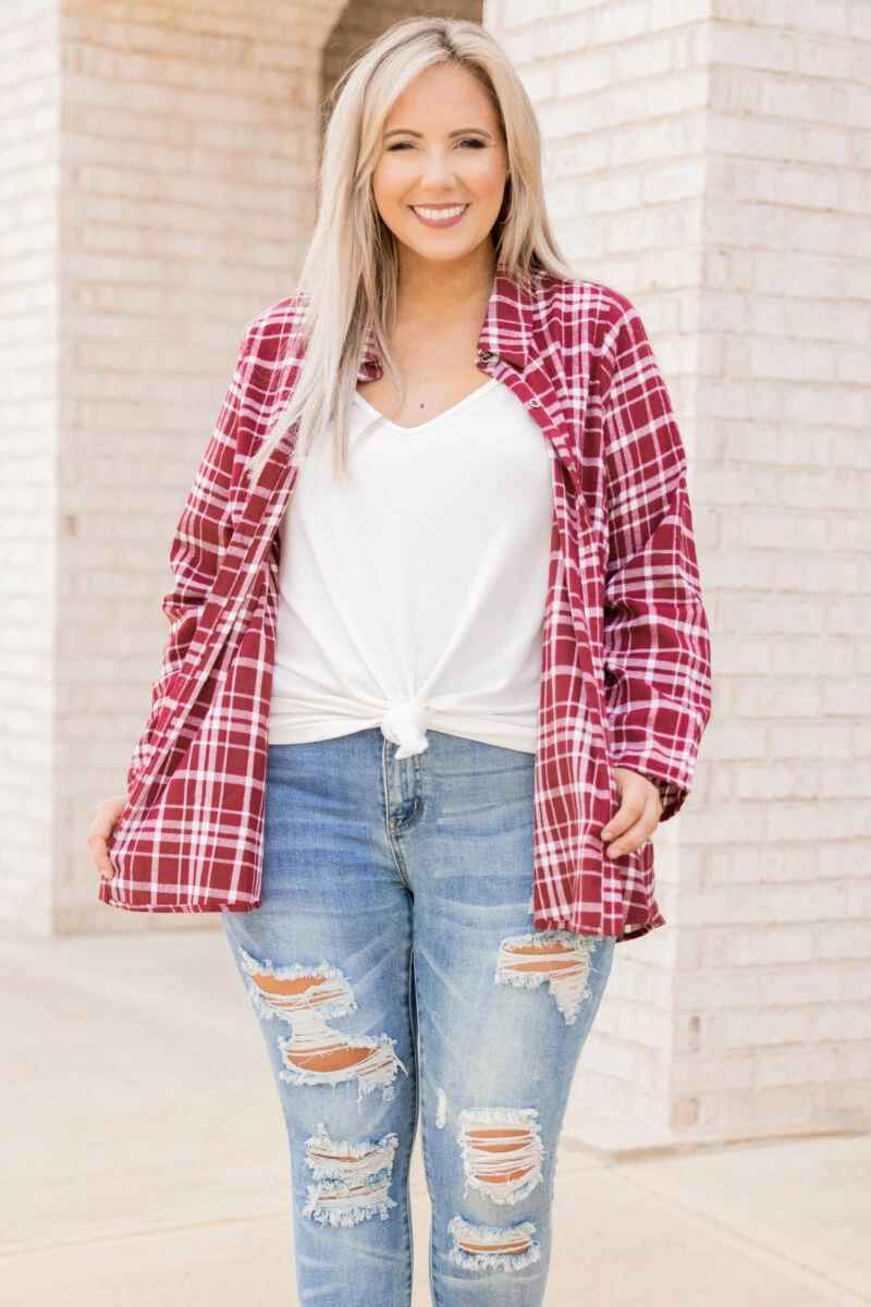 This trendy flannel has a fun plaid print with burgundy colors you can style with your favorite pieces! It’s comfortable for all-day wear, has a flowy oversized fit, and gives off major Fall vibes! Wear this top as a layering piece or buttoned up on its own with skinnies for an effortlessly chic look!Â