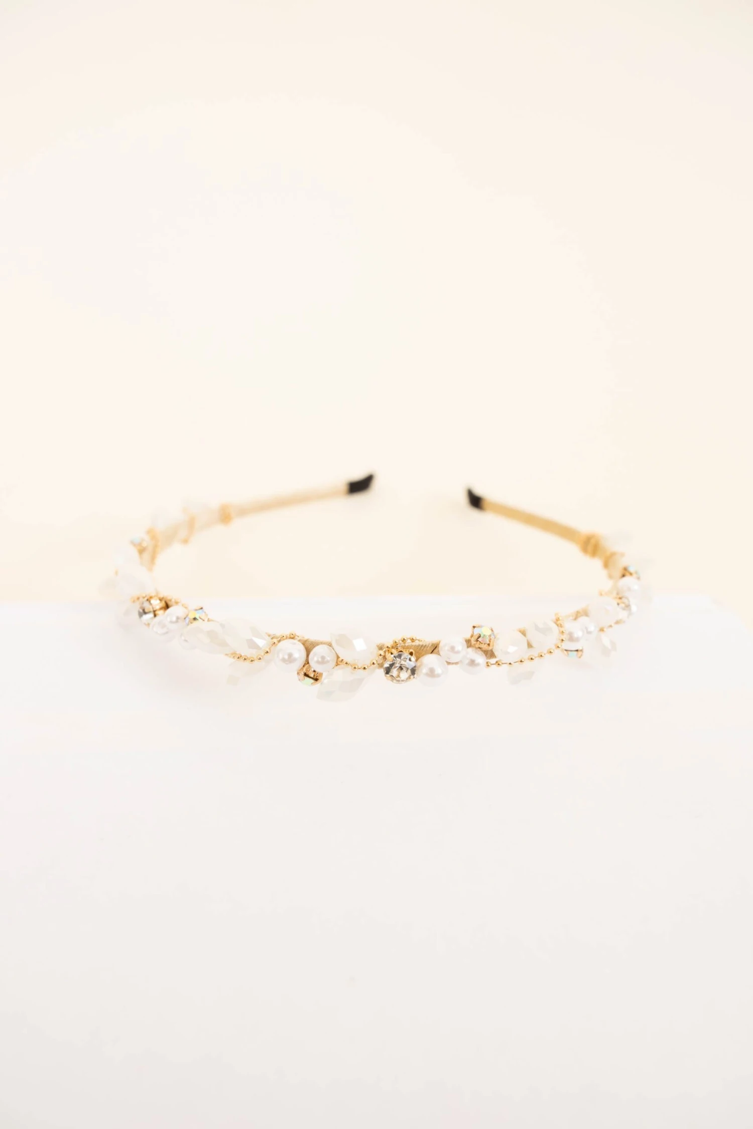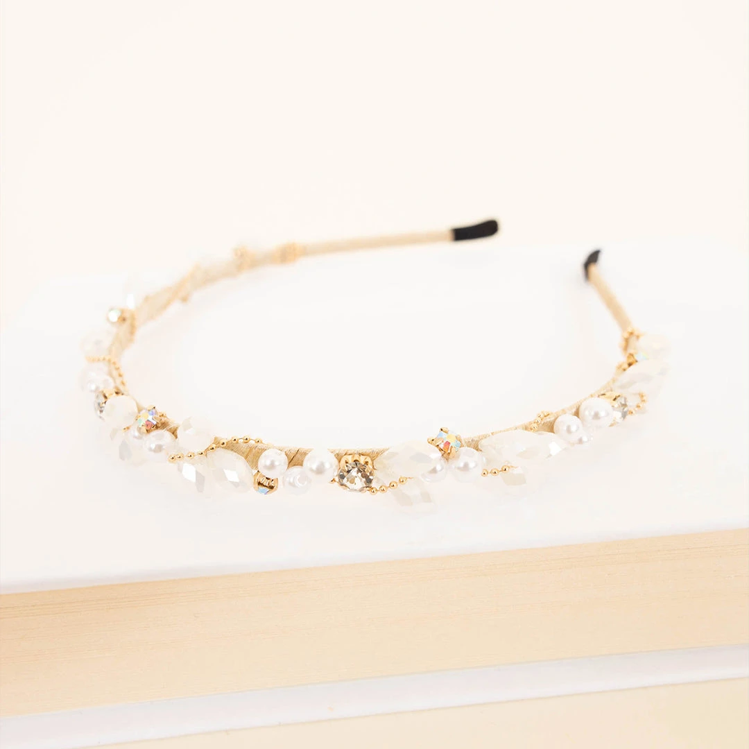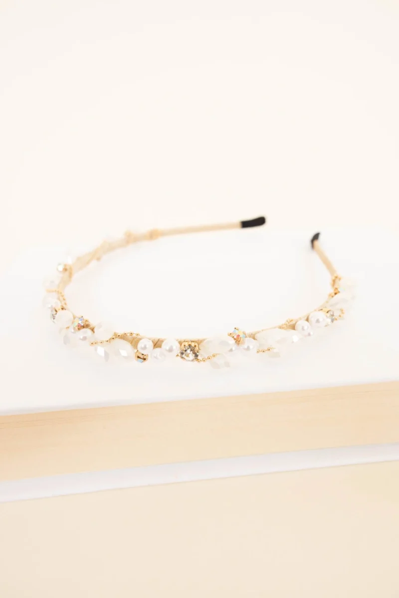 This luxuriously designed headband is crafted with white pearls and shimmering crystals for a timeless classic look. Perfect for any special occasion, this piece of bridal jewelry is sure to add a touch of glamour to your big day!