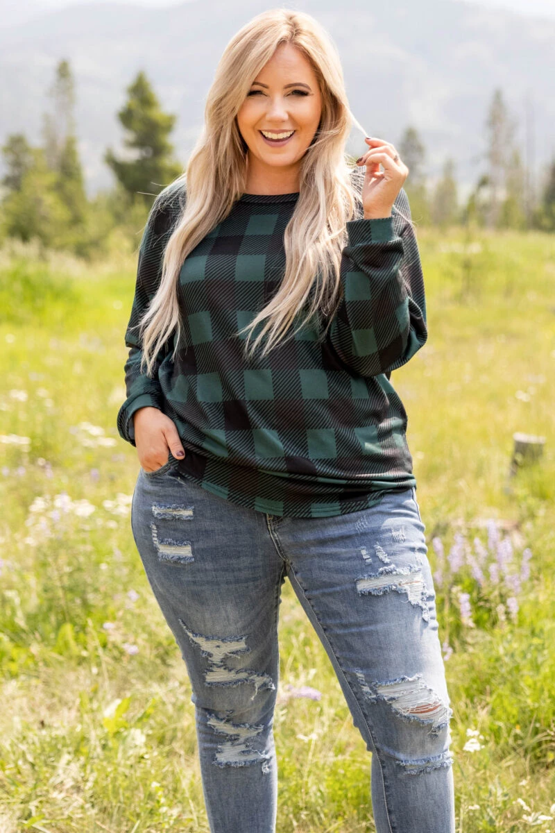 Our ALL NEW curved hem slouchy is here!!! This hunter green plaid tunic has a flattering CURVED hem, our signature dolman sleeves and long, looser fit! It is going to be your new go-to piece for the fall and winter! It is seriously the softest material ever, and the color makes it SO easy to style! Pair it with leggings, skinnies, booties, flats, a scarf, some bold accessories…seriously the opportunities are endless!!