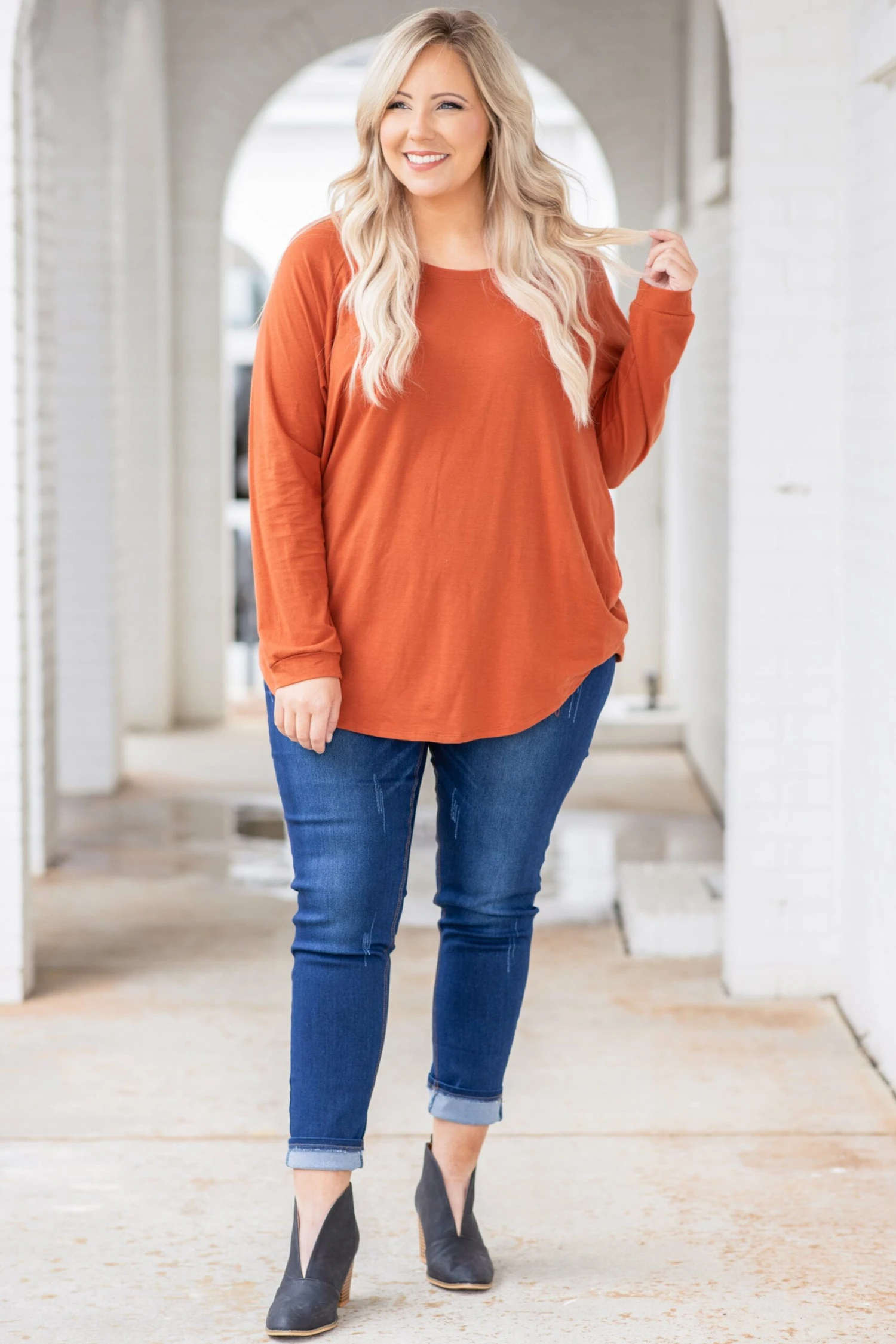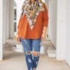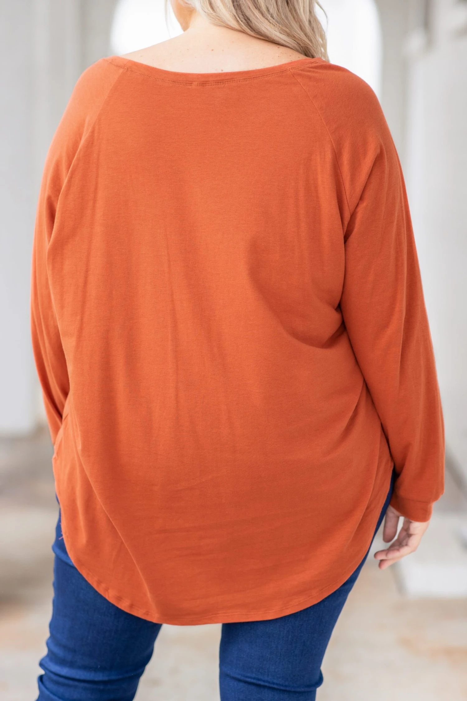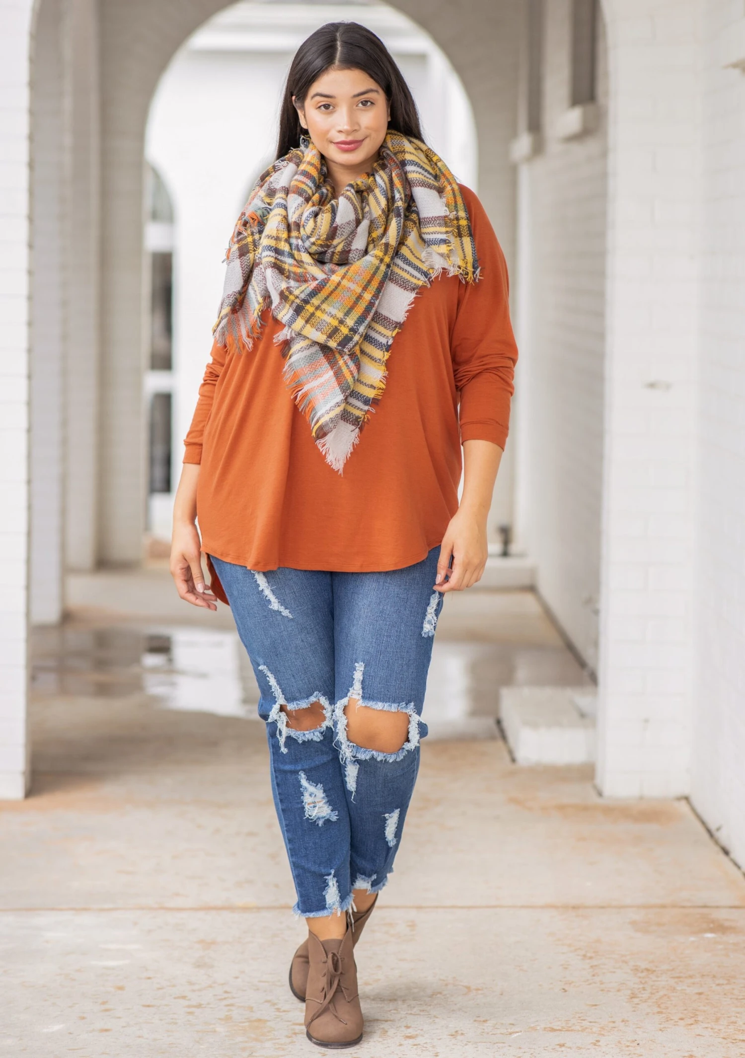 Our ALL NEW Slouchy is here!!! This stunning rust tunic has a flattering CURVED hem, our signature dolman sleeves and long, loose fit! This tunic is going to be your new go-to piece for the fall and winter! It is seriously the softest material ever, and the bold color makes it SO fun to style! Pair it with leggings, skinnies, booties, flats, a scarf, some glam accessories…seriously the opportunities are endless!! This comfy, cute beauty is a no-brainer!!