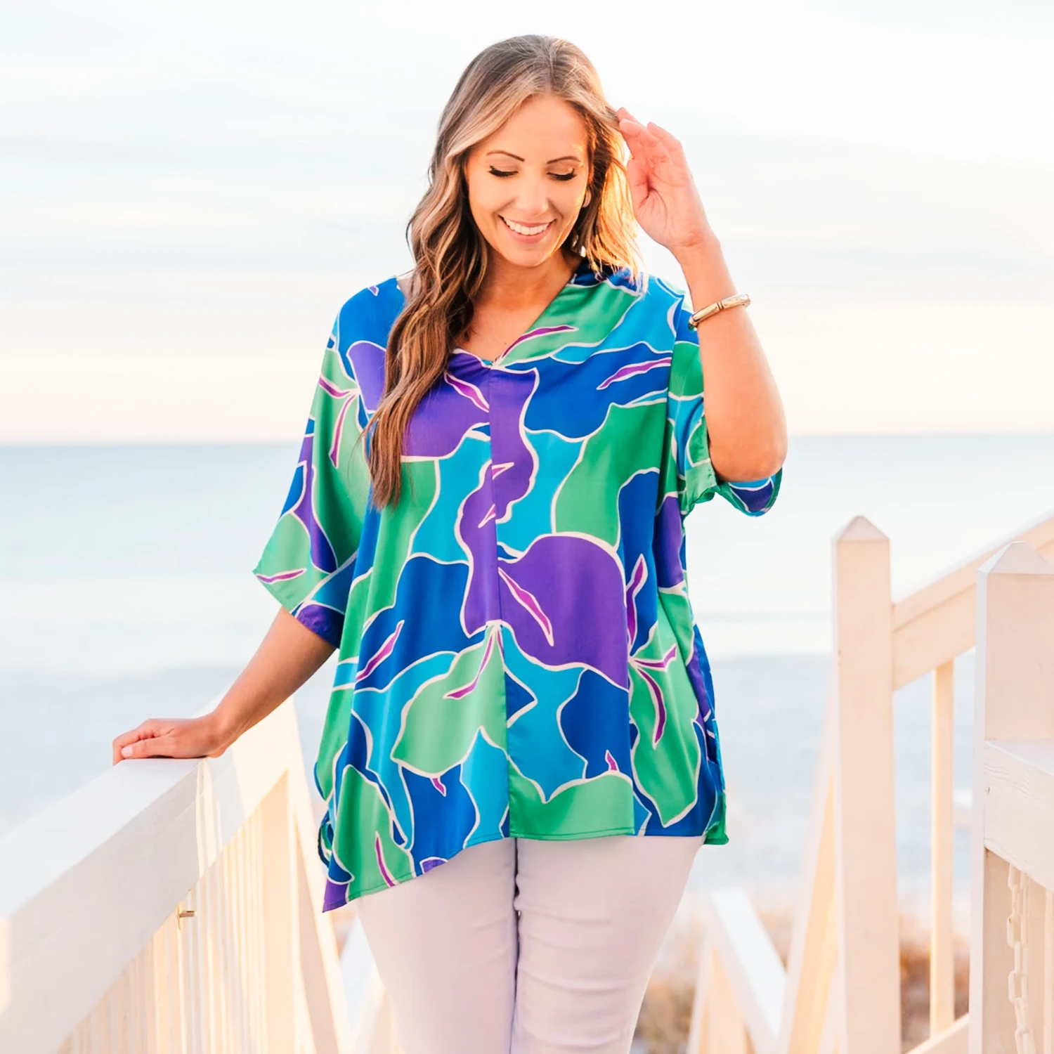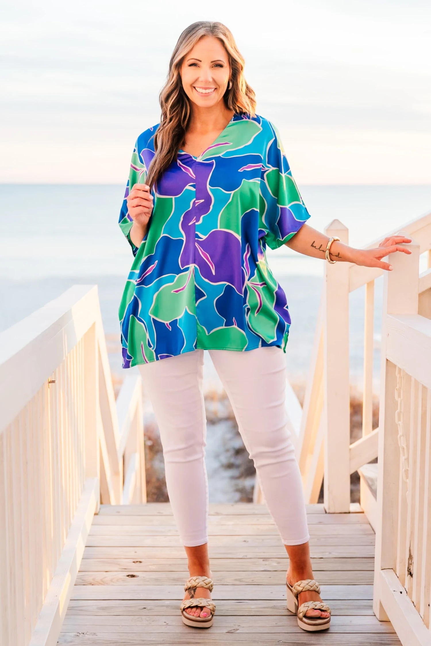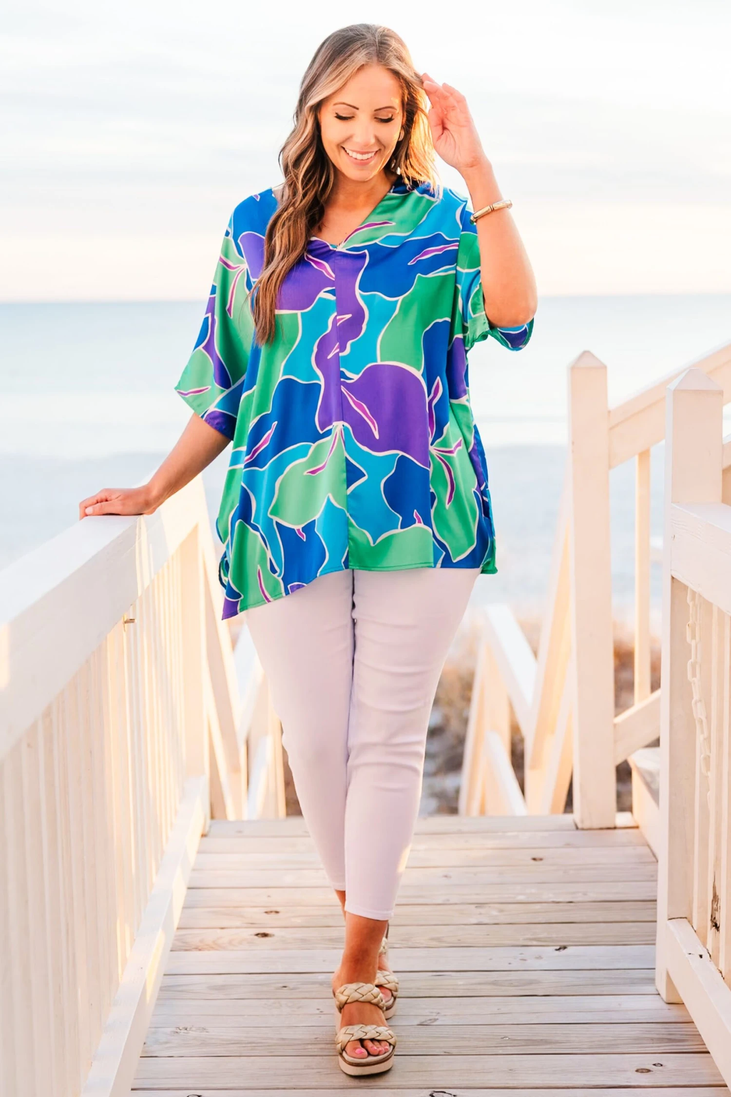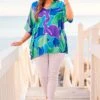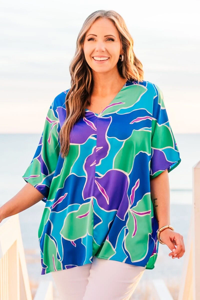 We are so in love with this fabulous top! It features a stunning tropical pattern with bold colors that are simply mesmerizing! With a flowy fit, this top is perfect for your next resort trip or a day beach side! Upgrade your style and stay comfortable in this must-have top!