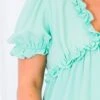 Effortlessly chic, the Dancing For Fun Top in mint features a ruffled v-neckline and elastic ruffle sleeves! Perfect for any occasion, this top adds a touch of playfulness to your wardrobe while providing a comfortable and flattering fit! Turn heads and feel confident in this stylish and versatile piece!