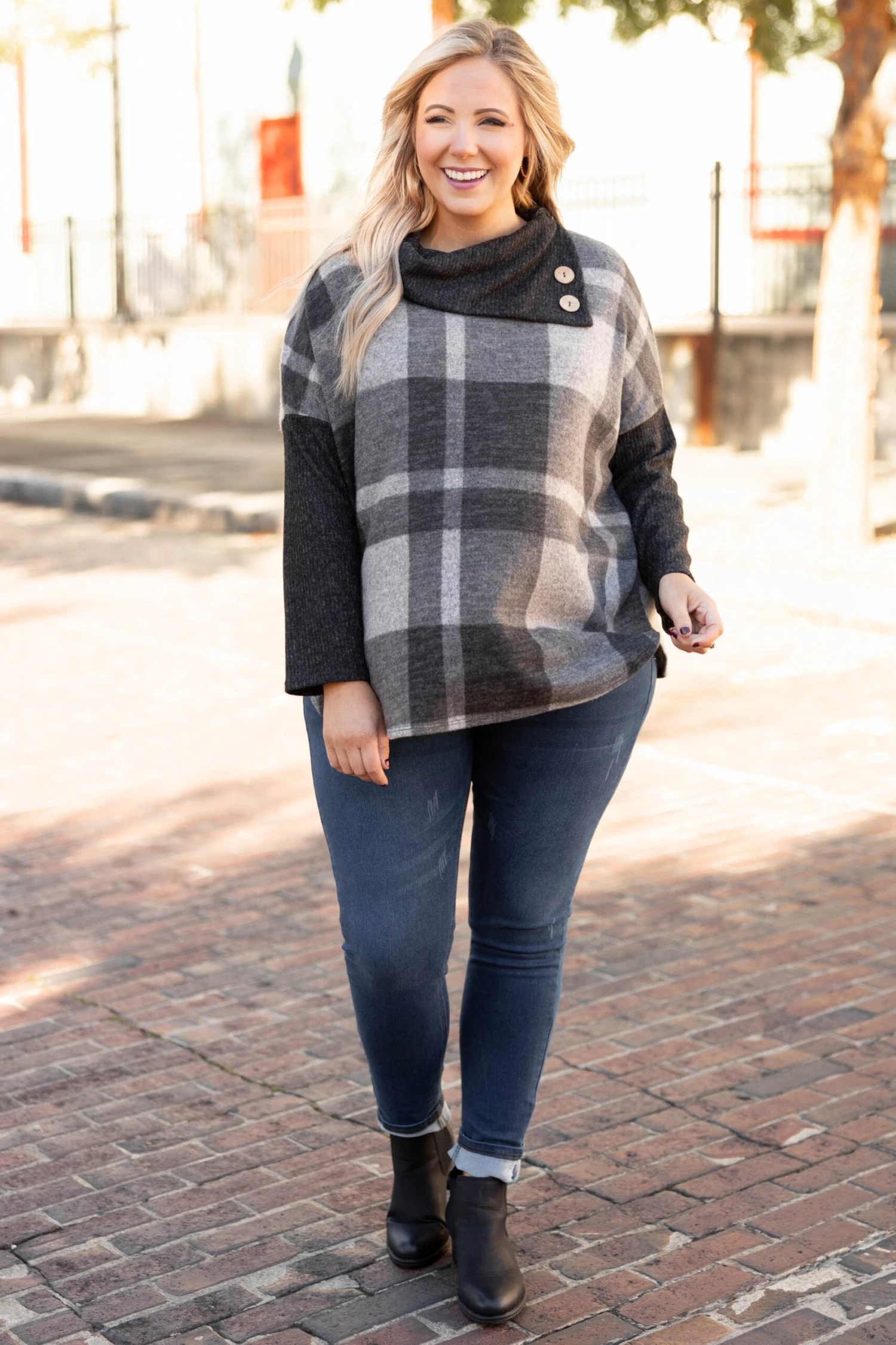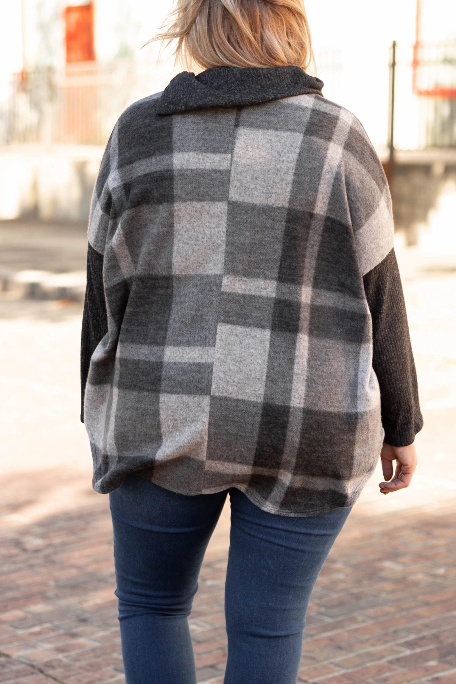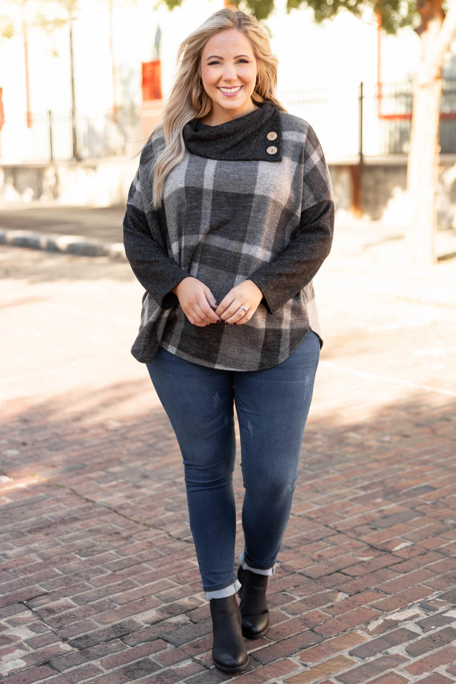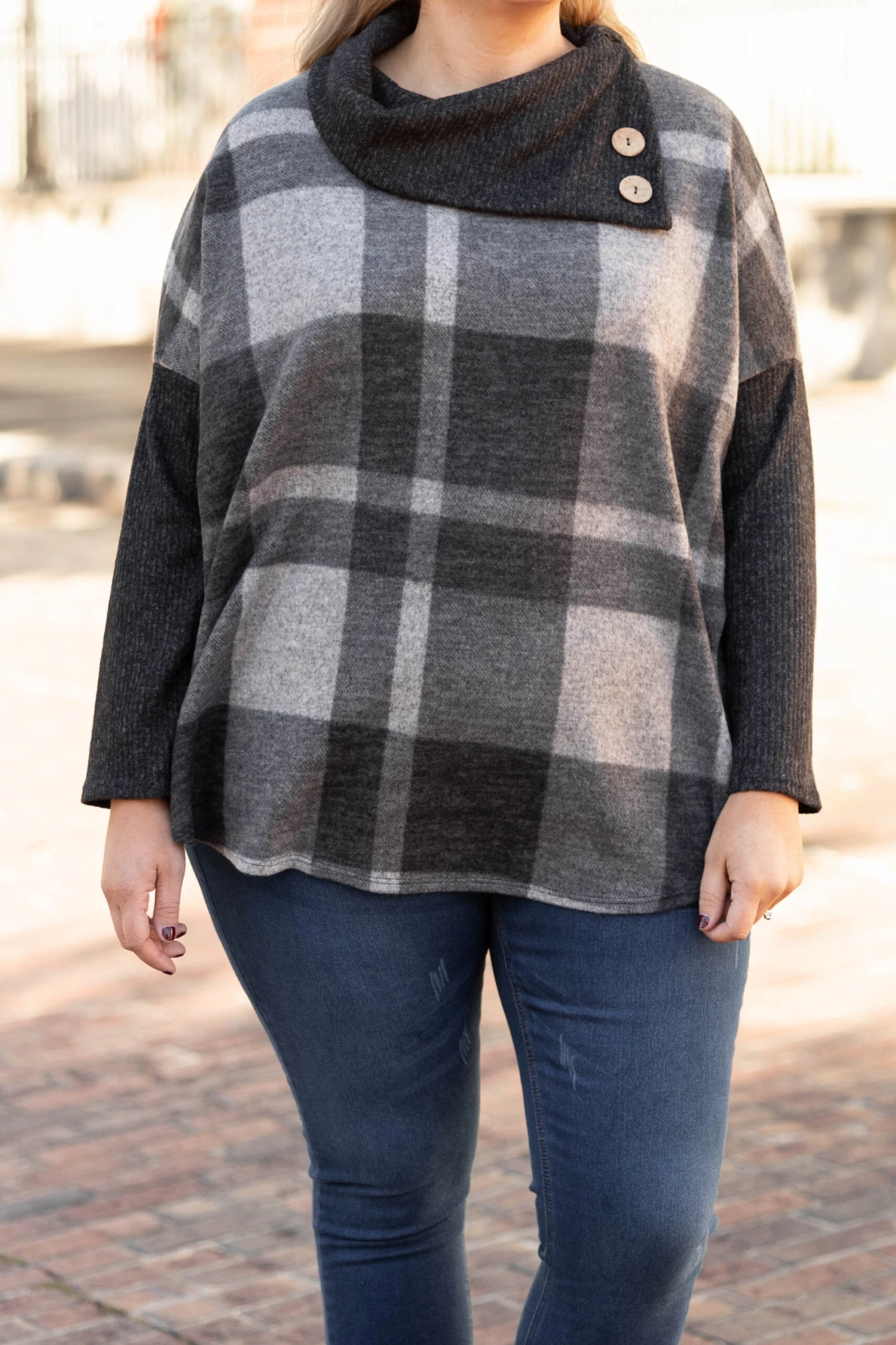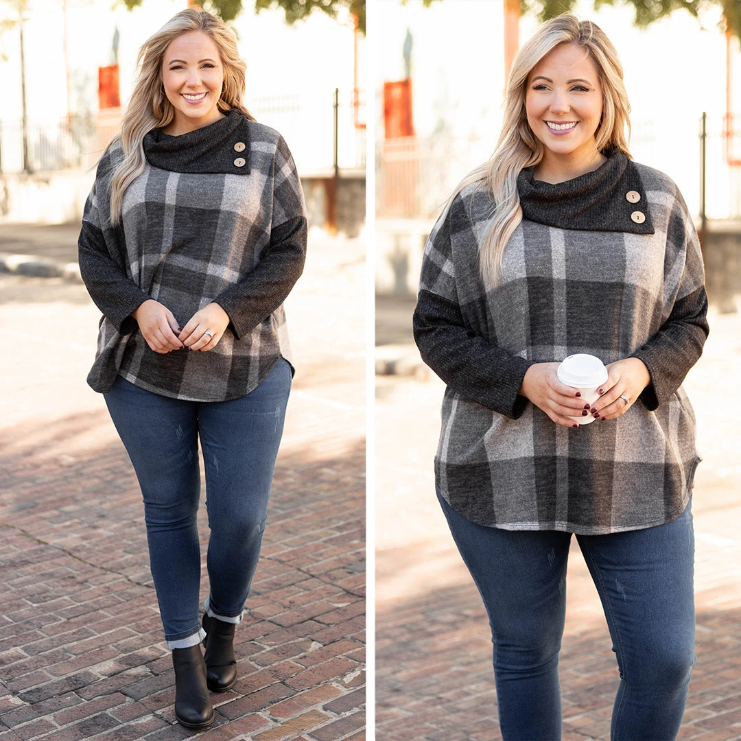 This sweater is just beautiful! It has a chic plaid print with neutral colors you can style for every occasion! It’s comfortable for all-day wear, has an oversized fit, and features the cutest turtle neck! Style this sweater with leggings or skinnies for an effortlessly trendy outfit!