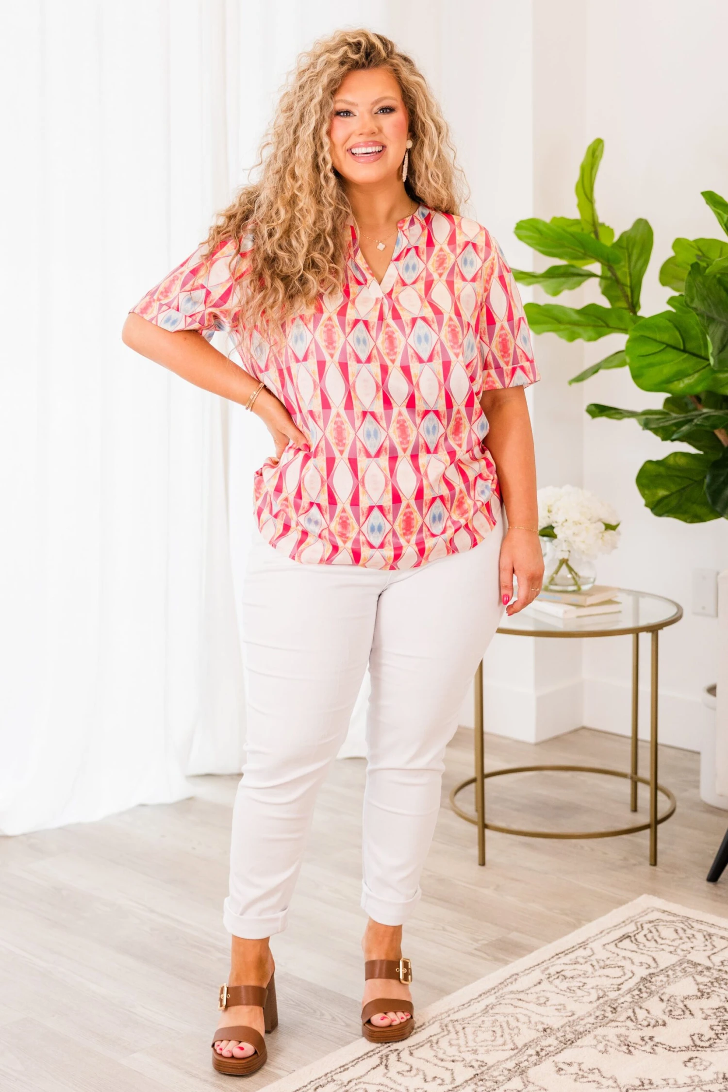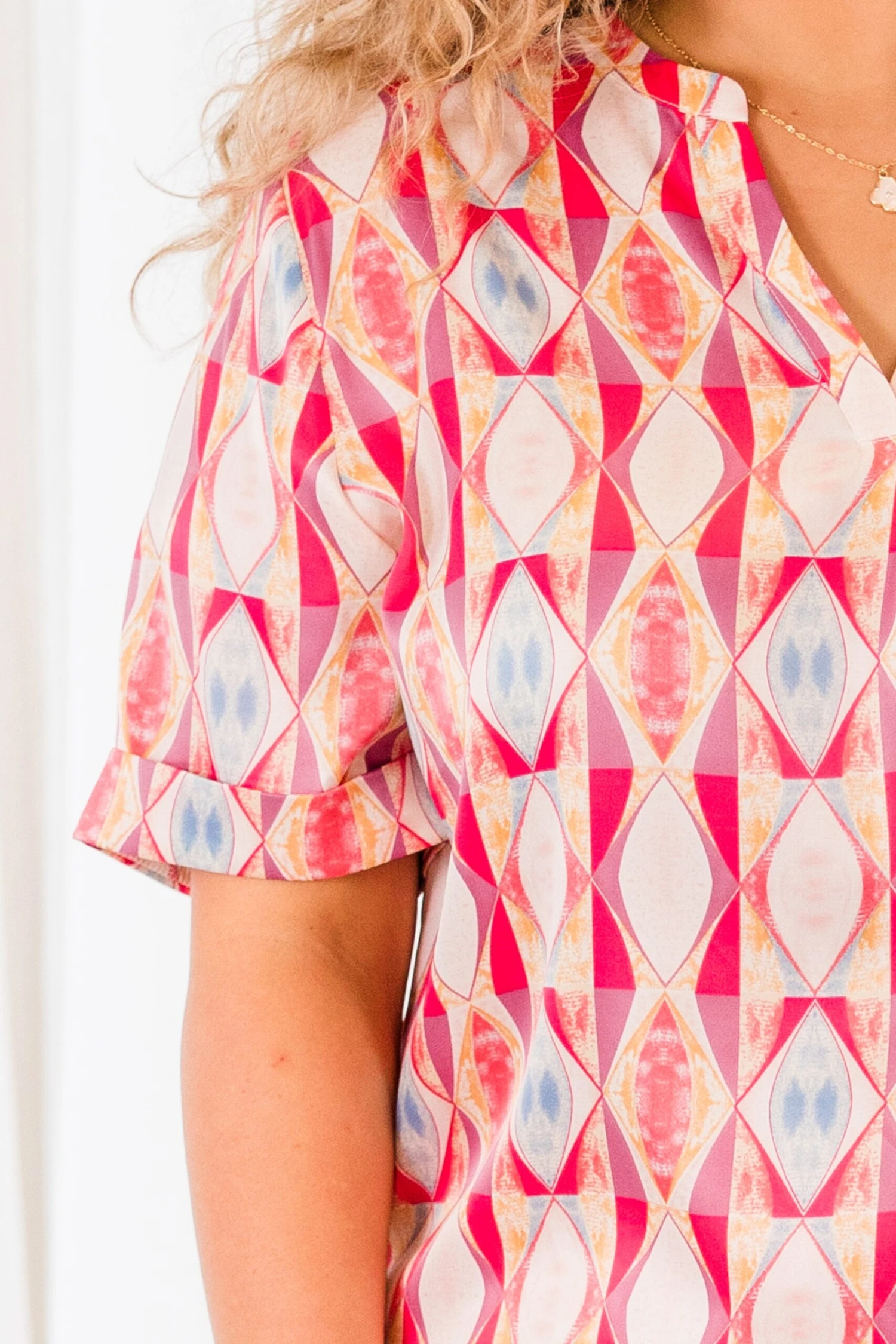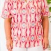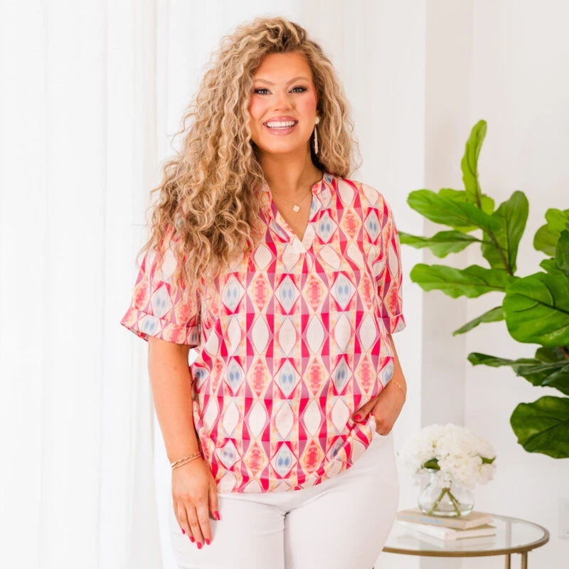 Stay stylish this spring with our Days Of Spring Top! Featuring a beautiful geometric pattern and a mix of pretty pink colors, this top is perfect for both the office and a day out! Elevate your wardrobe with this versatile and eye-catching top!