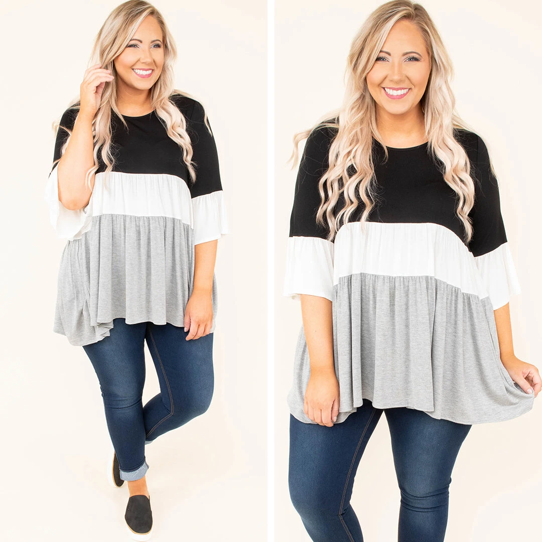 In this top, you’re guaranteed to meet your future husband! This top has a fun and flirty fit with a baby doll design that will both keep you comfortable while flattering your figure! Its neutral color block pattern is easy to style with your favorite shoes and accessories for a look you can wear everywhere! Pair this top with skinnies and a long necklace for an effortlessly chic look!