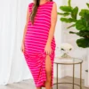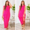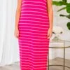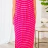 Did someone say stripes?! This dress is a stylish maxi dress with a contemporary fuchsia stripe pattern! Crafted from stretchy material, this dress is perfect for a day at the beach, as its comfortable enough to move and play in! Enjoy the perfect summer look with this flattering maxi dress!Â