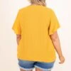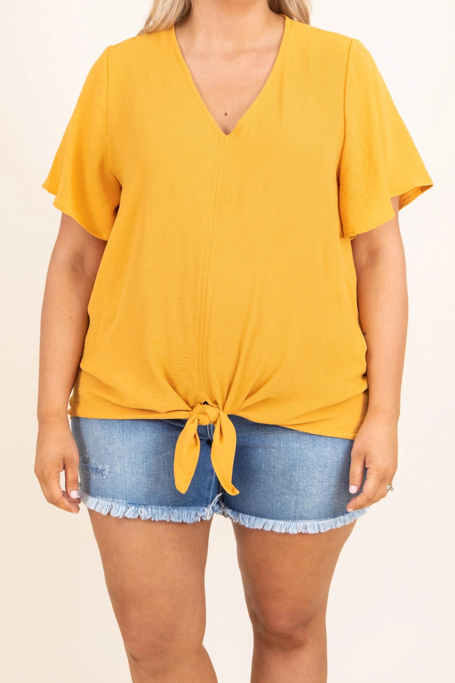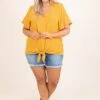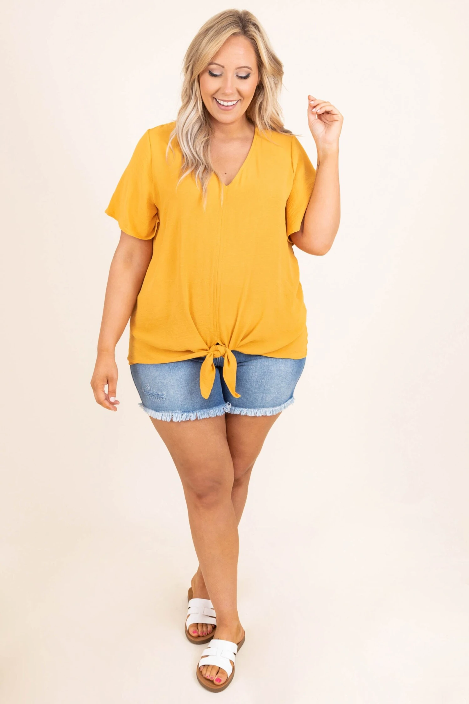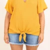 This top will have you in style all season long! The honey yellow color is so pretty and the knotted hem is so stylish! We love the flirty v-neck and the way this is so easy to dress up or down! We love it with some jean shorts and sandals for the perfect look!