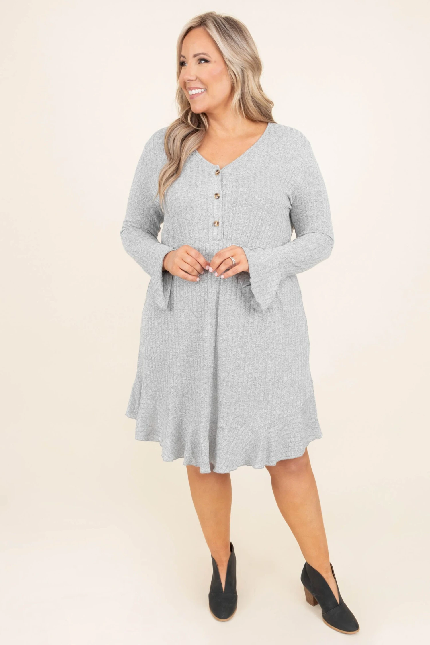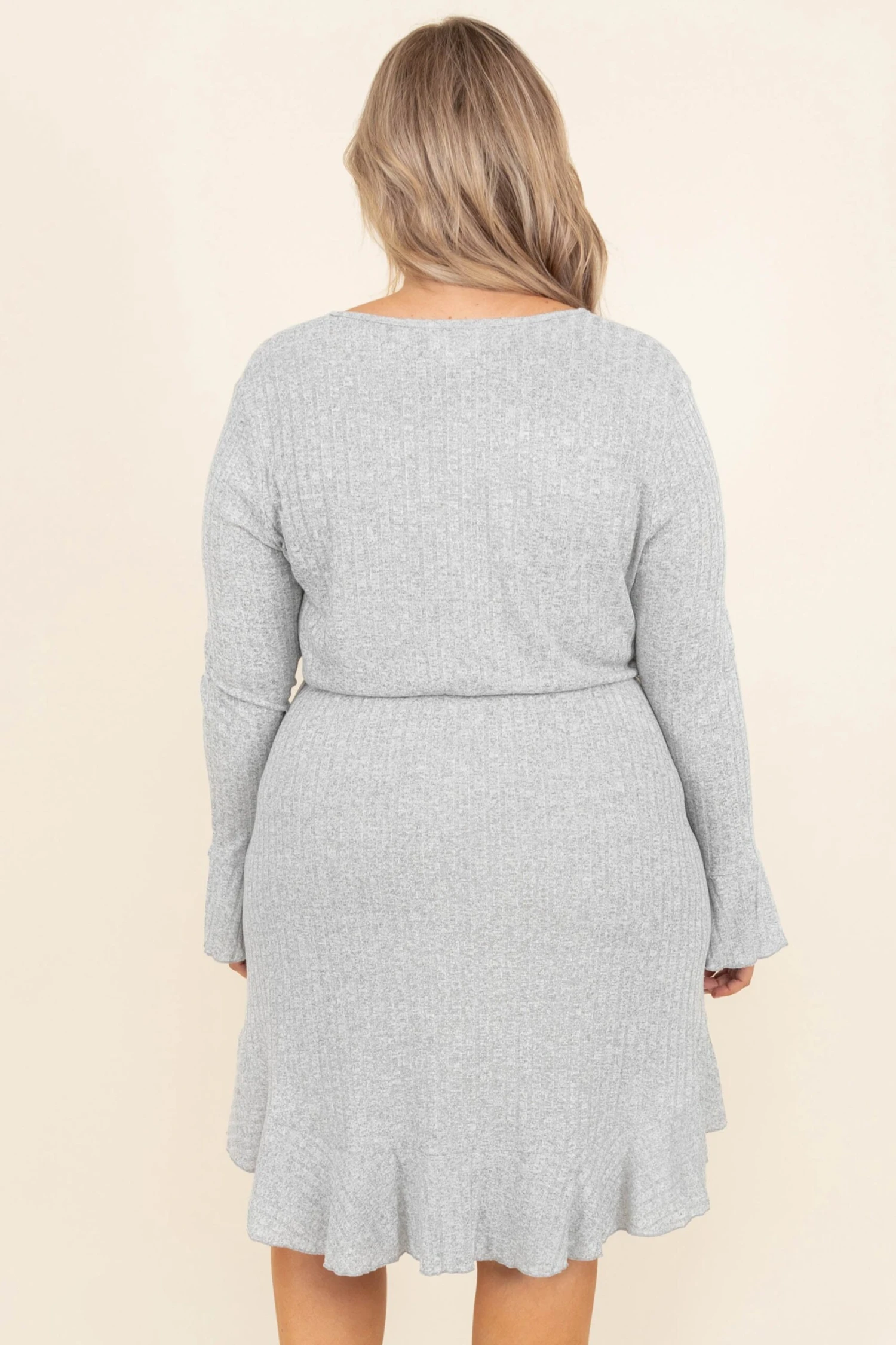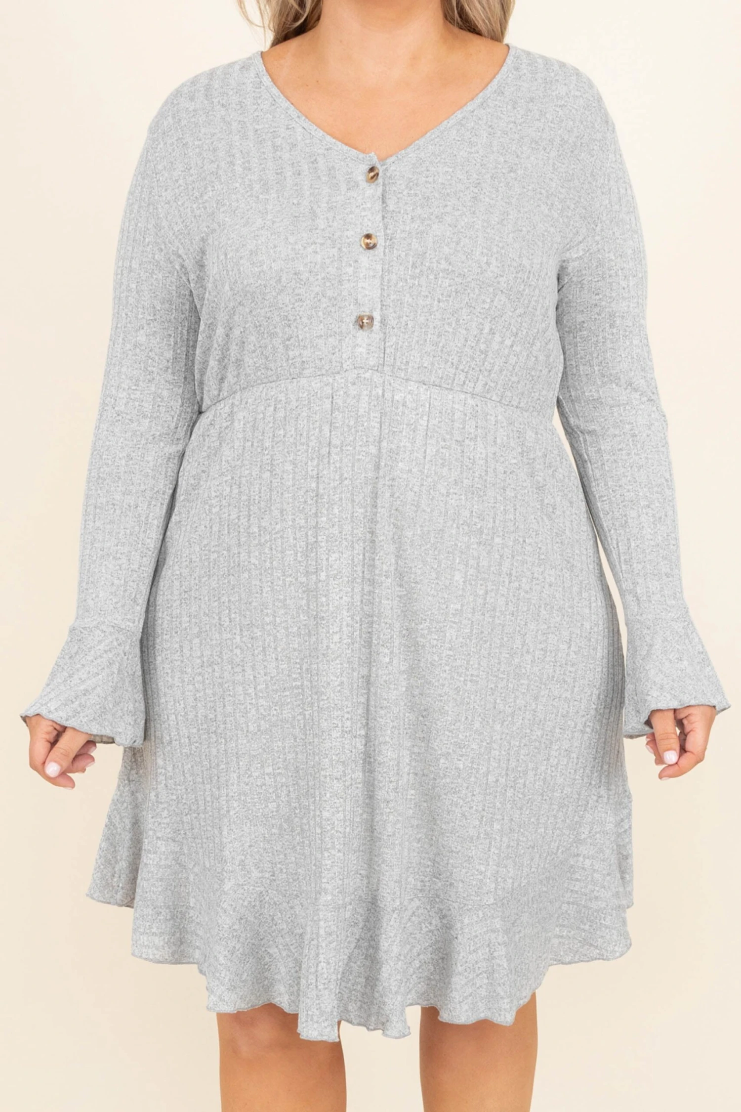 The elegance of this dress is so divine! This dress has a lovely grey color and a ribbed material that is perfect for the season! The bell sleeves and ruffled hemline is super trendy! Grab this cutie for an every day chic look!
