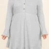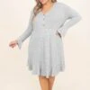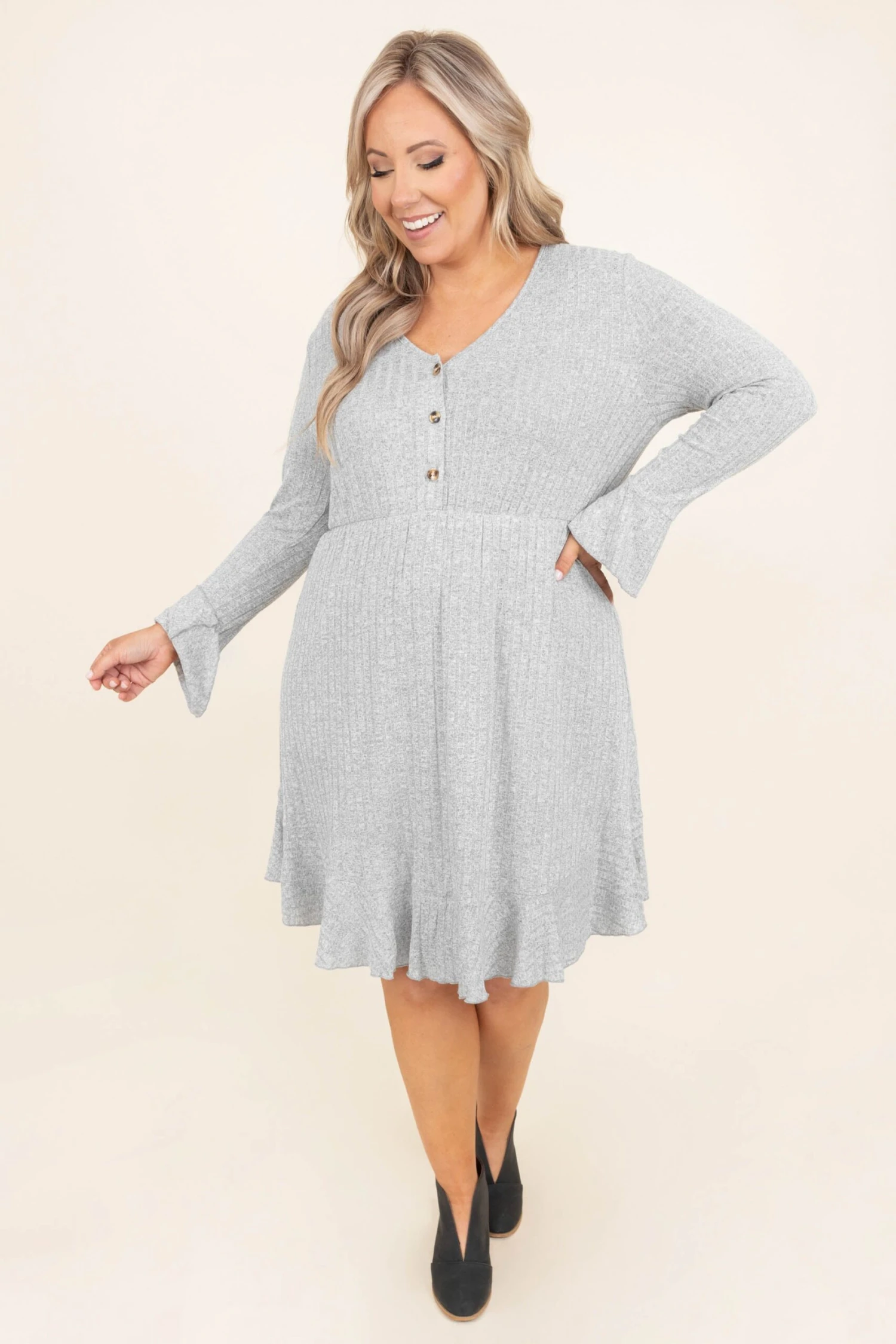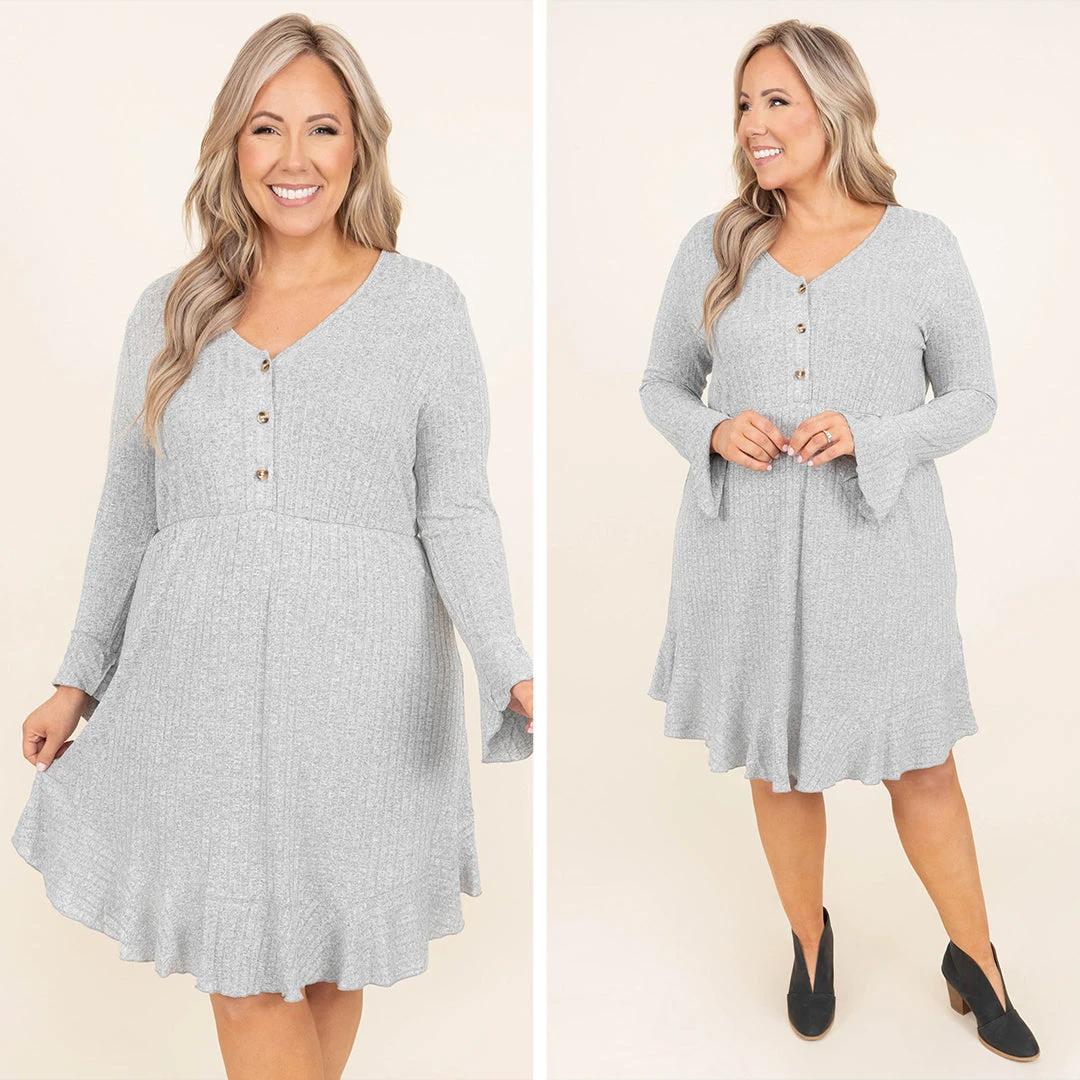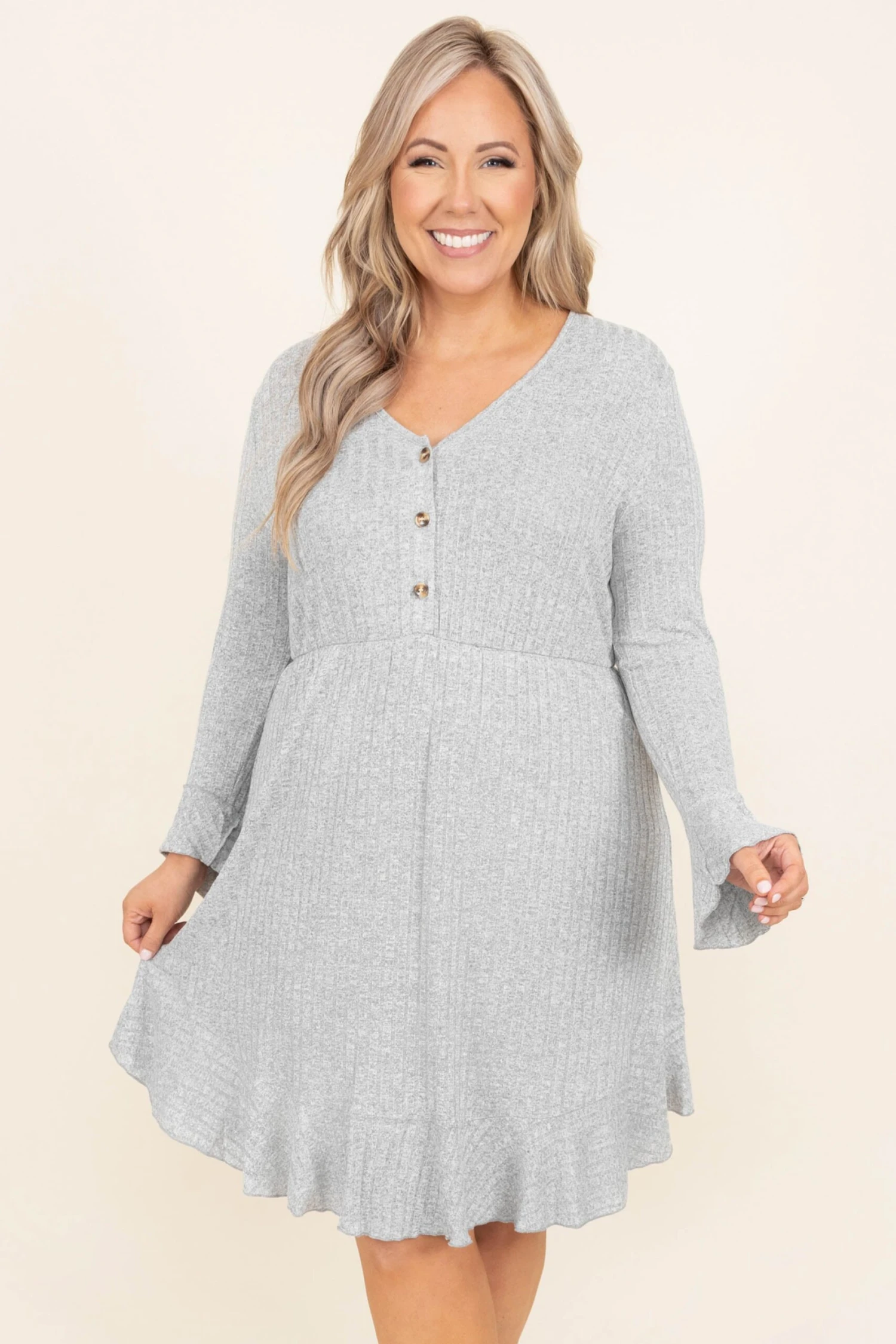 The elegance of this dress is so divine! This dress has a lovely grey color and a ribbed material that is perfect for the season! The bell sleeves and ruffled hemline is super trendy! Grab this cutie for an every day chic look!