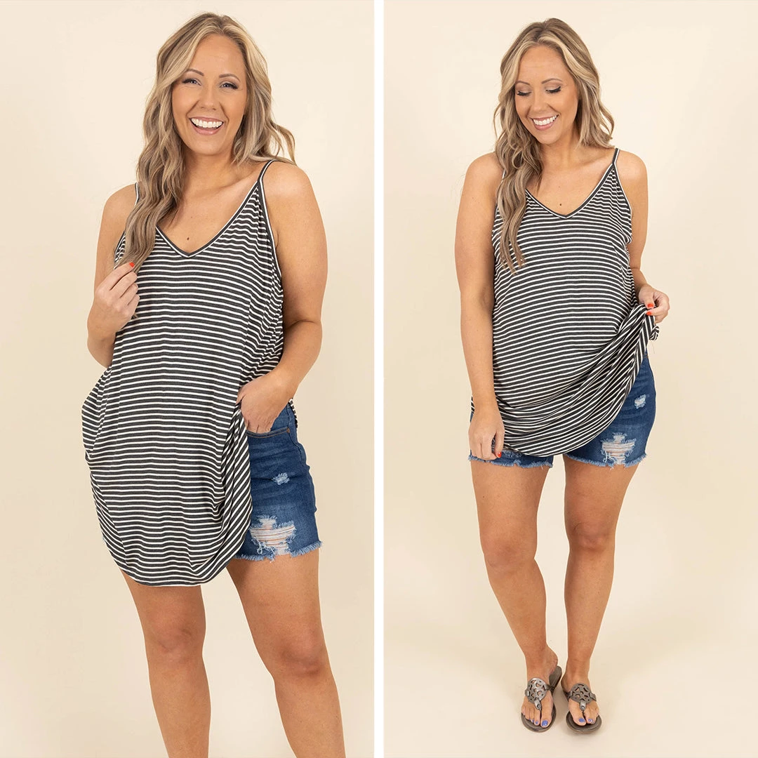 This tank is truly unforgettable! It features a unique stripe pattern and spaghetti straps for a fashionable and comfortable look! This charcoal ivory tank is perfect for paring with skinnies or shorts for a classic summer look!