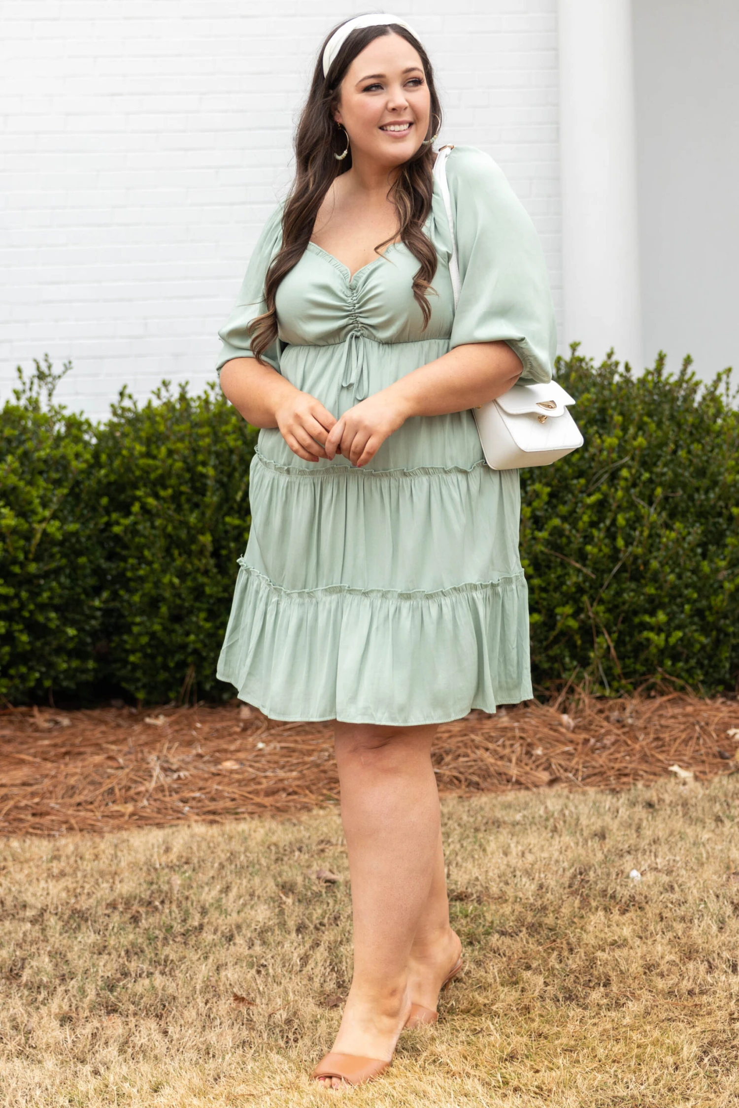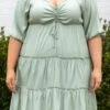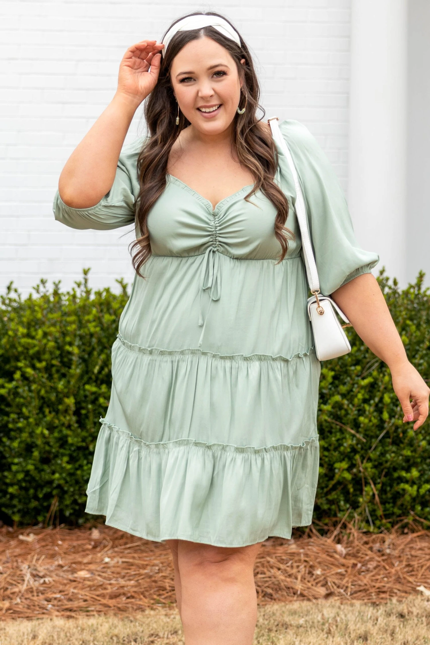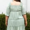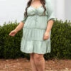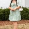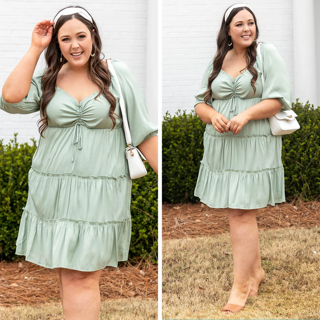 Don’t you love how cute this dress is! The pistachio color is perfect for spring and the cinched bust with a tie is so cute! The loose, flowy, tiered style is so flattering on everyone and the bubble sleeves are so sweet! Style this cutie with some neutral heels and a fun accessory for the perfect look!