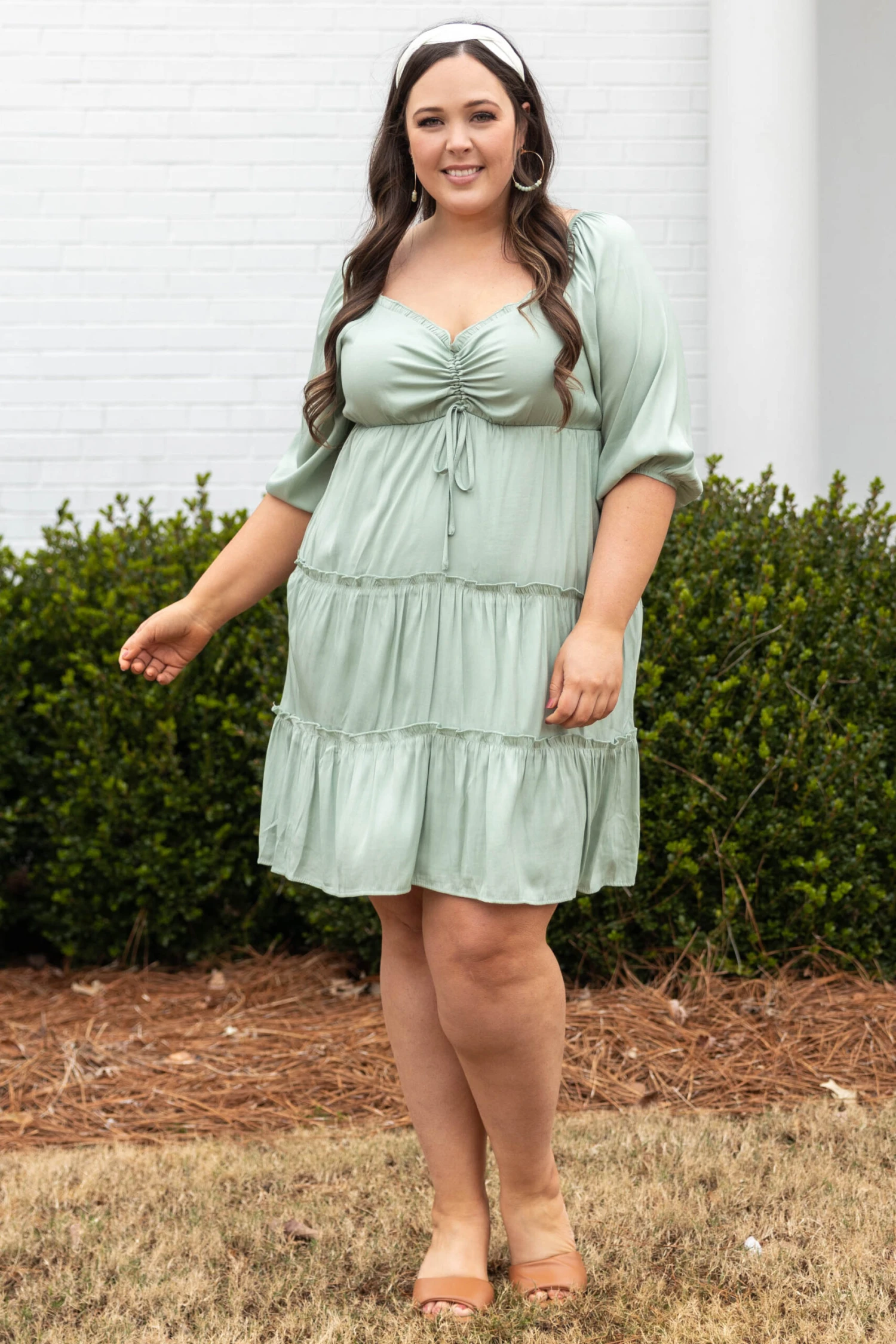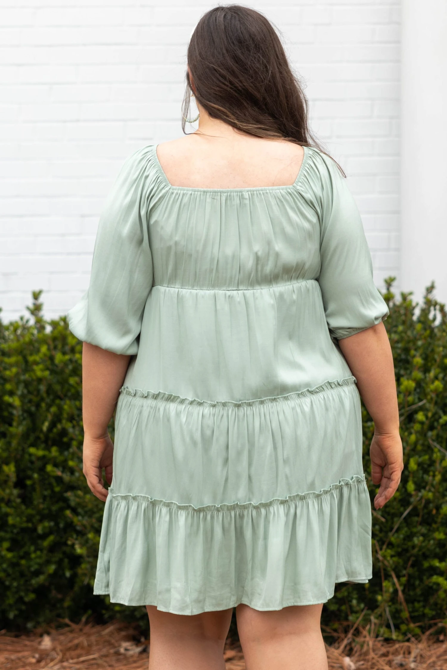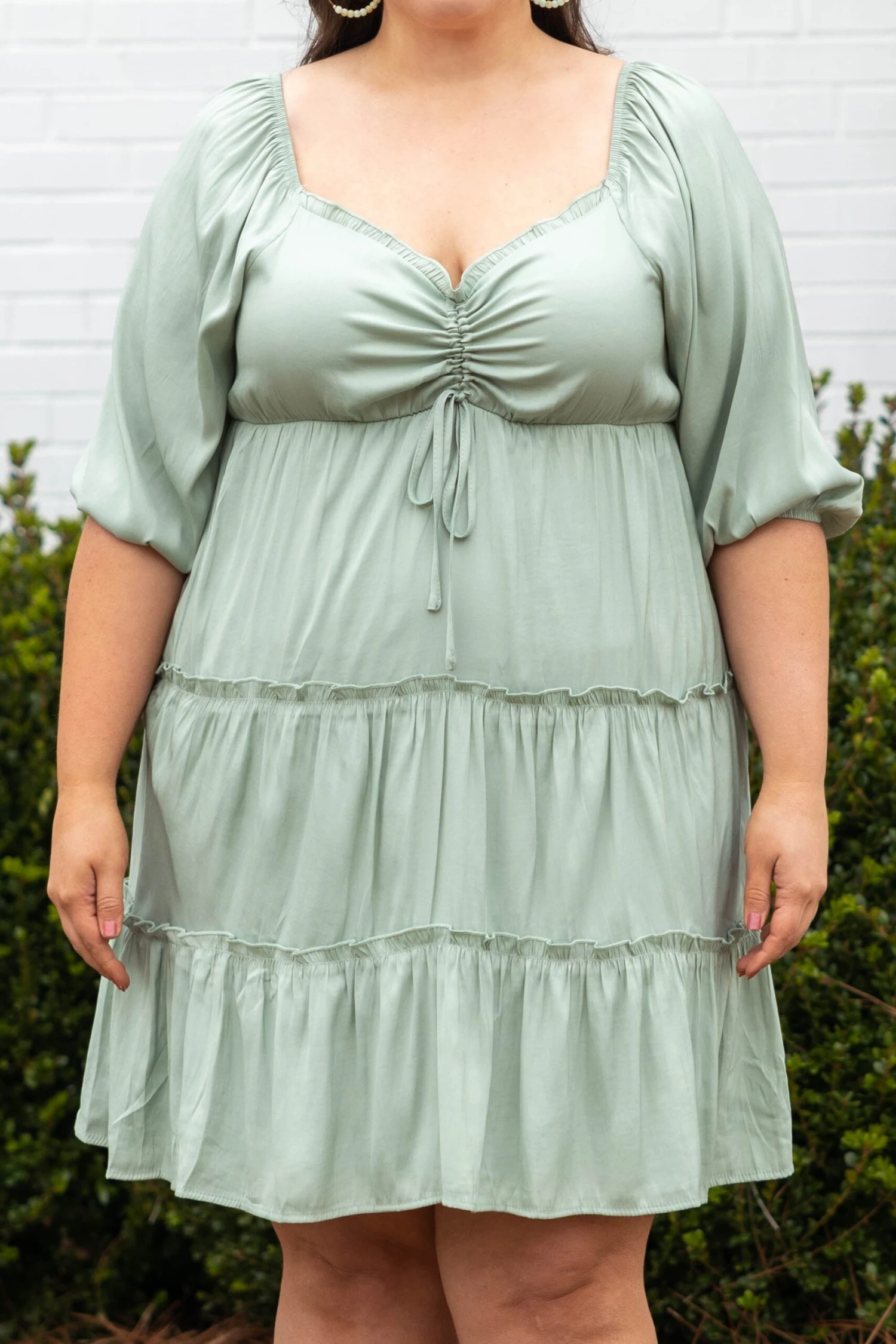 Don’t you love how cute this dress is! The pistachio color is perfect for spring and the cinched bust with a tie is so cute! The loose, flowy, tiered style is so flattering on everyone and the bubble sleeves are so sweet! Style this cutie with some neutral heels and a fun accessory for the perfect look!