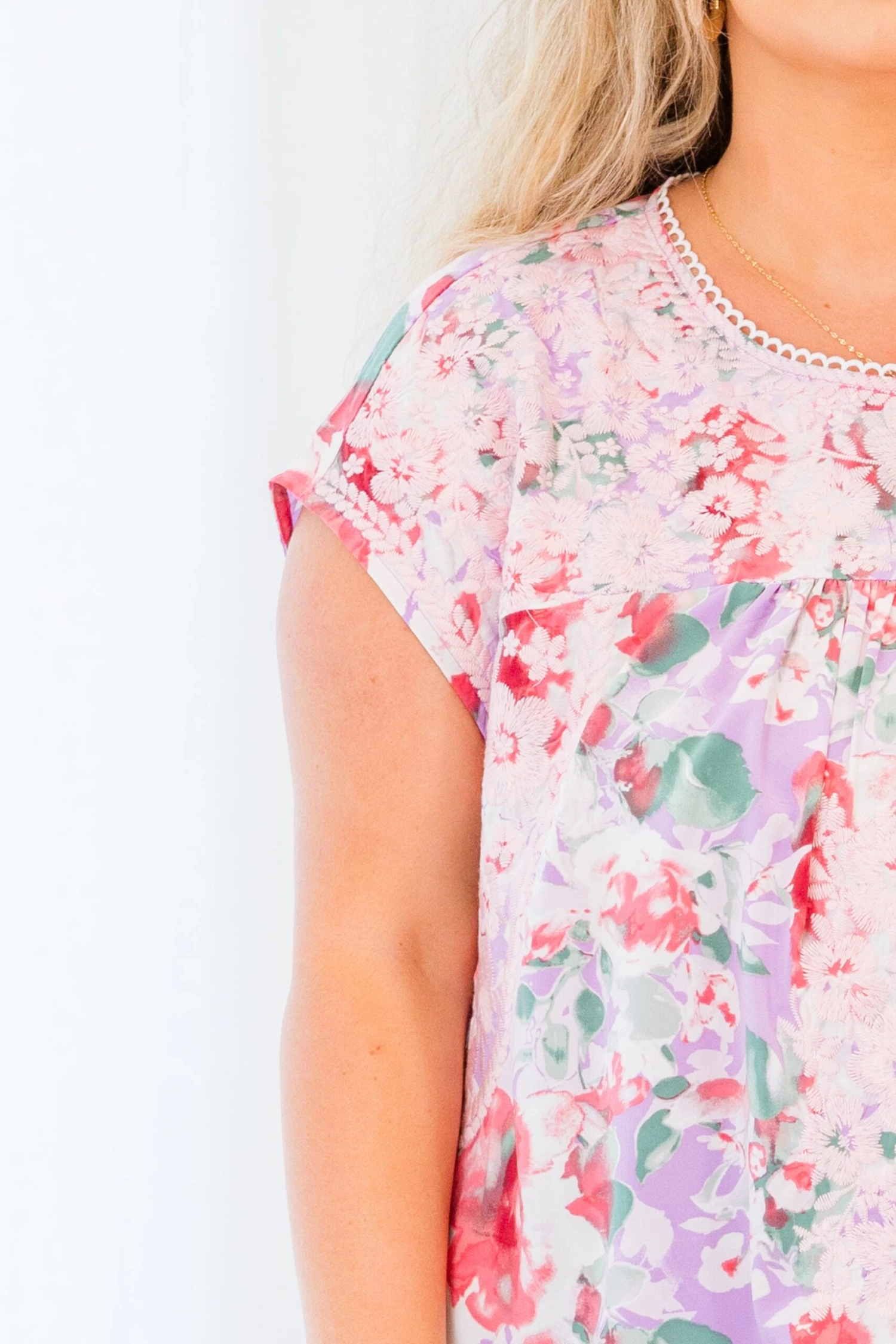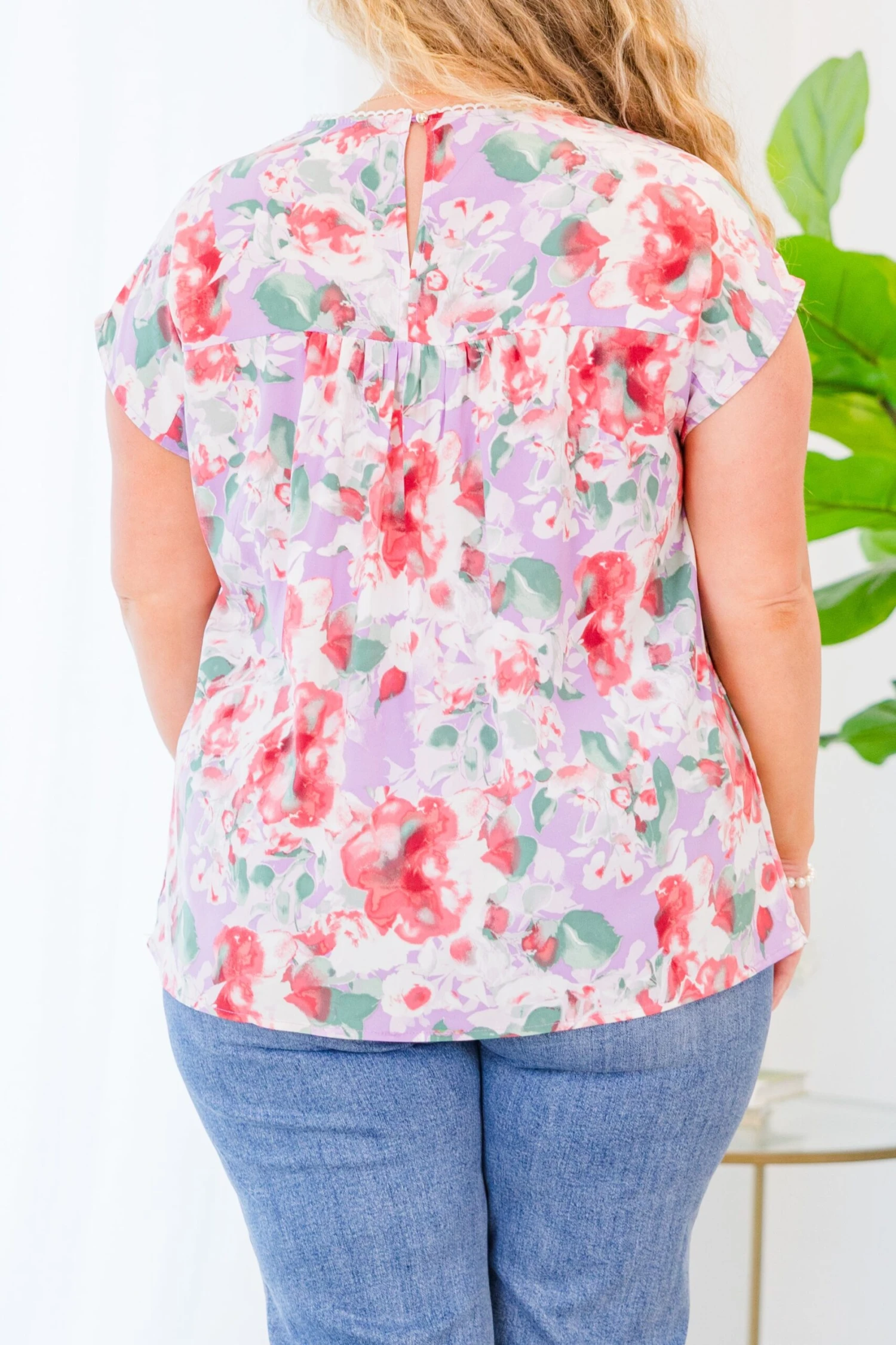 This Double Digits Top features a beautiful floral print and intricate pink embroidery adding a touch of femininity to your wardrobe! The soft lavender color pairs well with any outfit, making it a versatile piece for any occasion! Elevate your style with this elegant top!