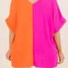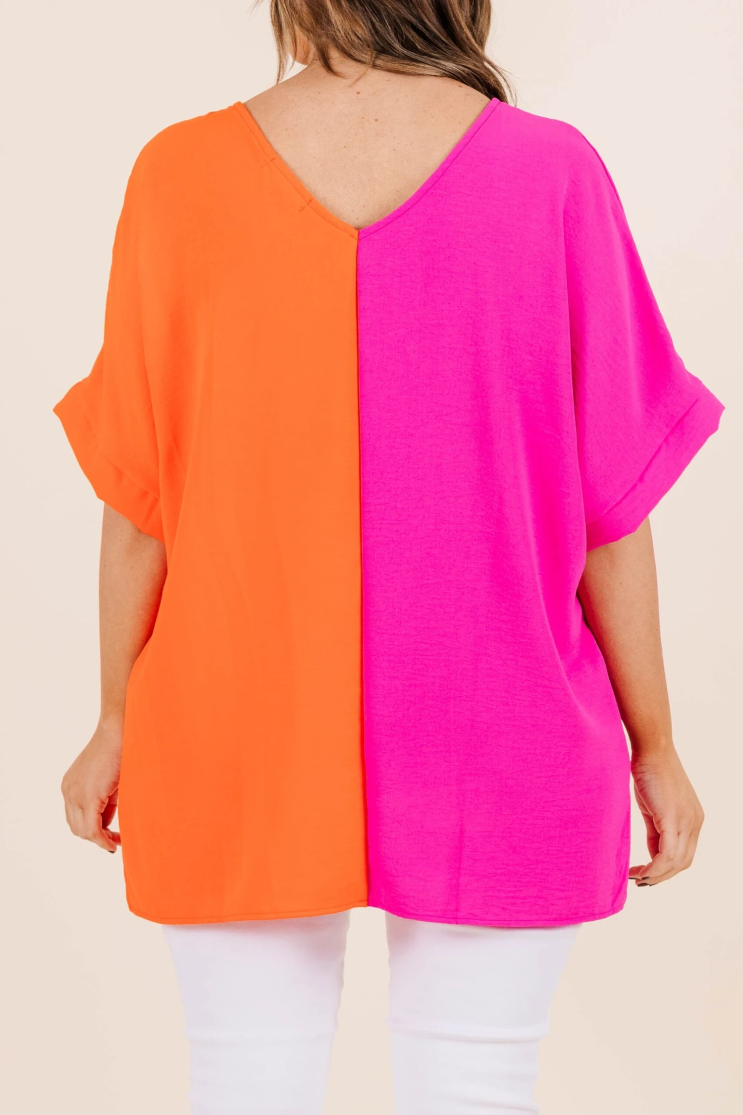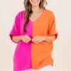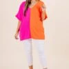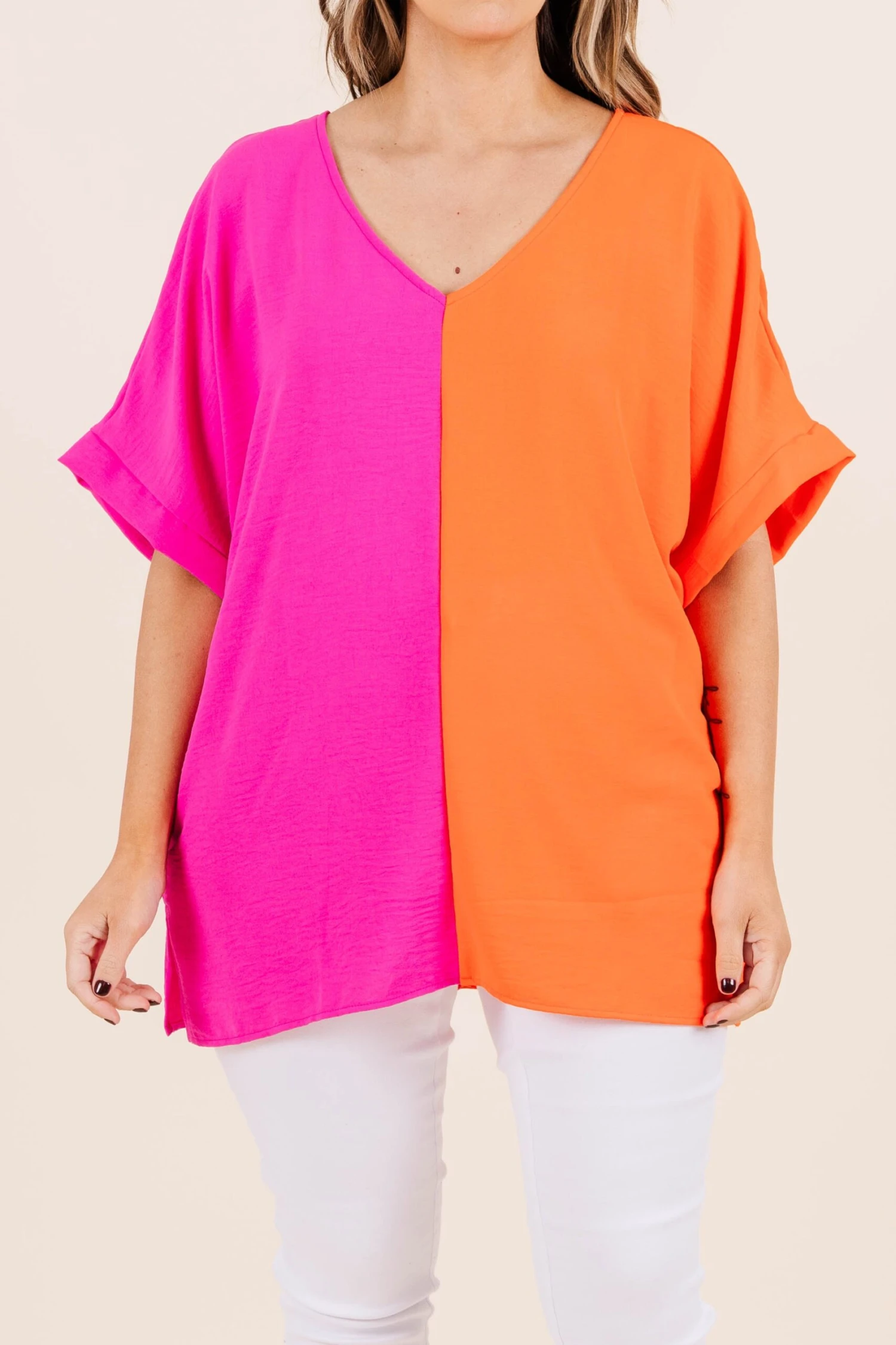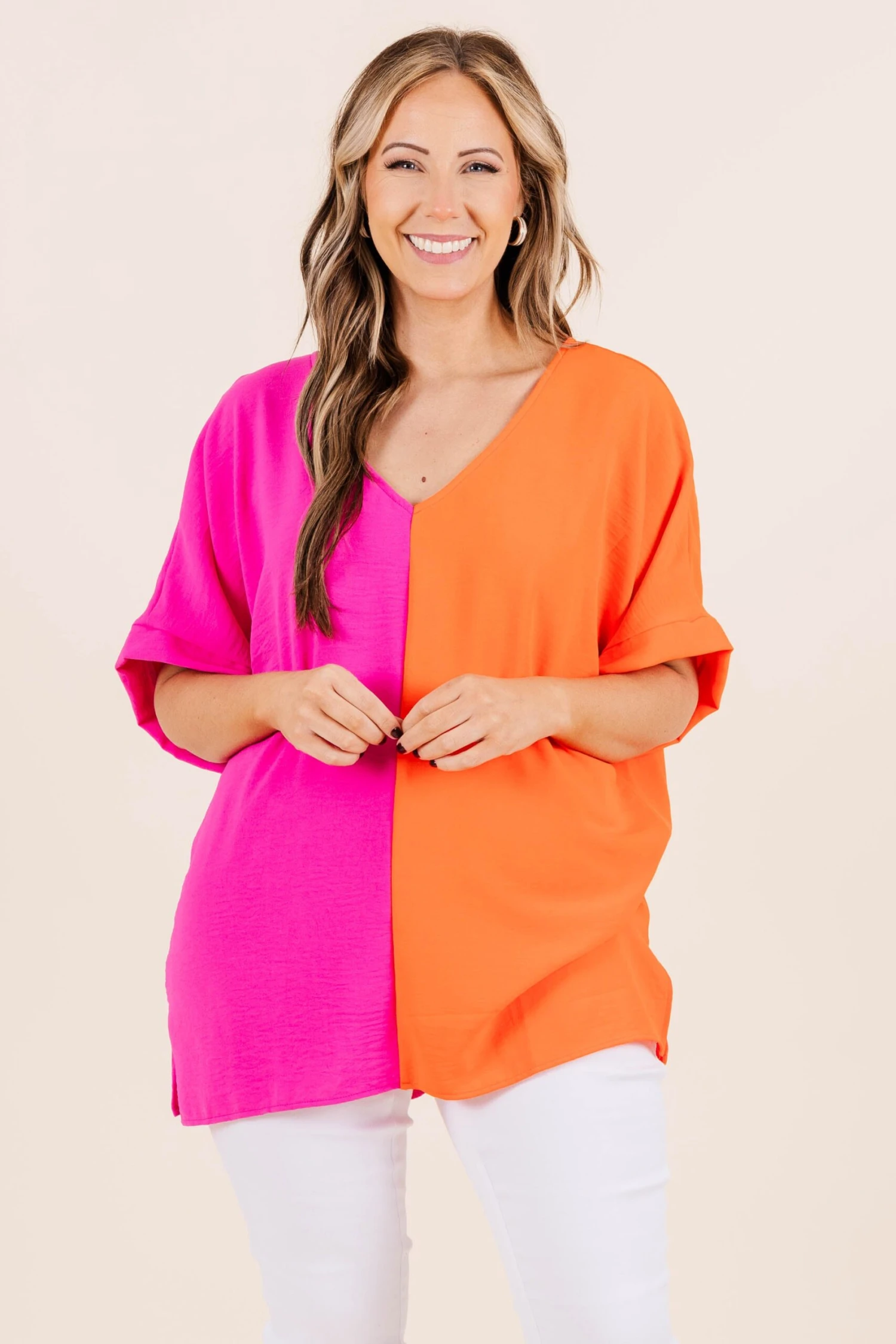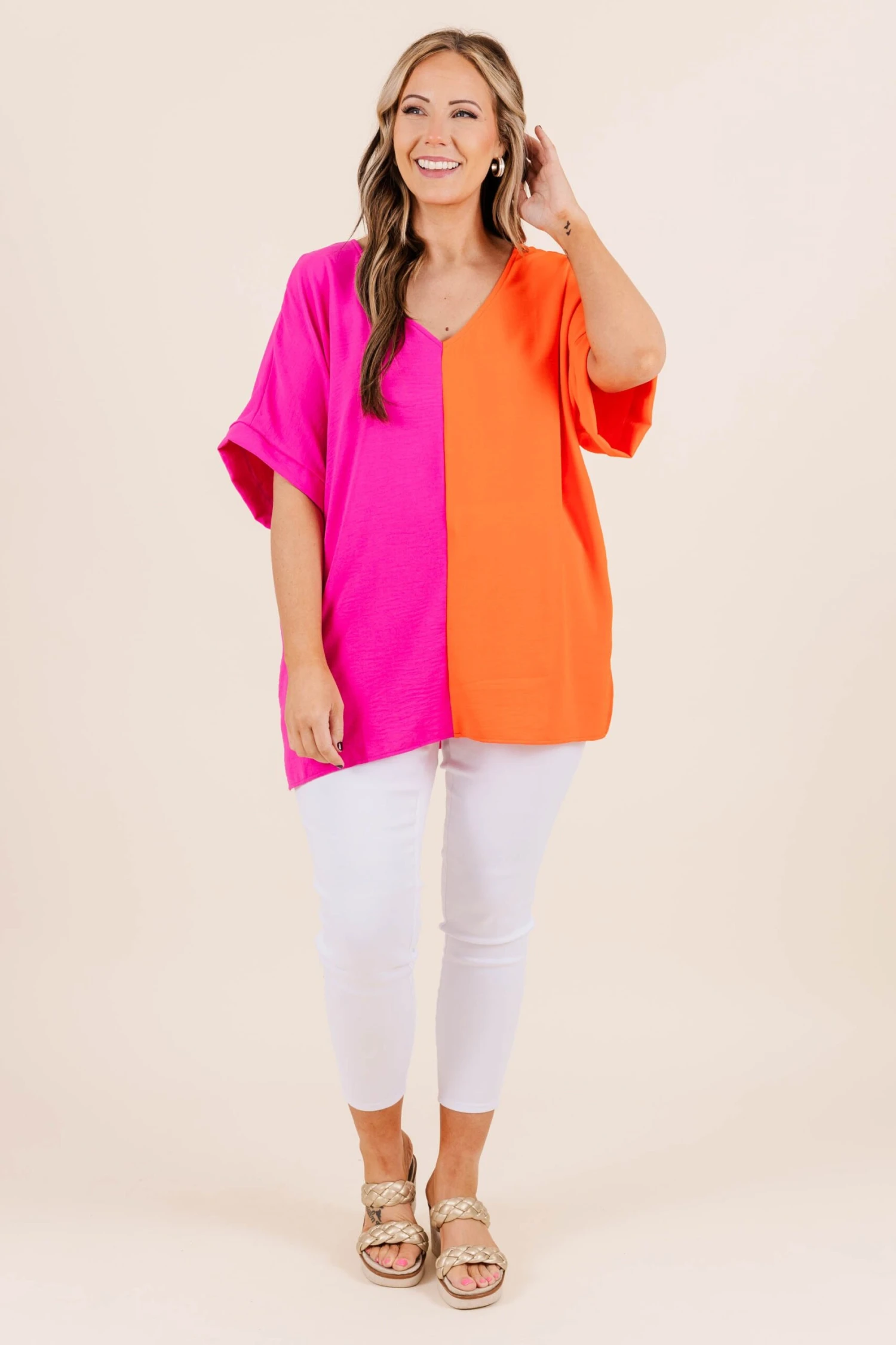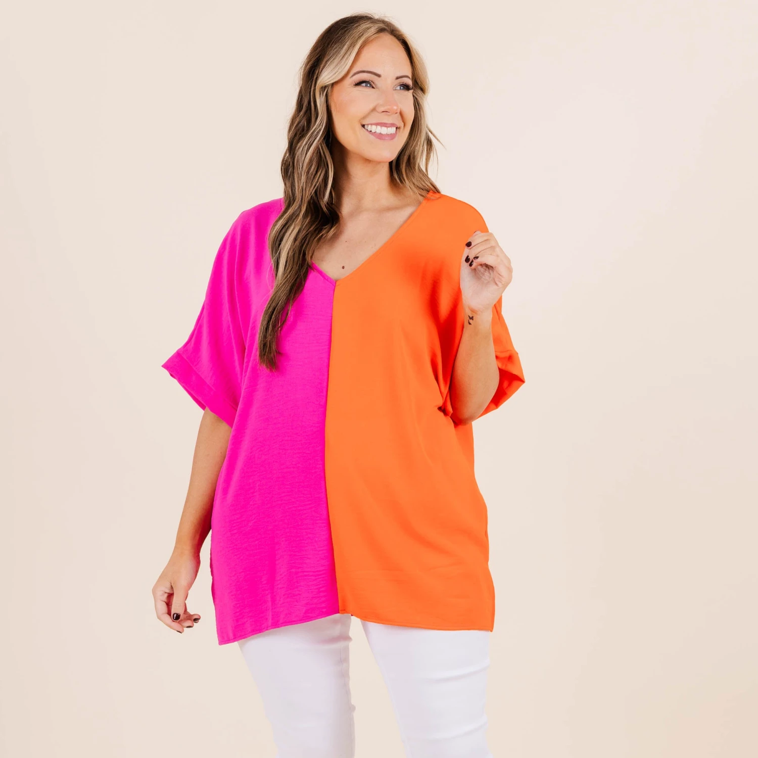 Get your double dose of color with this beauty! This top is the perfect blend of cute and comfortable perfect for all-day wear! The colorblock design paired with the hot pink and tomato colors are just what you need for the season. Style this top with some skinnies and heels for a classic, chic look!