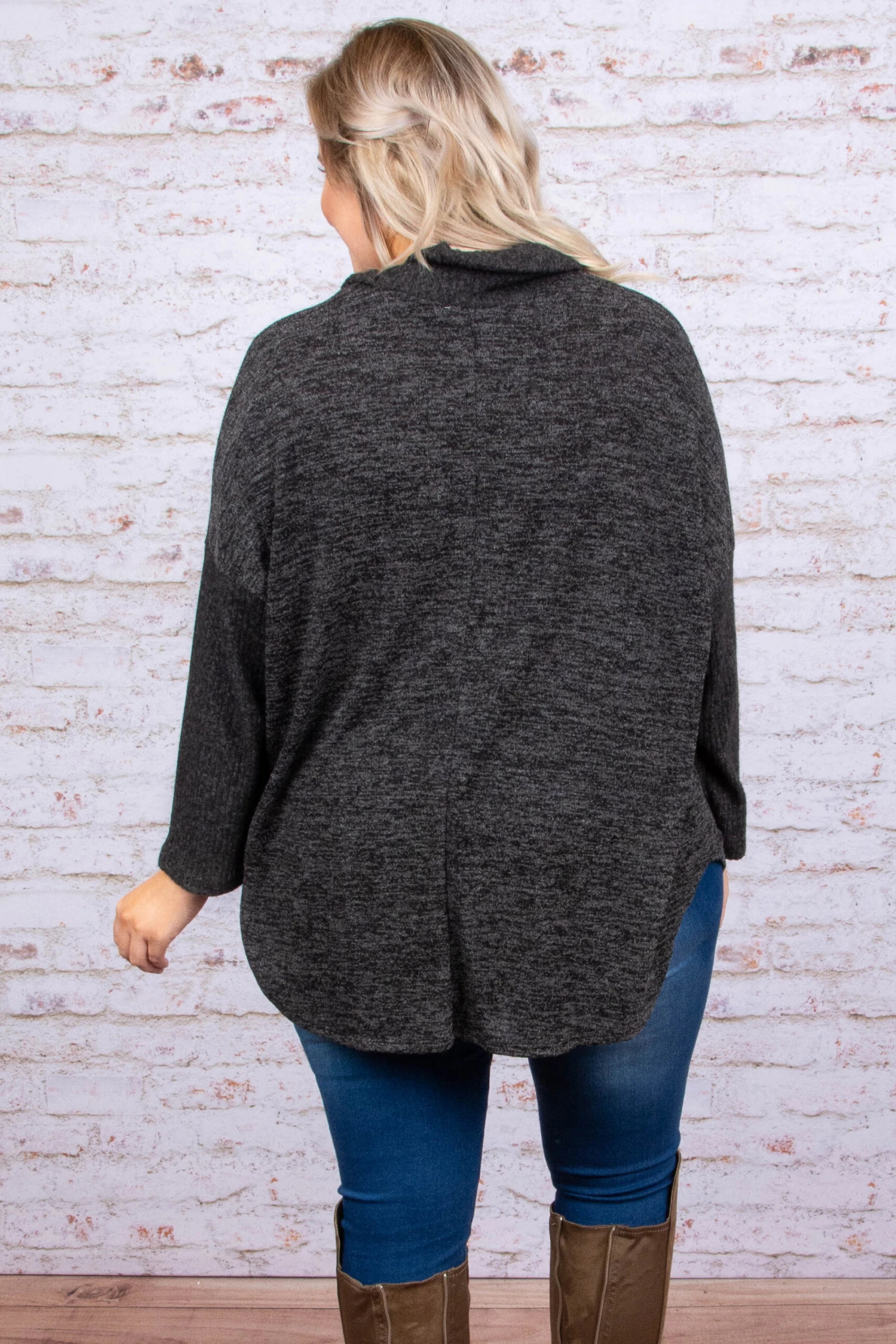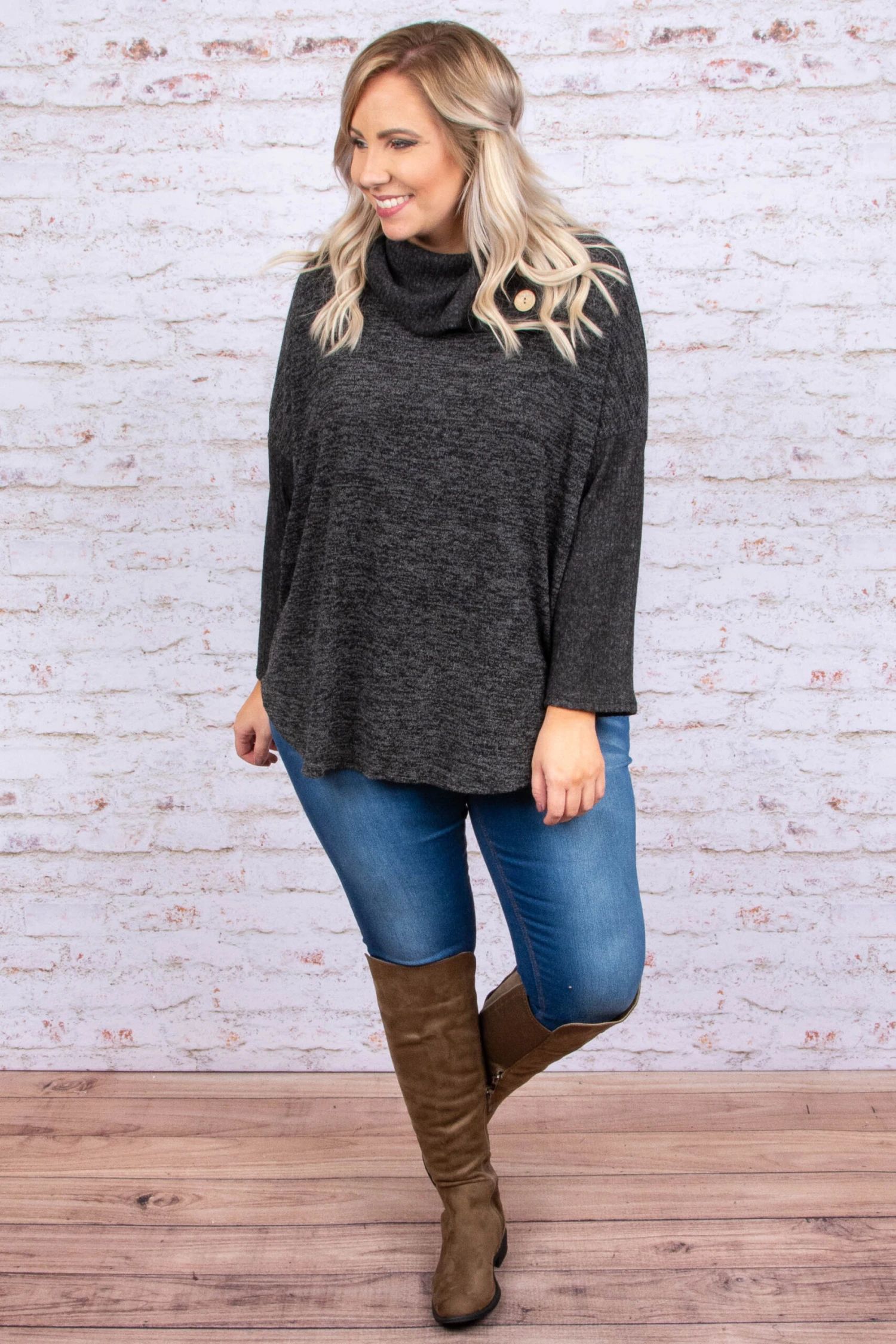You’ll be dreaming about this sweater! It has a cozy, comfy fabric and a beautiful charcoal color that is perfect for Fall! Oh and check out that cool button detail! Throw it on and add skinnies and booties for a stylish outfit!