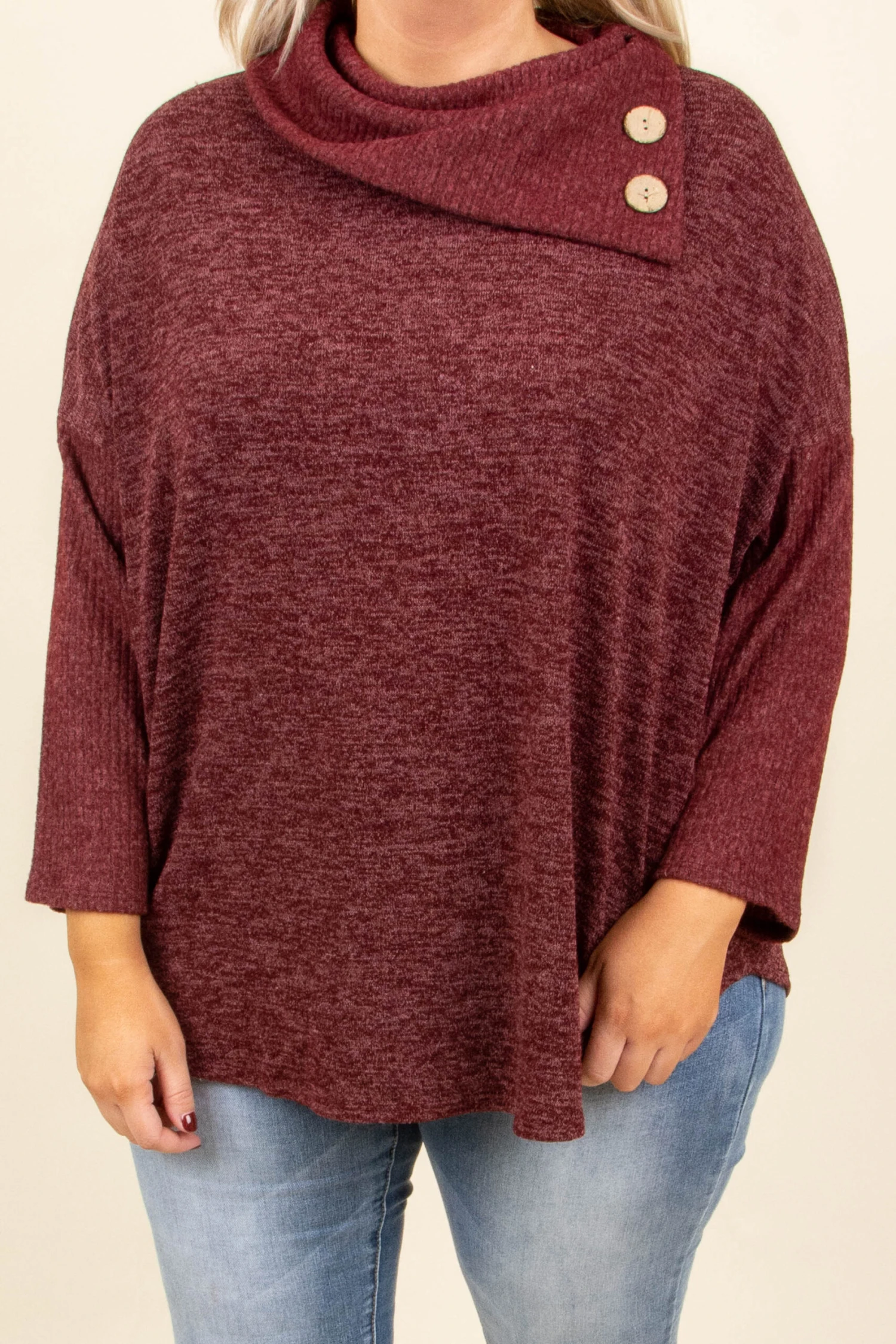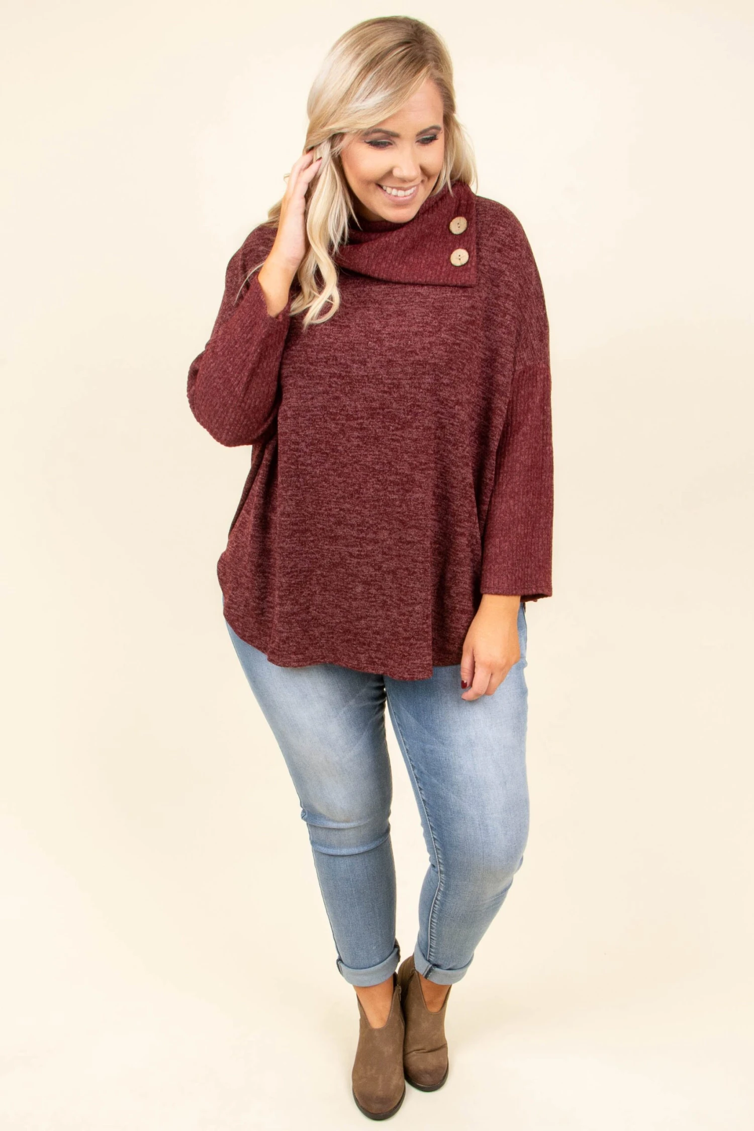 You’ll be dreaming about this sweater! It has a cozy, comfy fabric and a beautiful wine color that is perfect for Fall! Oh and check out that cool button detail! Throw it on and add skinnies and booties for a stylish outfit!