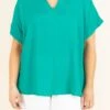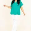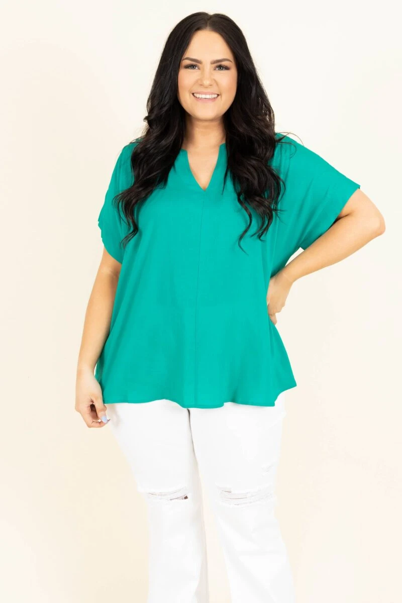 This top is so dreamy! The lovely emerald color is just in time for the season! The stretchy, figure flattering fit pairs well with all of your faves! We see this cutie styled with some distressed denim and heels for a sassy chic look!