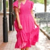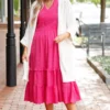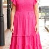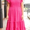 You will be dreaming of this dress! It is the perfect choice for any occasion. Crafted with a unique polka dot pattern and a fierce magenta color, it features a perfect midi length that will make you look stunning! This is a must-have dress for any fashionista!