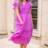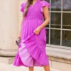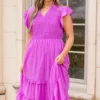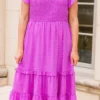 You will be dreaming of this dress! It is the perfect choice for any occasion. Crafted with a unique polka dot pattern and a fierce purple color, it features a perfect midi length that will make you look stunning! This is a must-have dress for any fashionista!