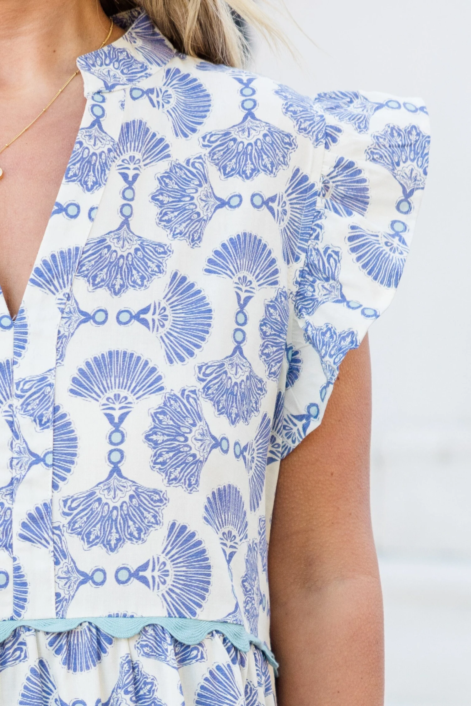 Indulge in the romantic vibes of the Dreams Of Us Dress! The split v-neck adds a touch of sophistication while the flutter sleeves bring a flirty and feminine feel! Also, who doesn’t love a dress with functional pockets? The blue and white fan print evokes feelings of wanderlust and the light blue ric rac detailing adds a charming touch!