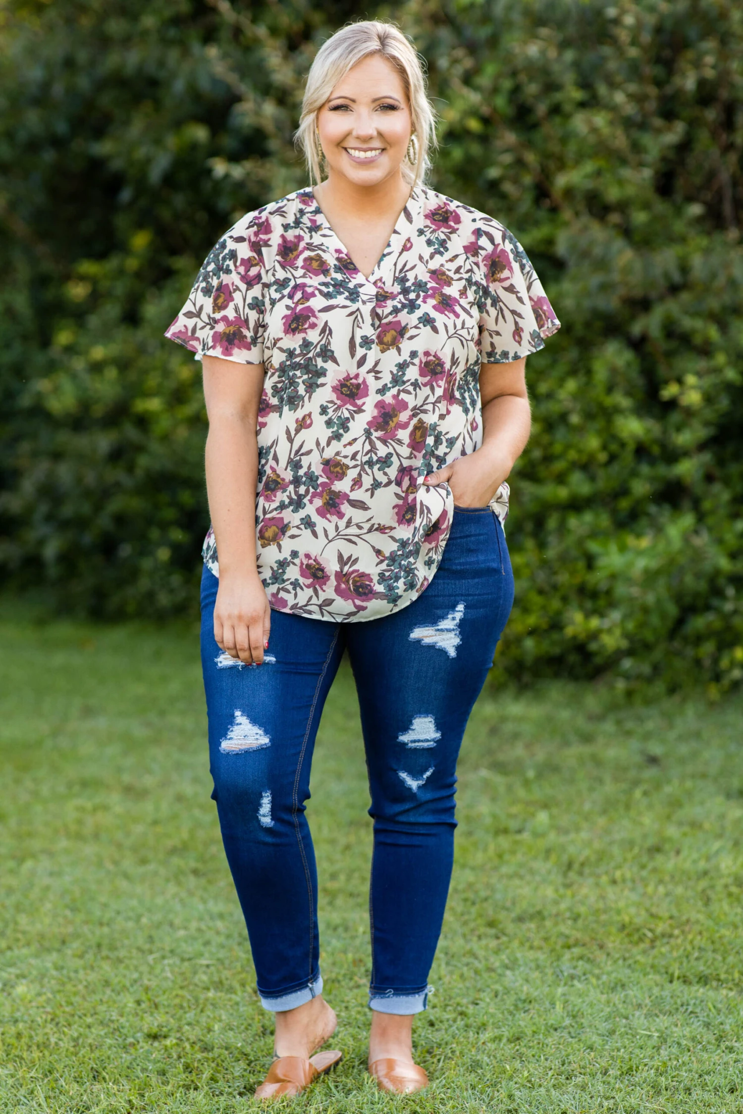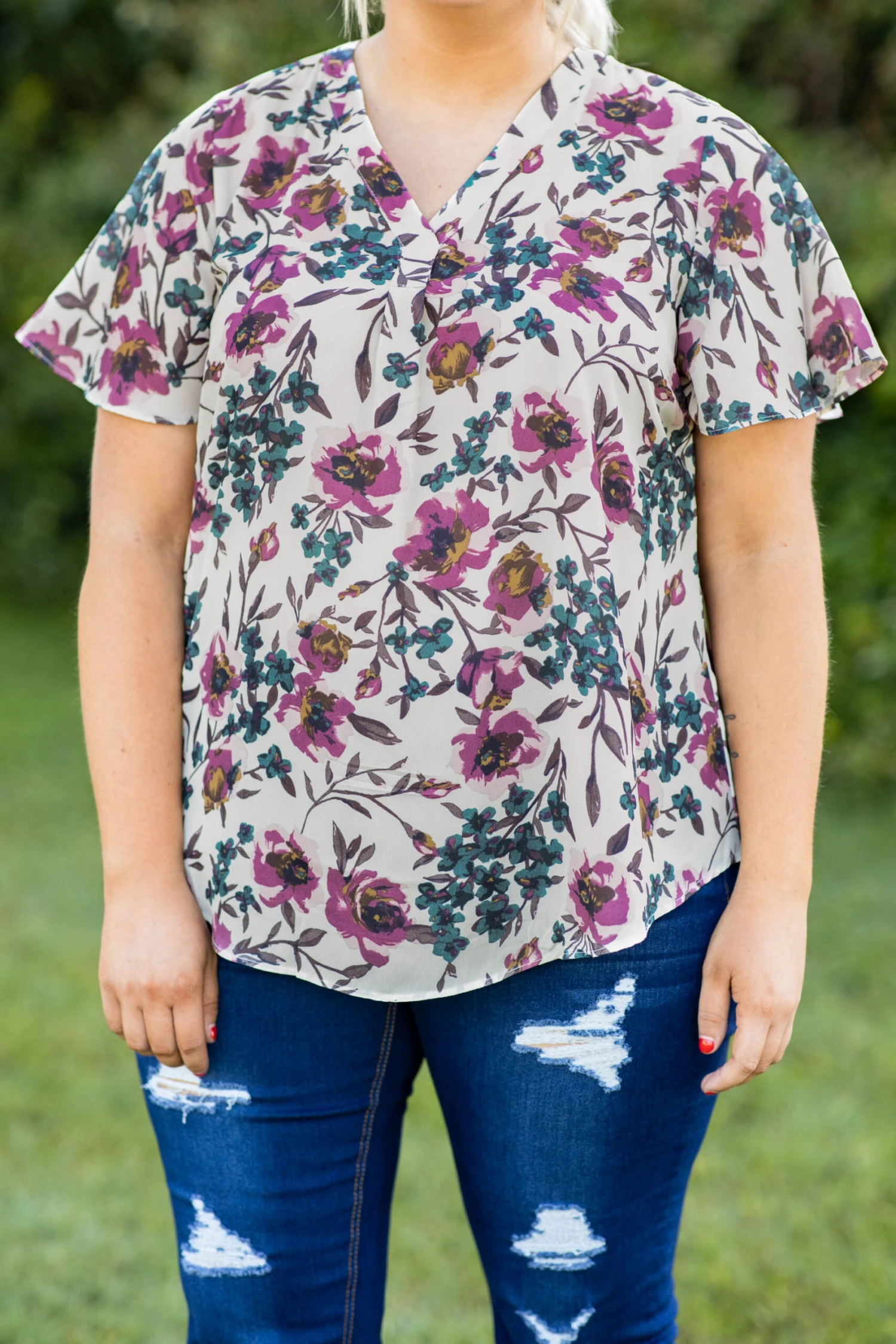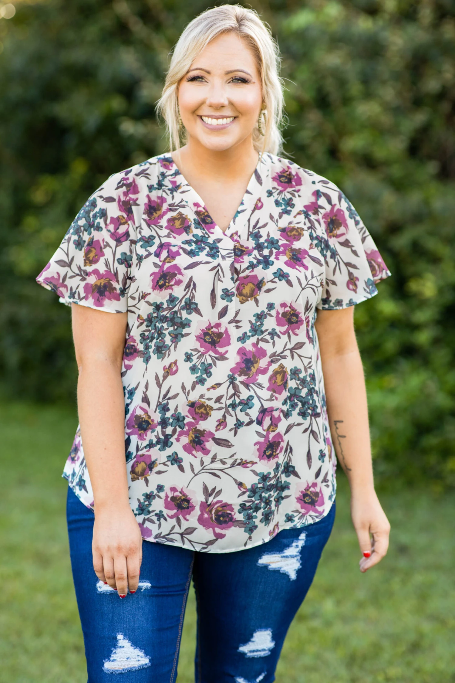 This dreamy top is a must for your afternoon activities! This top has a pretty floral pattern with neutral colors you can style for every occasion! It’s comfortable for all day wear, has a flowy fit, and features the cutest flutter sleeves! Pair this top with skinnies and a cozy cardigan for an effortlessly chic look!Â