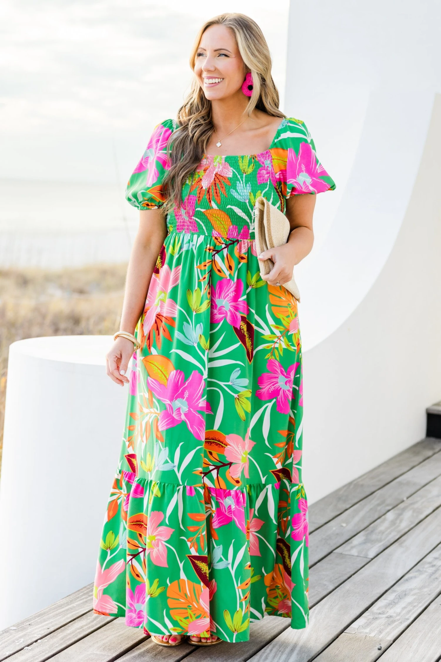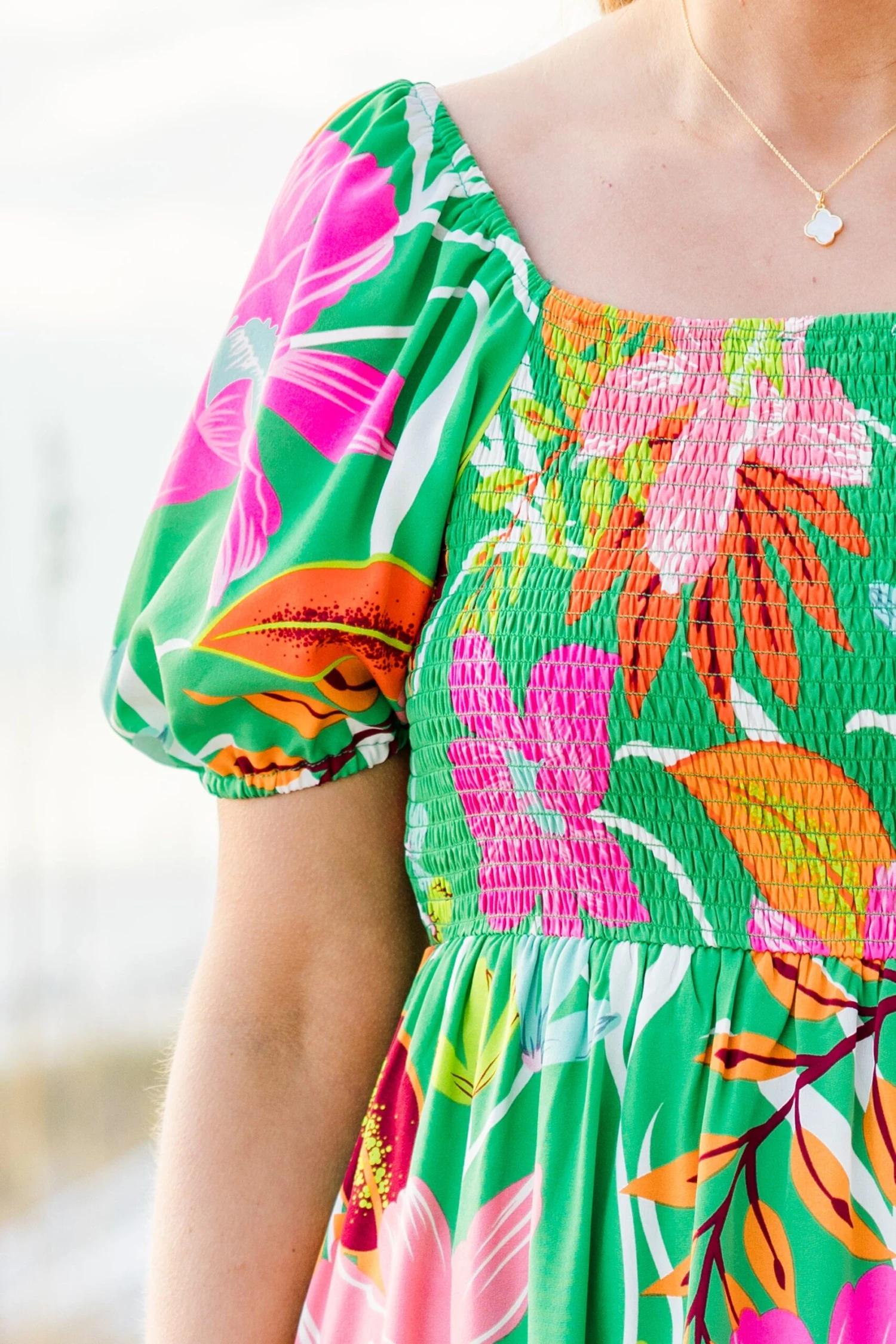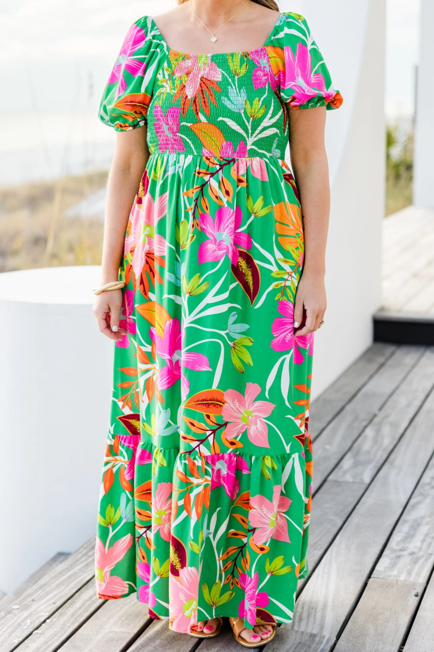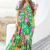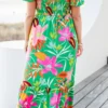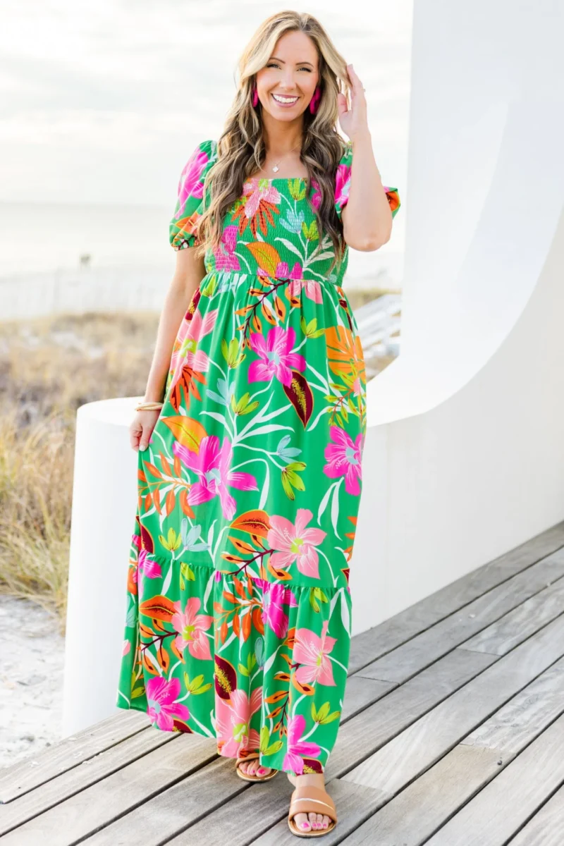 Unleash your inner flower child with the Dreamy Fields Dress in green! This dress boasts a smocked bodice, elastic puff sleeves, and shoulders for a perfectly comfortable and flattering fit! The classic square neckline is the perfect canvas for the eye-catching floral tropical print! Let your dreams run wild in this dreamy dress!