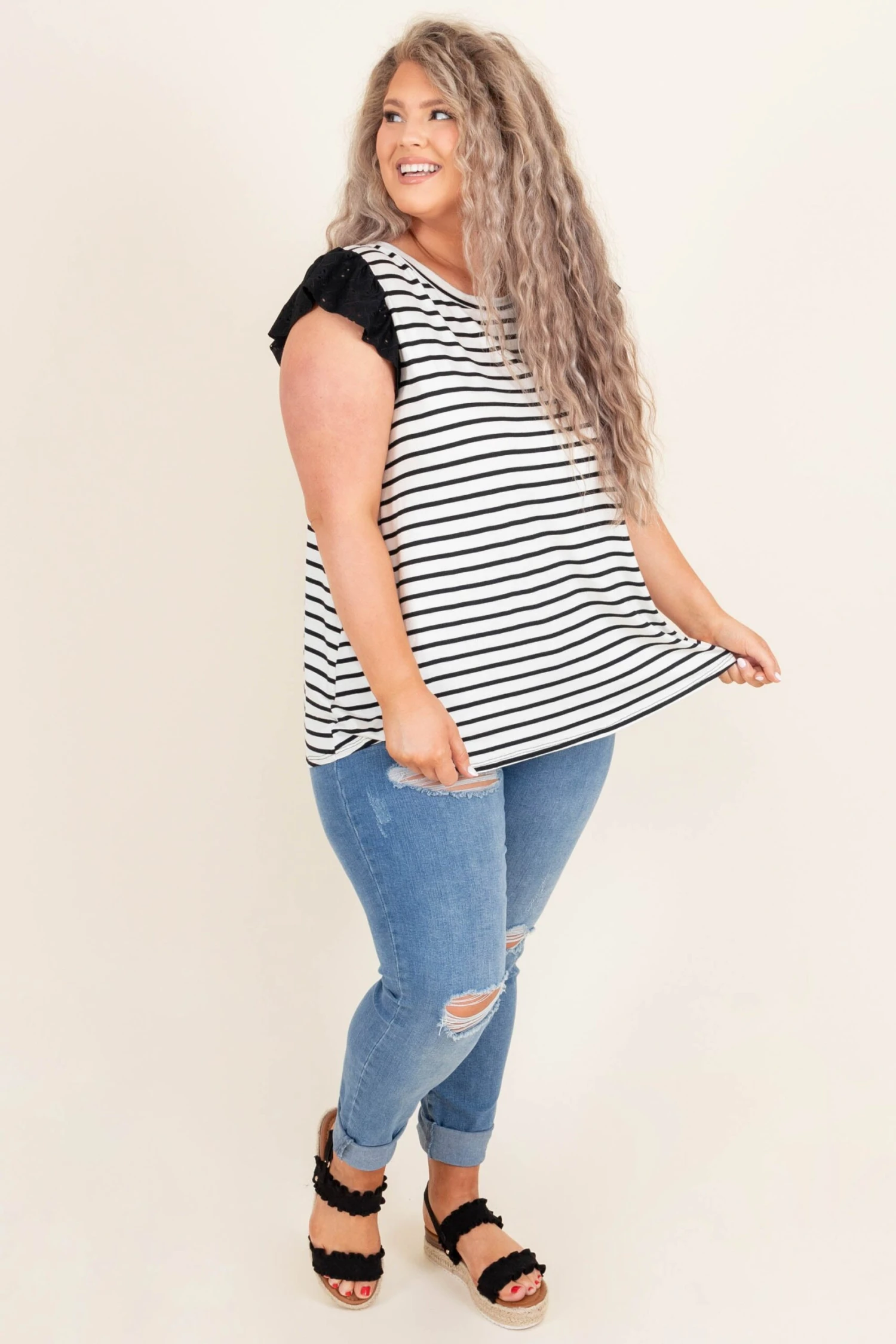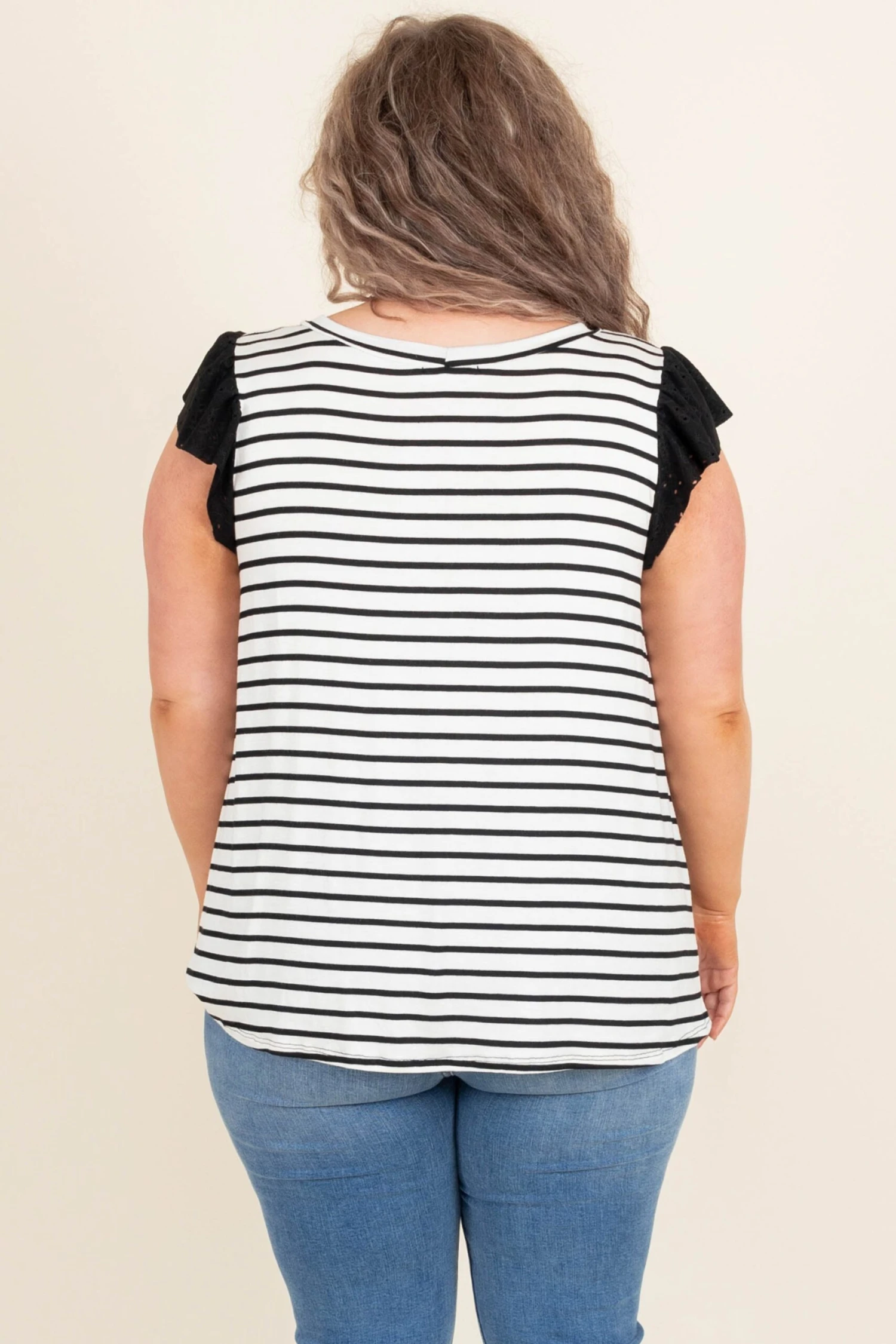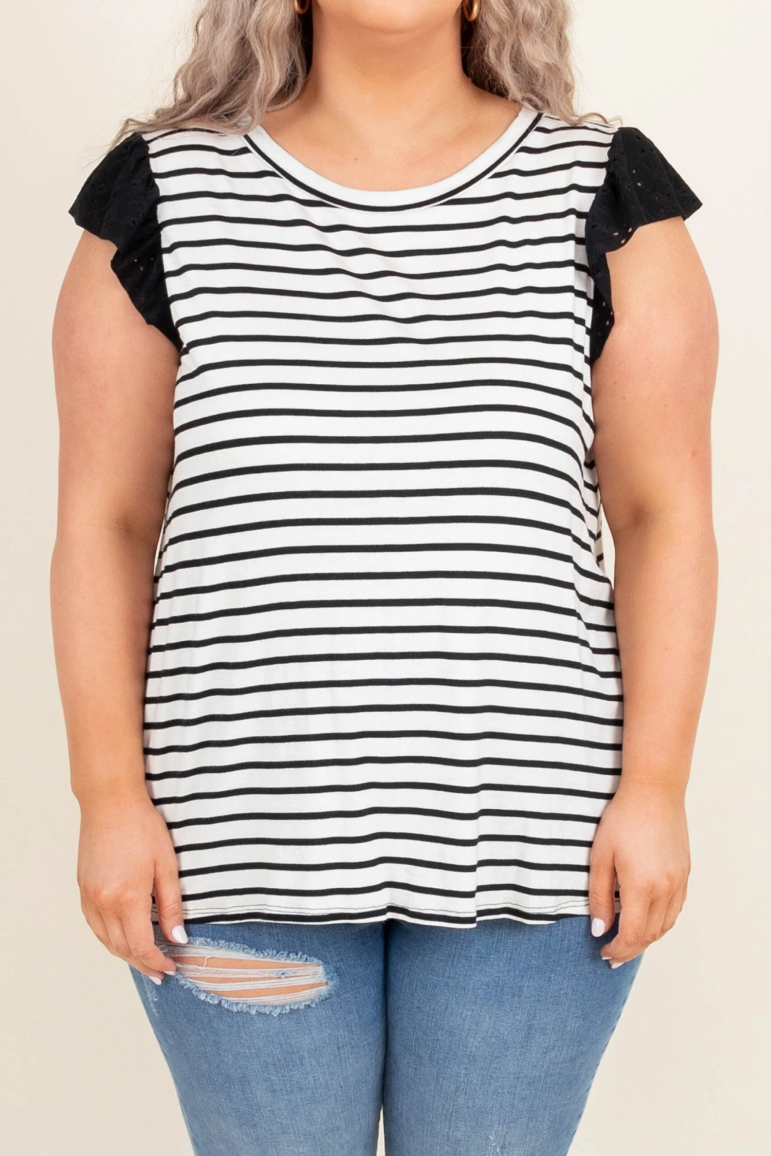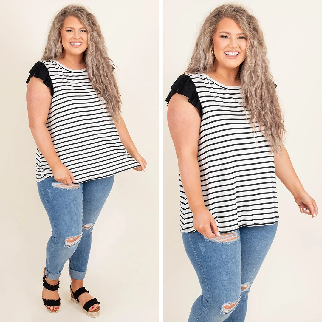 You will be a dynamic beauty in this top! The striped pattern is so classic and the black lace sleeves are the perfect chic detail! We love how soft this cutie is and the stretch means you will be comfy all day long! Style this with jeans and sandals for a look that will turn heads!