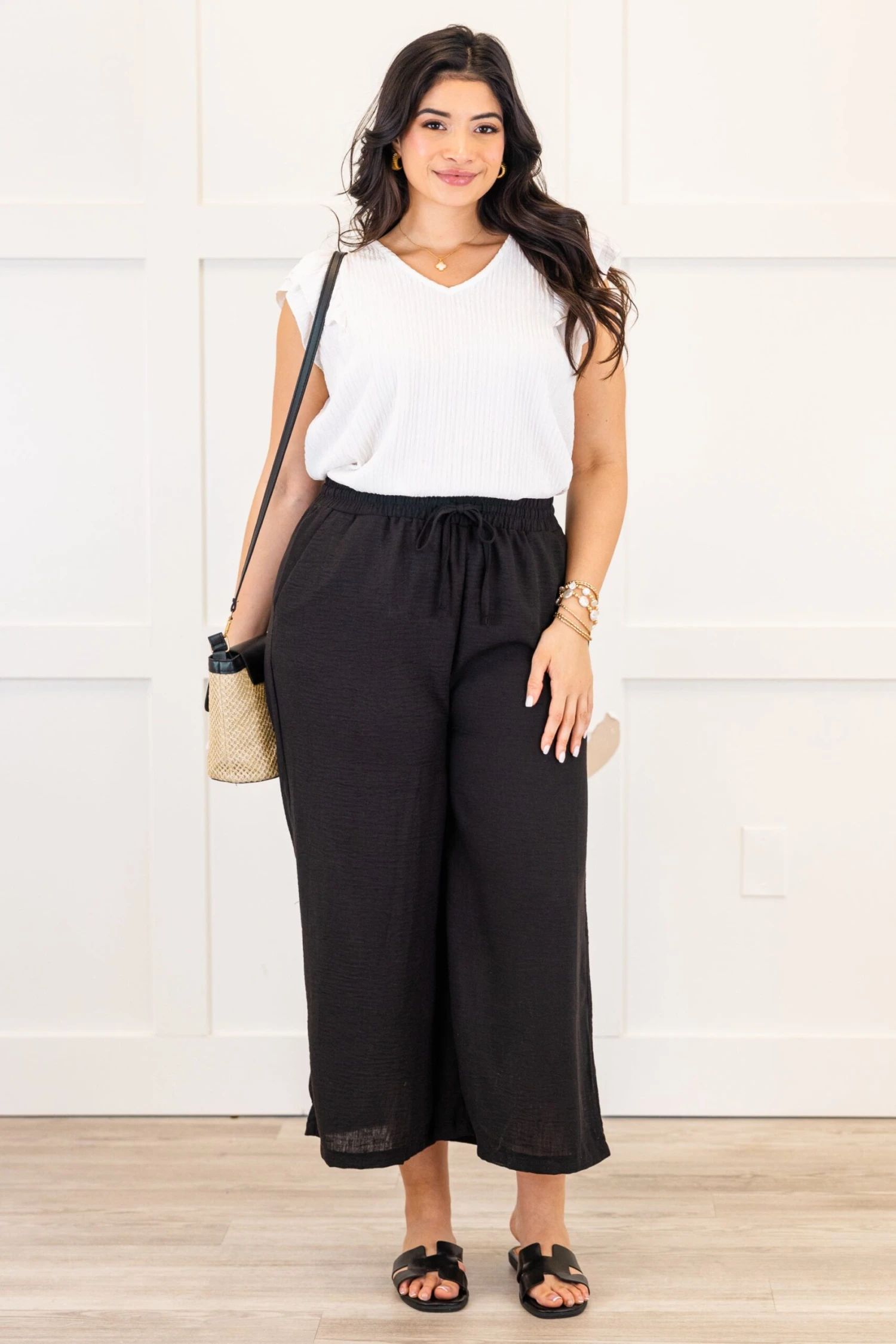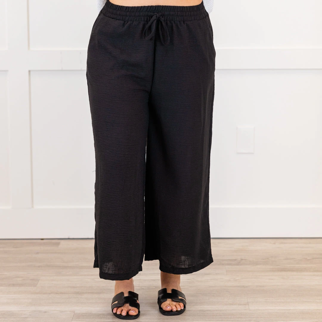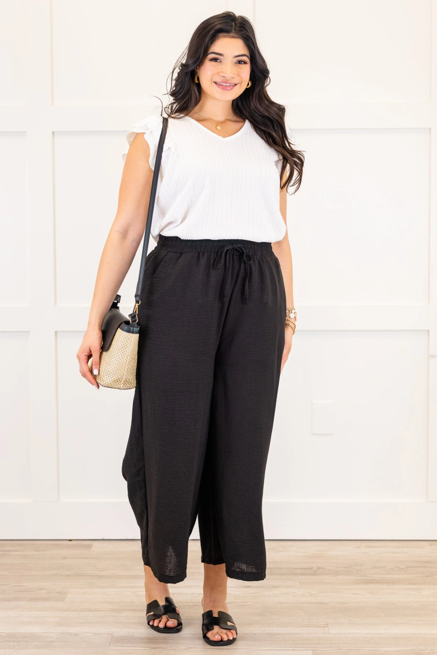 Get ready to take it easy in these pants! Made from lightweight woven crepe, these cropped pants feature a drawstring elastic band waist for maximum comfort! Perfect for any casual day out, these black pants will have you looking and feeling effortlessly stylish!