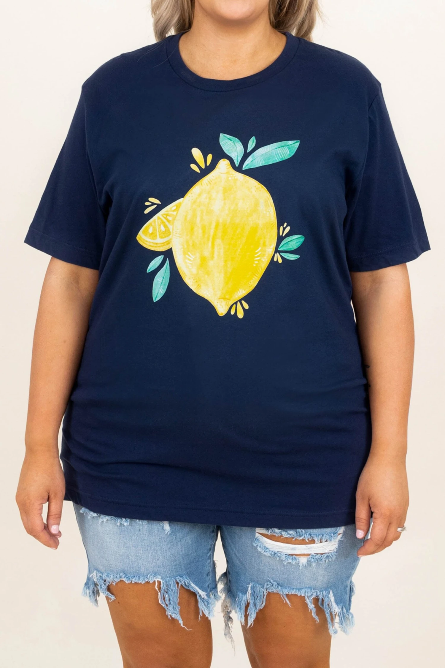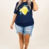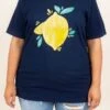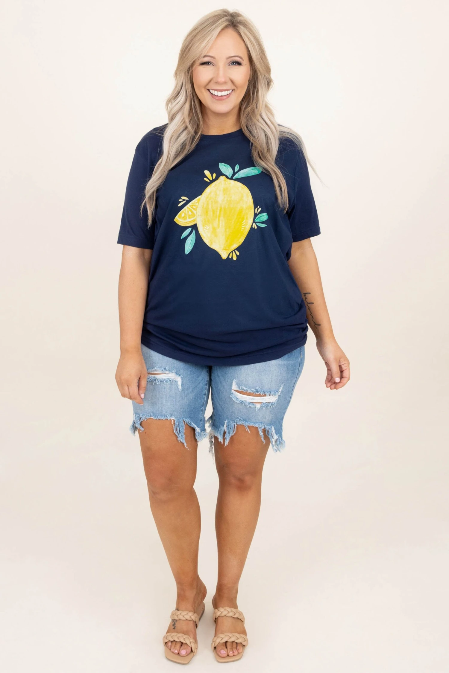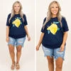 This cute top makes getting ready easy peasy! The lemon graphic is adorable and the navy blue color is perfect for spring! Throw this babe on with some shorts and sandals for a super cute spring look!