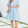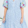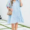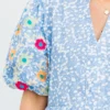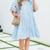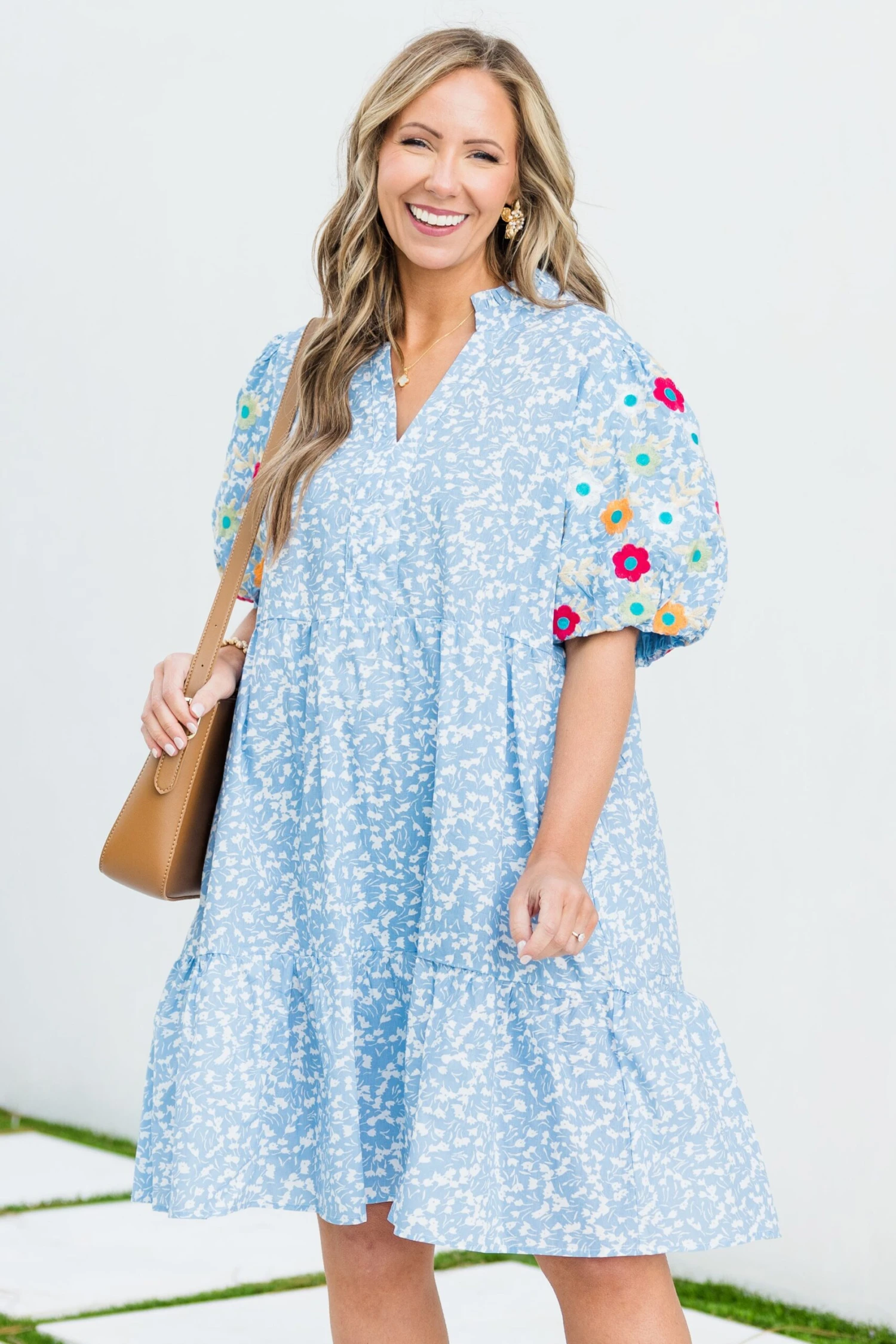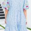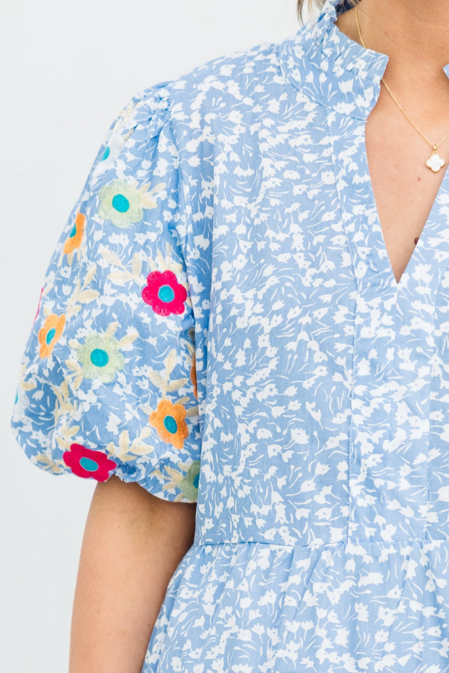 Get ready to channel your inner romantic with this dress in blue! Featuring a charming ditsy floral print and embroidered elastic floral puff sleeves, this dress is the perfect combination of playful and elegant! The split v-neck adds an extra touch of uniqueness. Bring on the romance!
