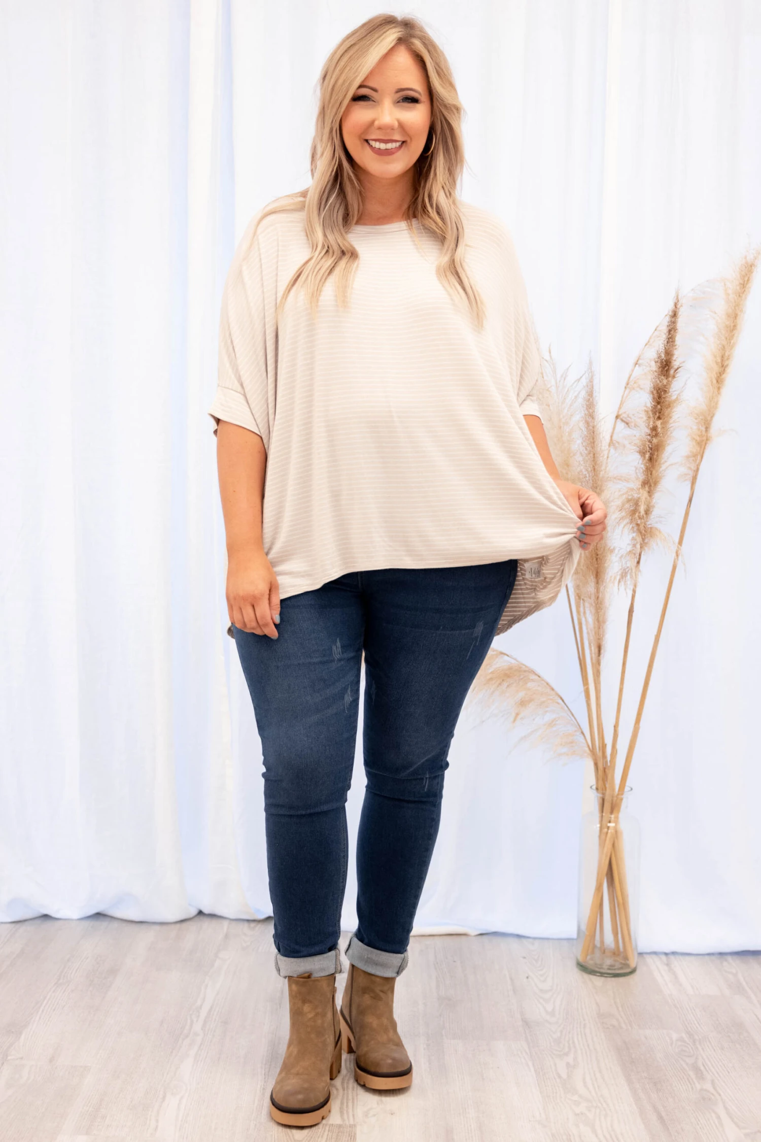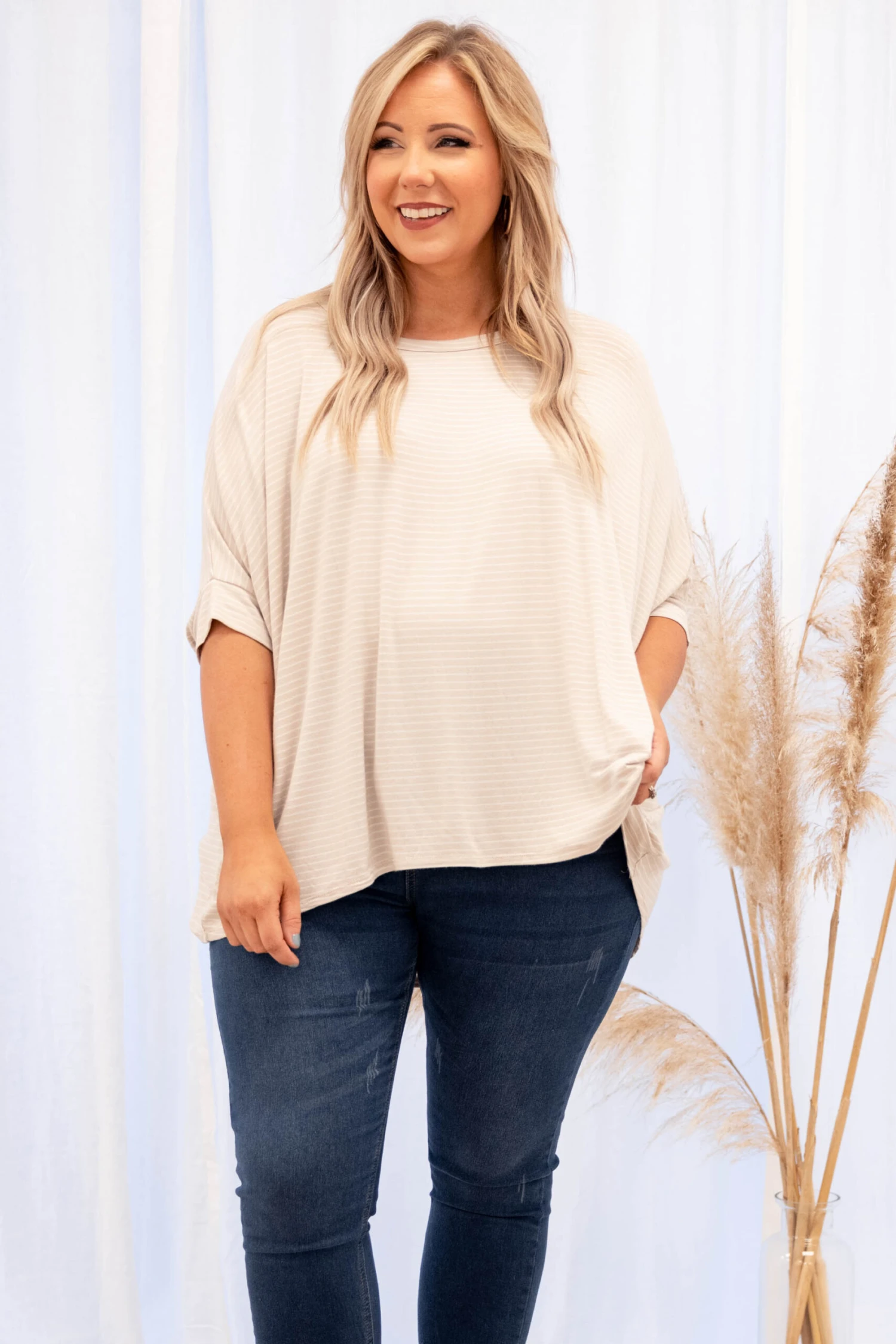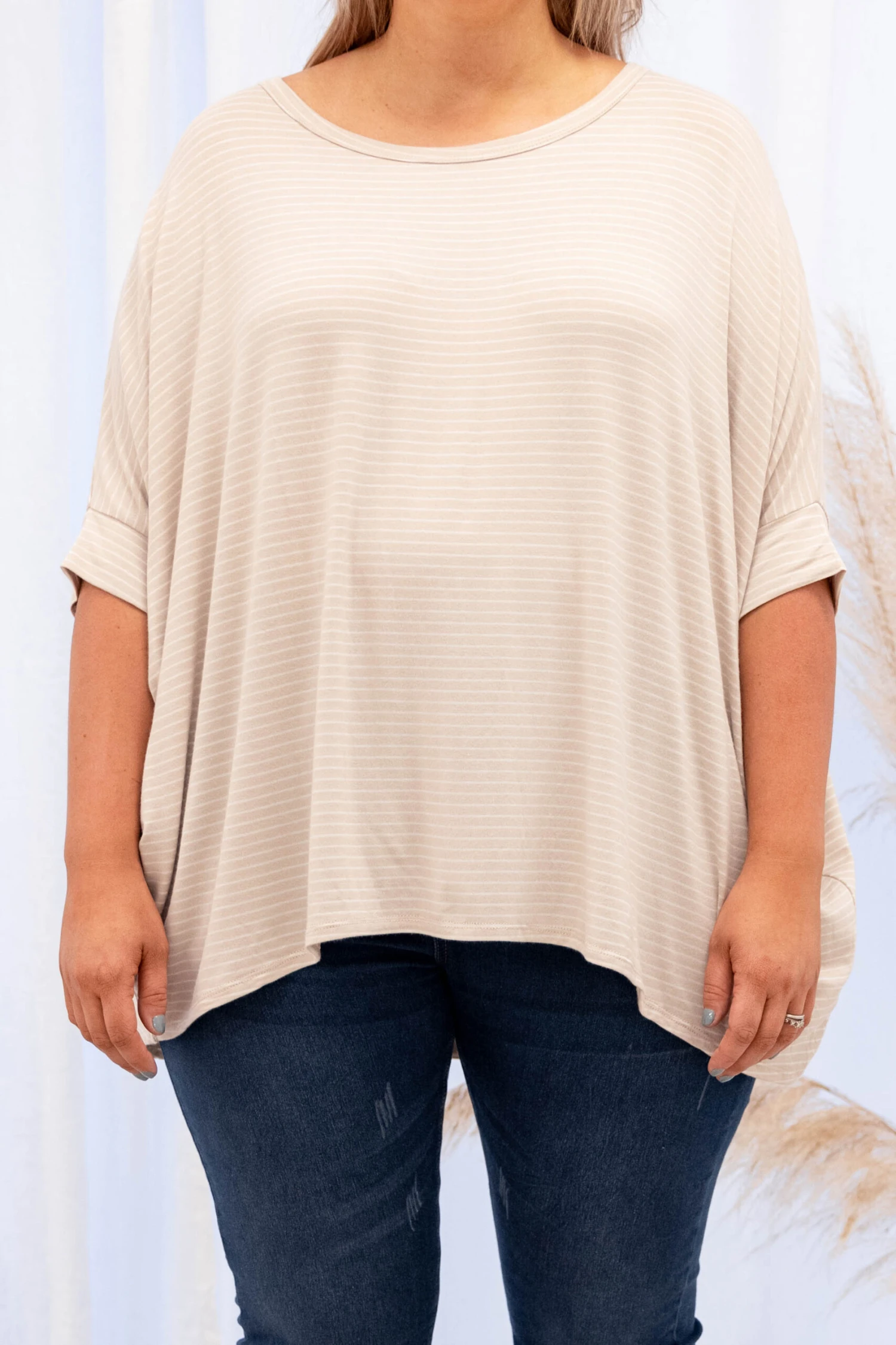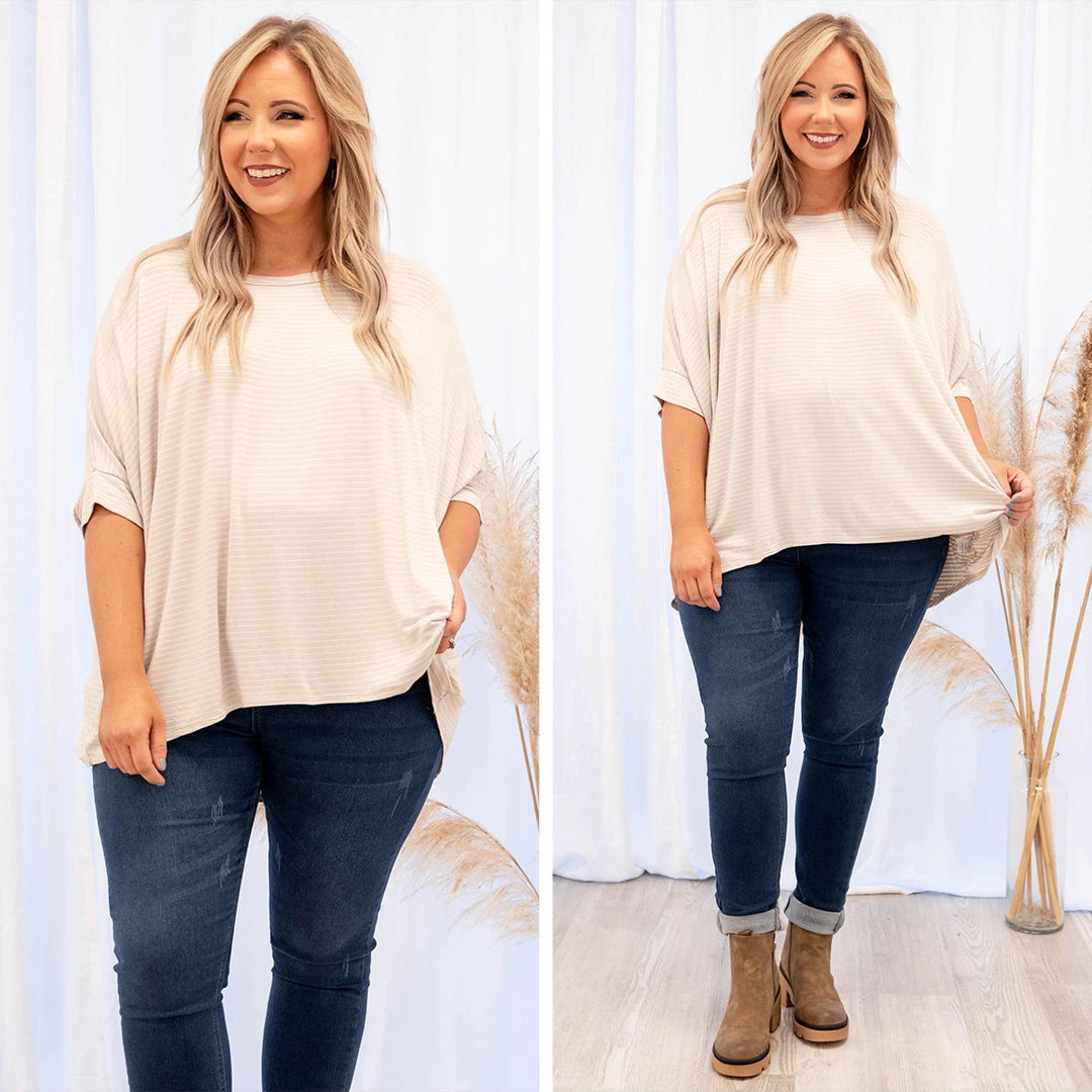 This is the top you’ll want to live in all season! This top has a subtle stripe pattern with neutral colors you can style for every occasion! It’s comfortable for all-day wear, has an oversized fit, and features a banded hemline for the ultimate design! Pair this top with skinnies and sneakers for an easy everyday look!Â