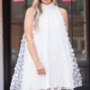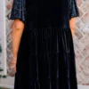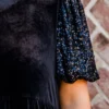 Get ready to turn heads in our Eclipse Beauty Dress! The plush velvet bodice and playful contrast sequin elastic puff sleeves make this little black dress a statement piece. Perfect for a night out or special occasion. Don’t just blend in, stand out with this dress!