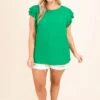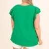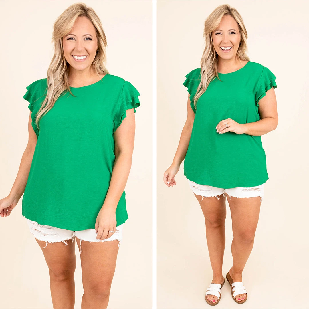 Feel effortlessly chic in this top! This top has a solid kelly green color for a chic look and a crepe textured fabric that is so fun! The ruffle sleeves have stolen our hearts and give this a sweet feminine feel! Style it with some jean shorts and sandals for a classic everyday look!