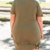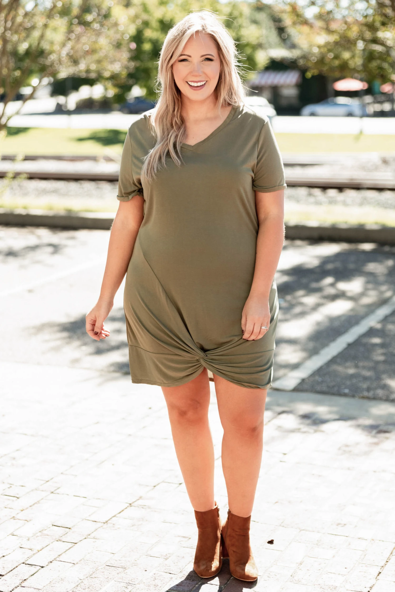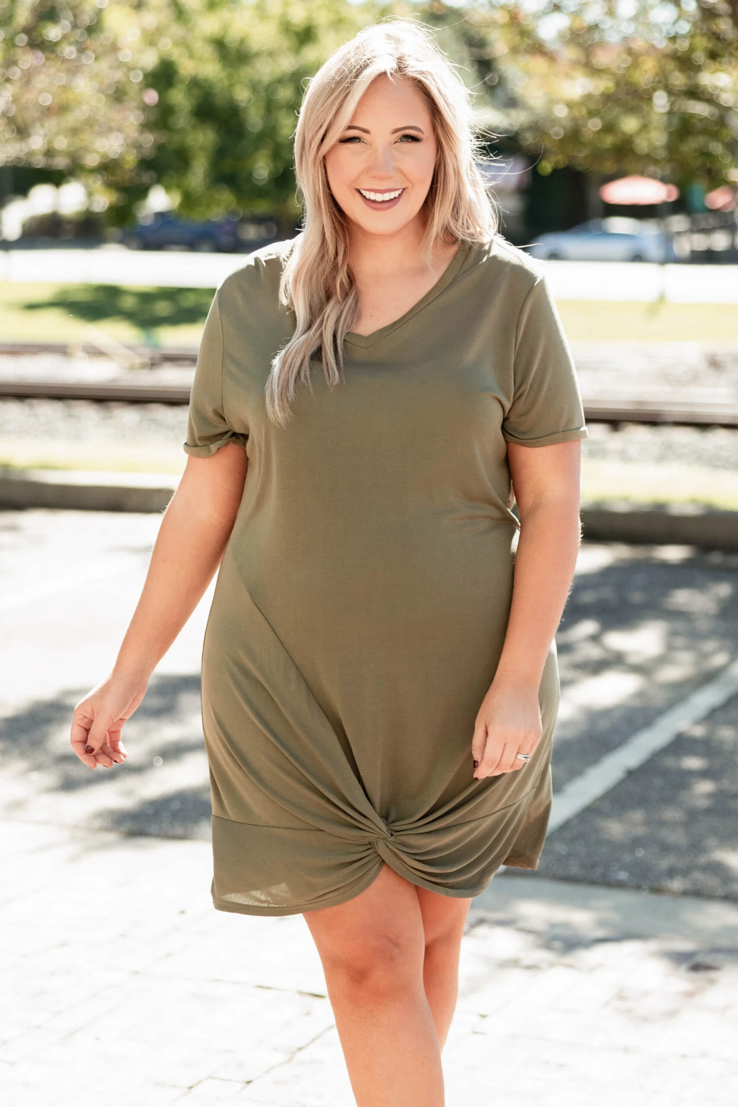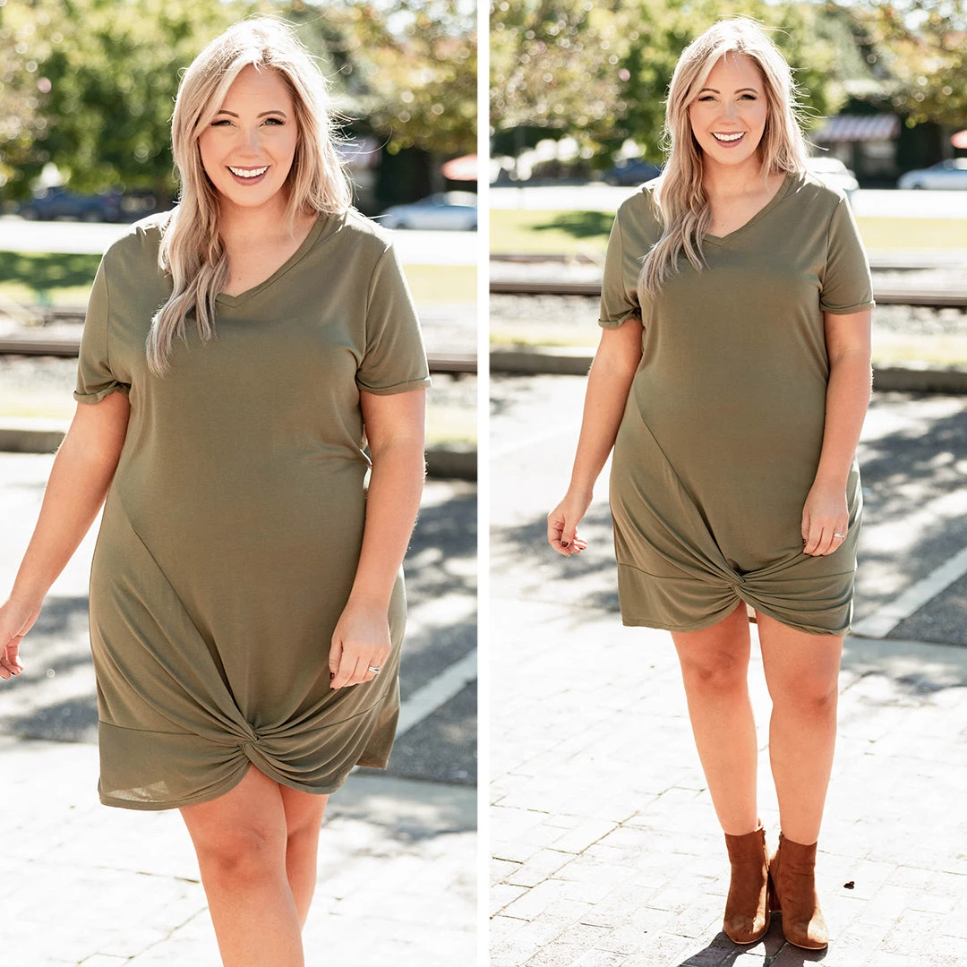 No matter the way you wear it, this dress is perfect for every occasion! This dress has a solid neutral color you can dress up or down with ease! It’s comfortable for all day wear, has a flowy fit, and features the cutest twisted hemline! Style this dress with booties and your favorite outerwear for an easy everyday look!