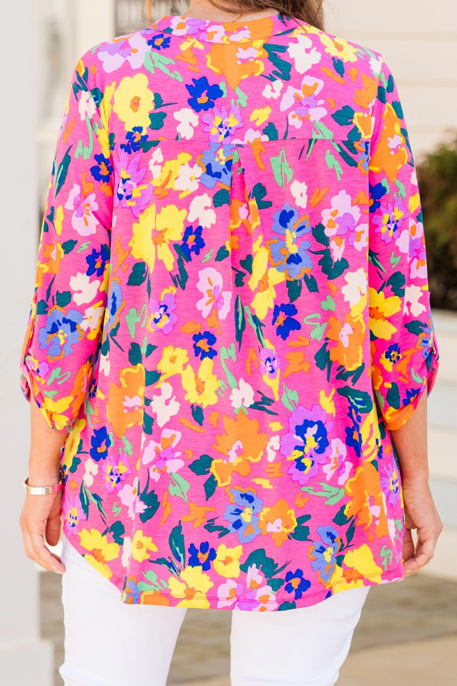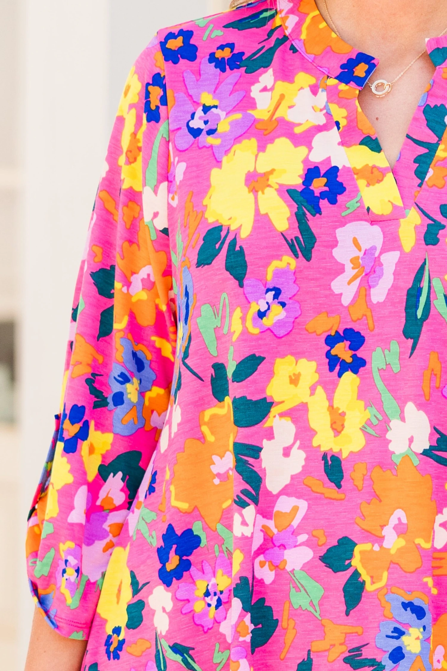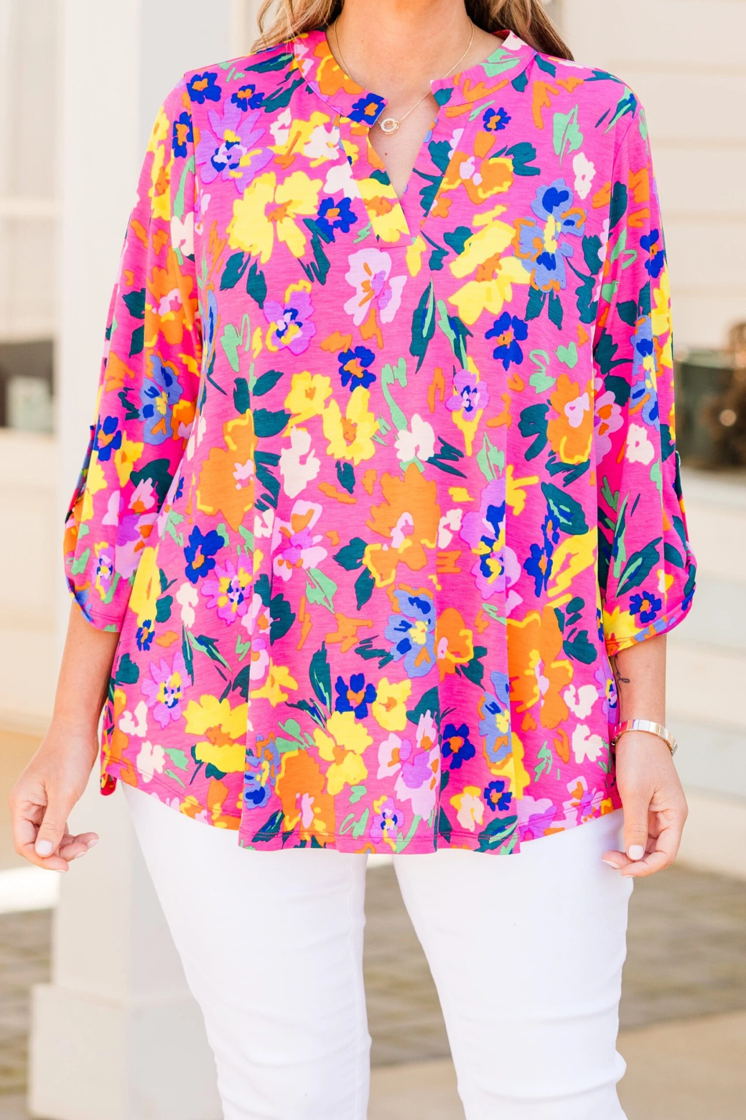 Blossom into the new season with this lovely top! It features a wrinkle-free, easy care design, making it the perfect choice for looking and feeling great all day long! The bold hot pink color and beautiful floral pattern add a touch of vibrancy that is sure to turn heads! Pair with your favorite bottoms and accessories for an unforgettable look!
