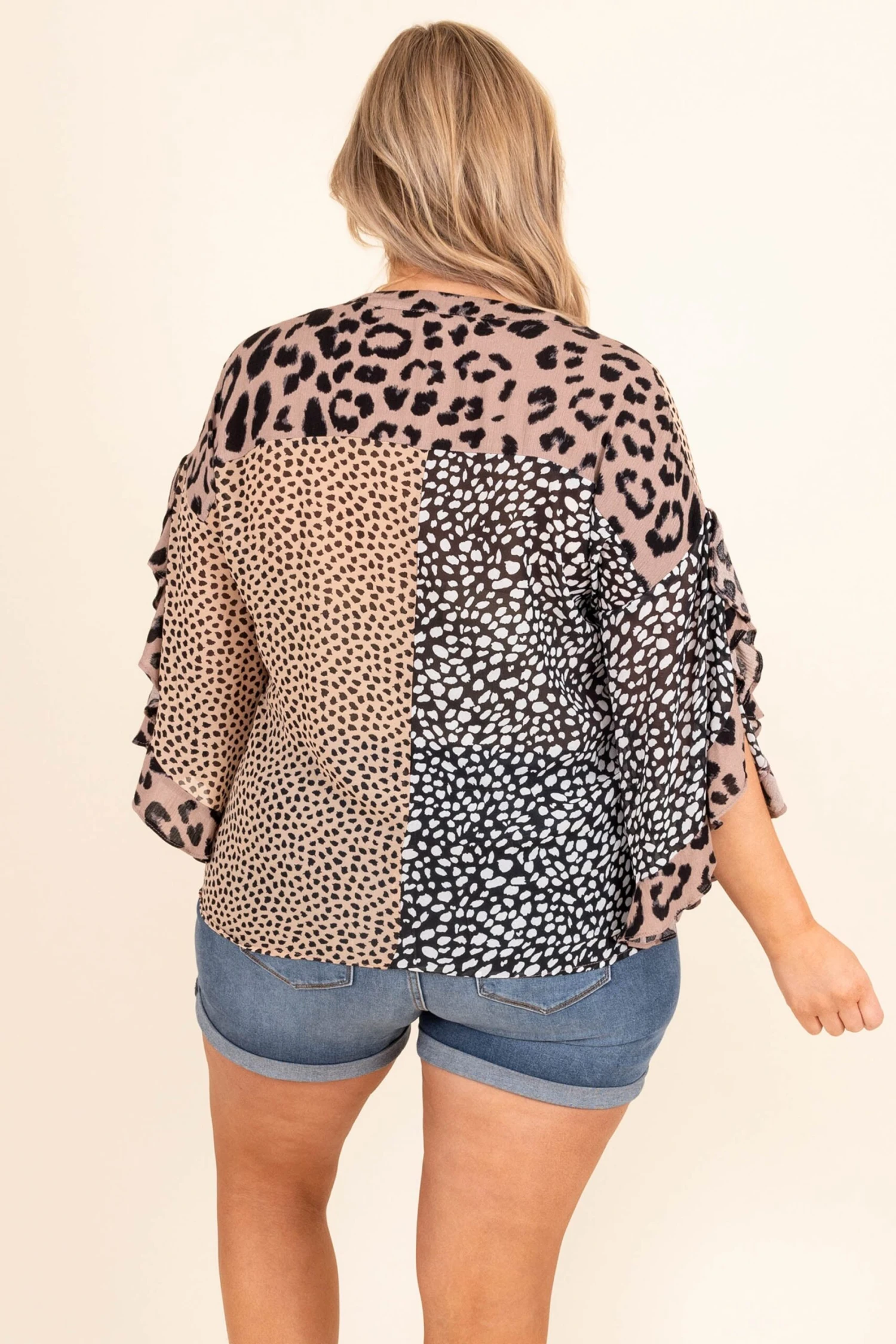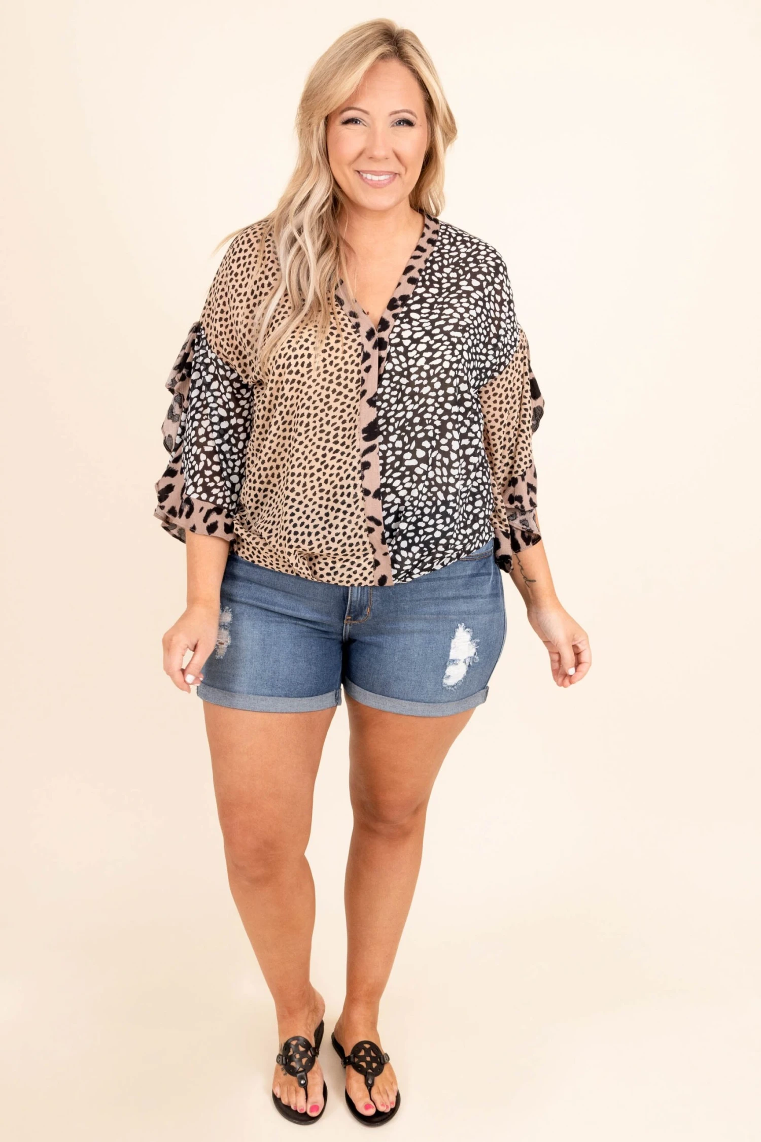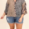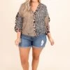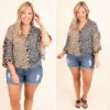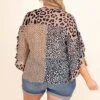 This top needs a spot in your closet this season! The color block leopard pattern is so cute and the flowy sleeves are so fun! This cutie has a snap on the bust for a more full coverage look! Style this with jean shorts and sandals for a cute everyday look!