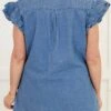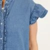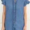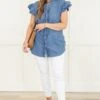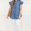 Embrace today and tomorrow in this playful denim top with raw hem details! The button-up design and cap flutter sleeves add a fun touch to this versatile piece! Wear it with jeans for a denim-on-denim look or dress it up with slacks for a more polished style!