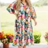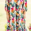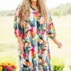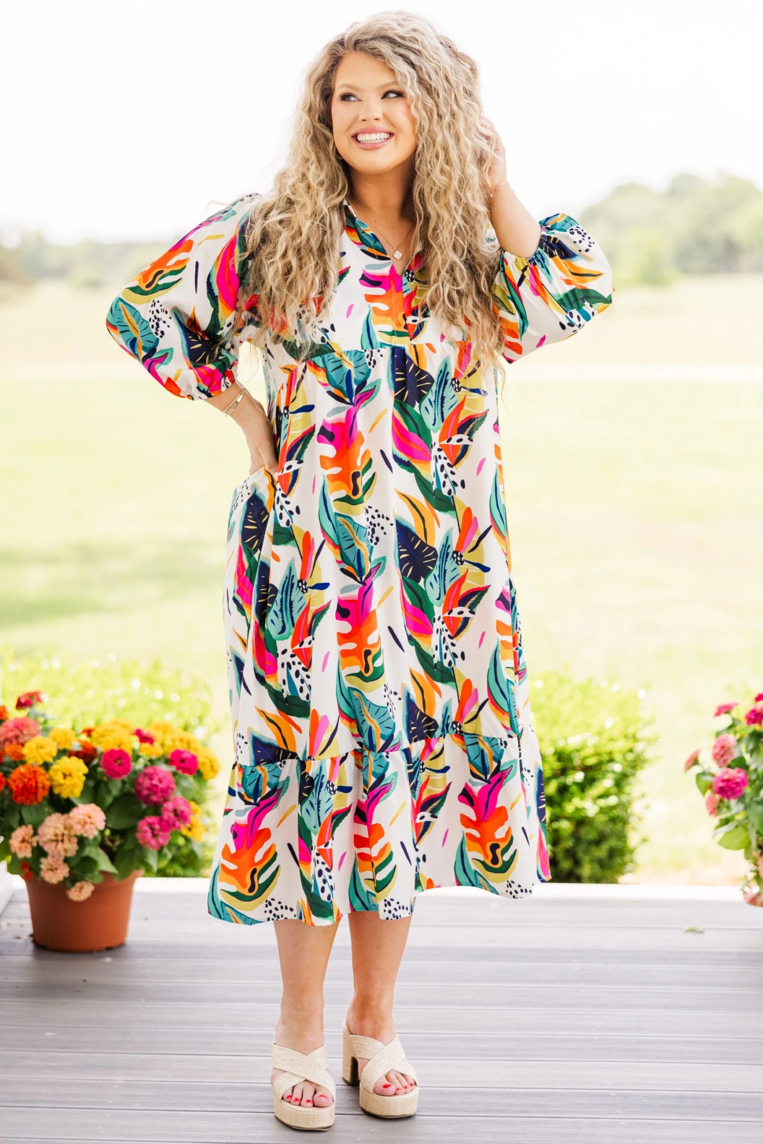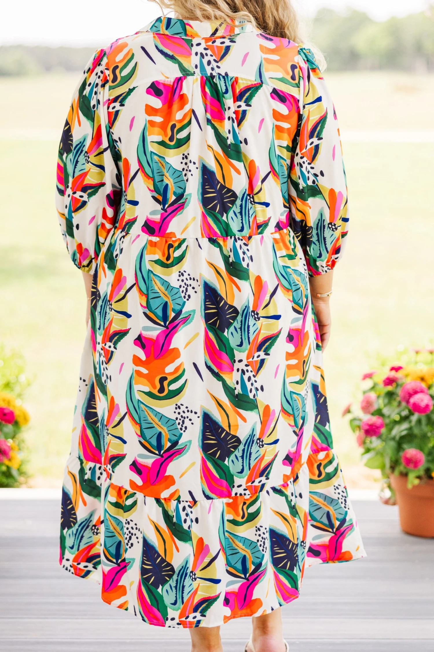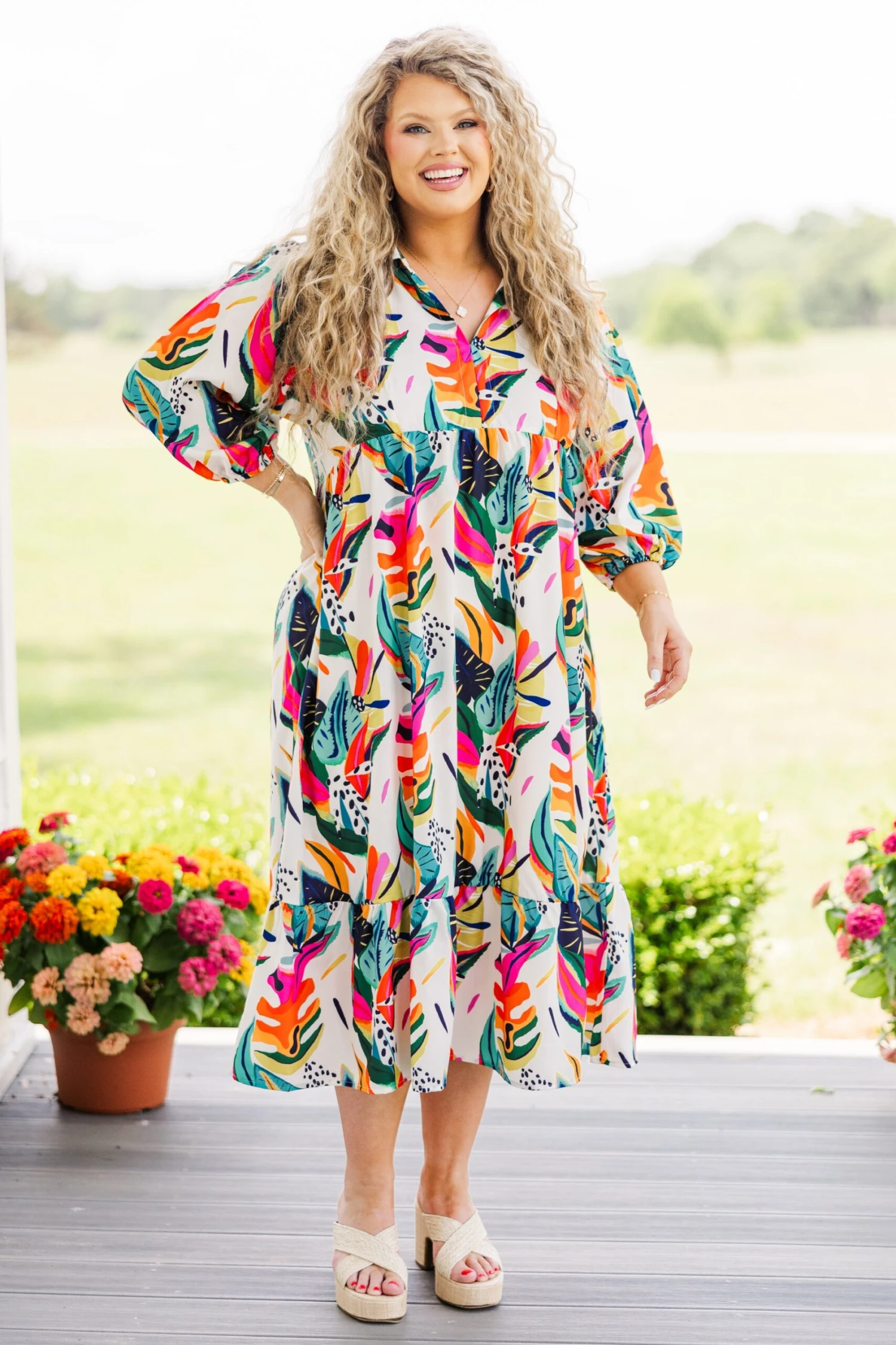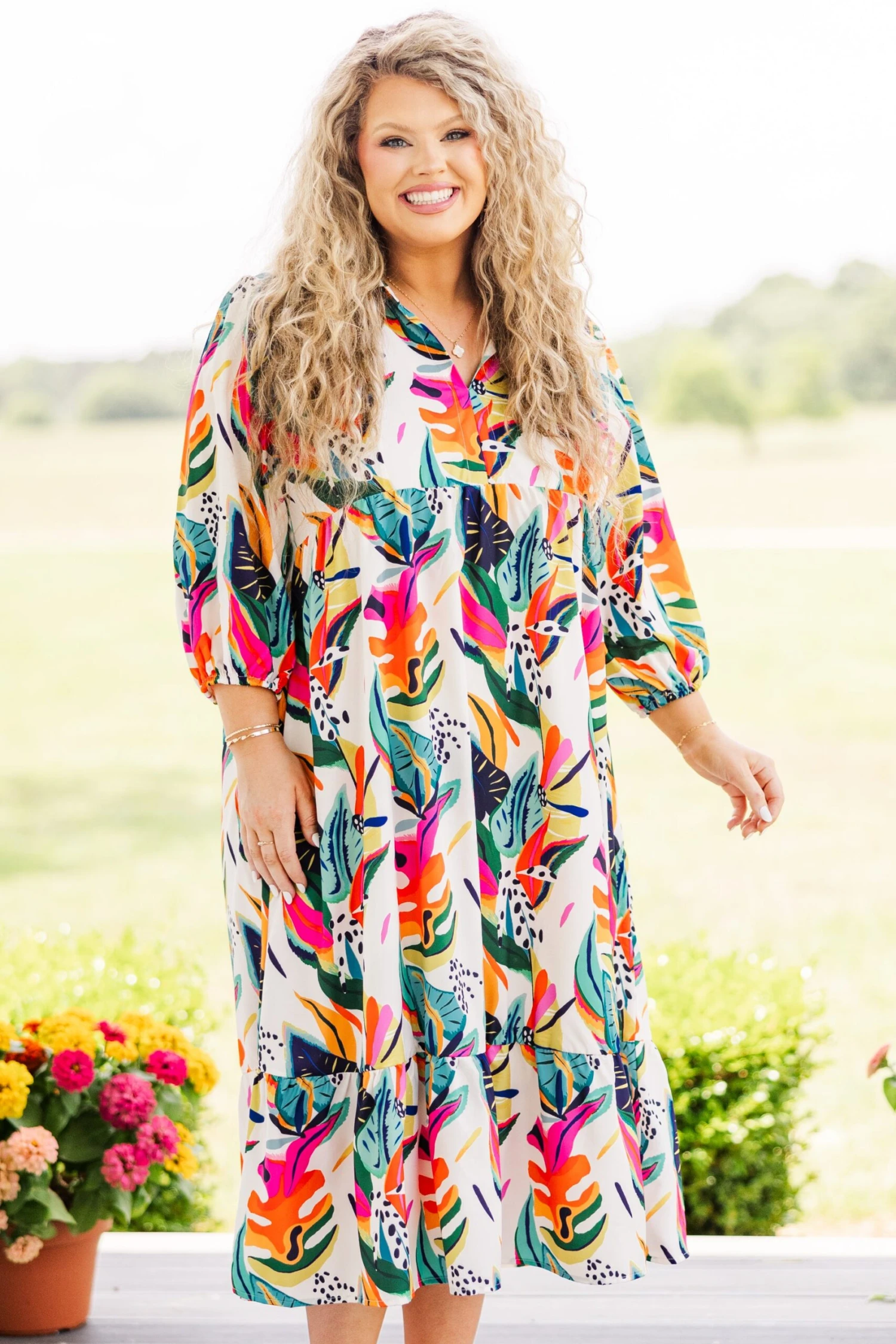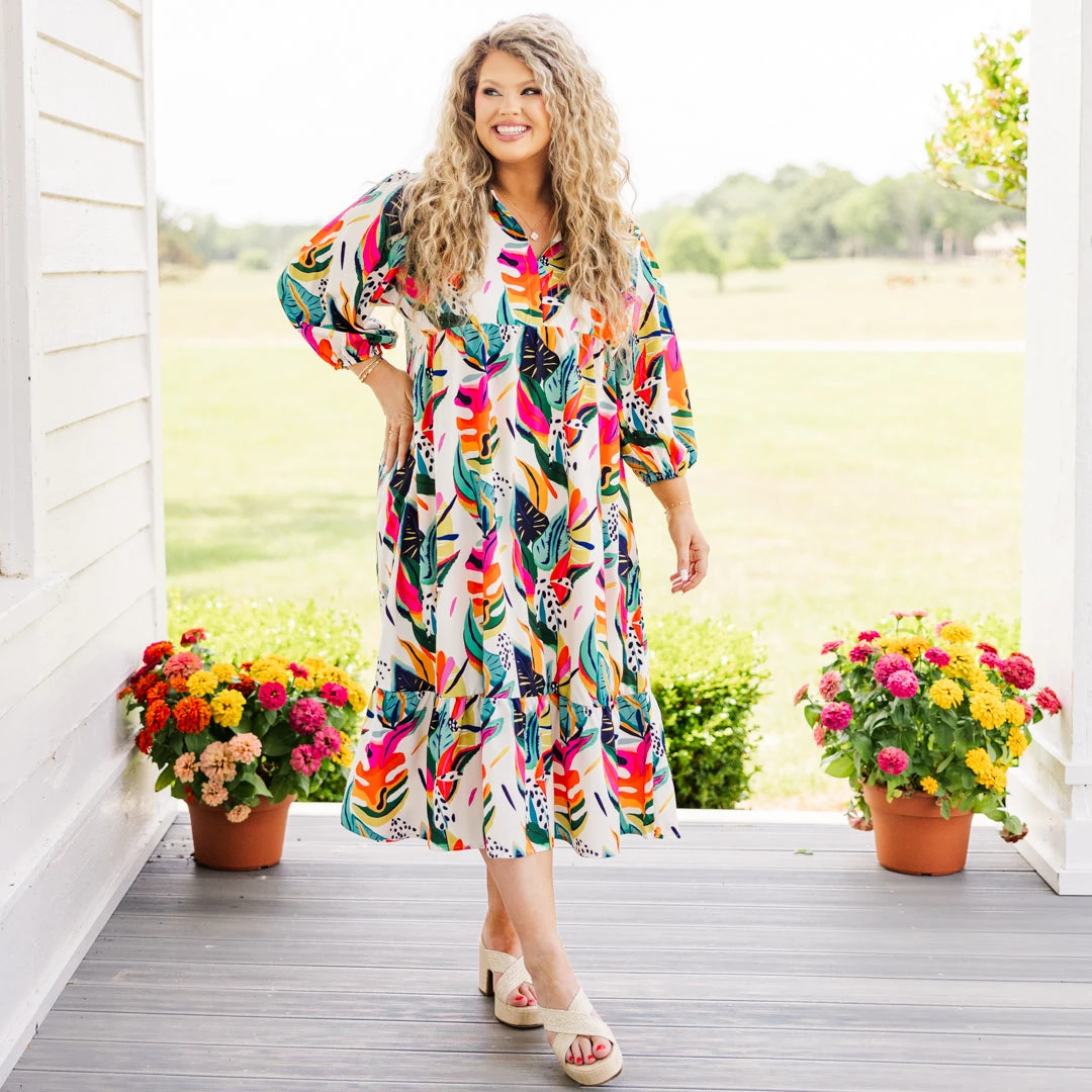 Introducing the Enchanting Encore Midi Dress, designed with playful bubble sleeves and a vibrant tropical floral pattern. This dress is the perfect addition to any resort or beach trip, adding a touch of fun and whimsy to your look. Feel effortlessly chic in this cream-colored dress.