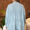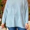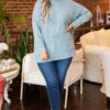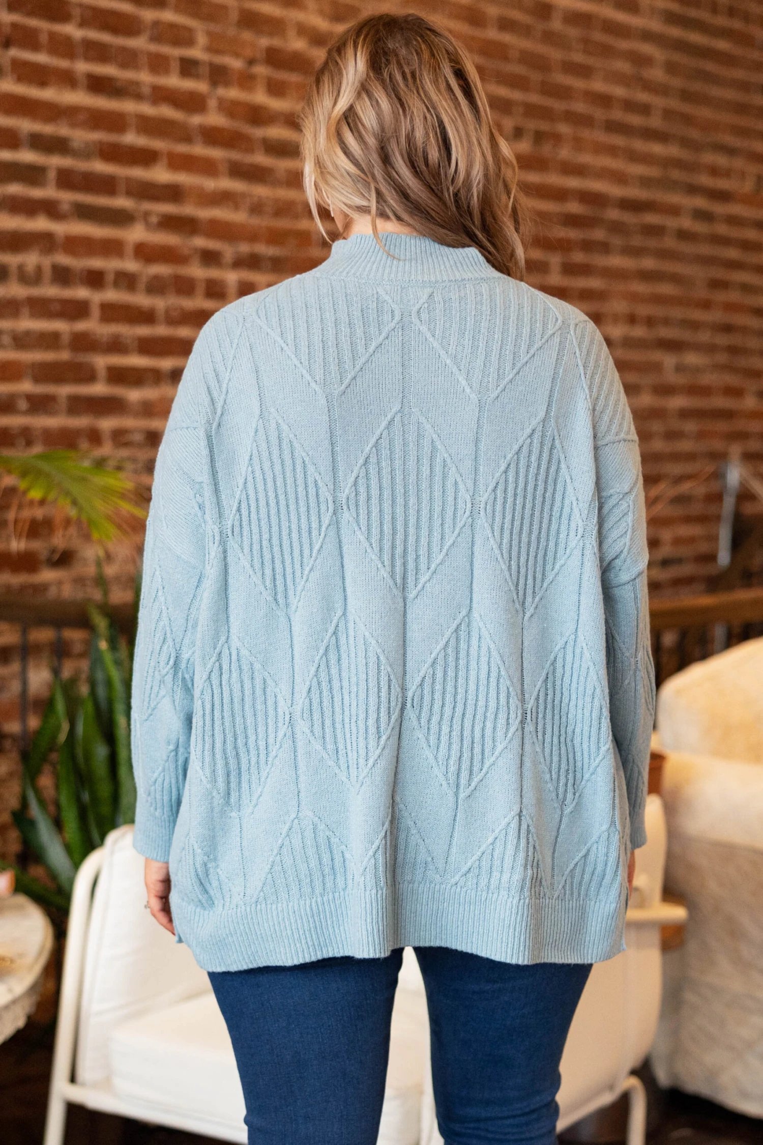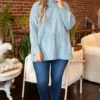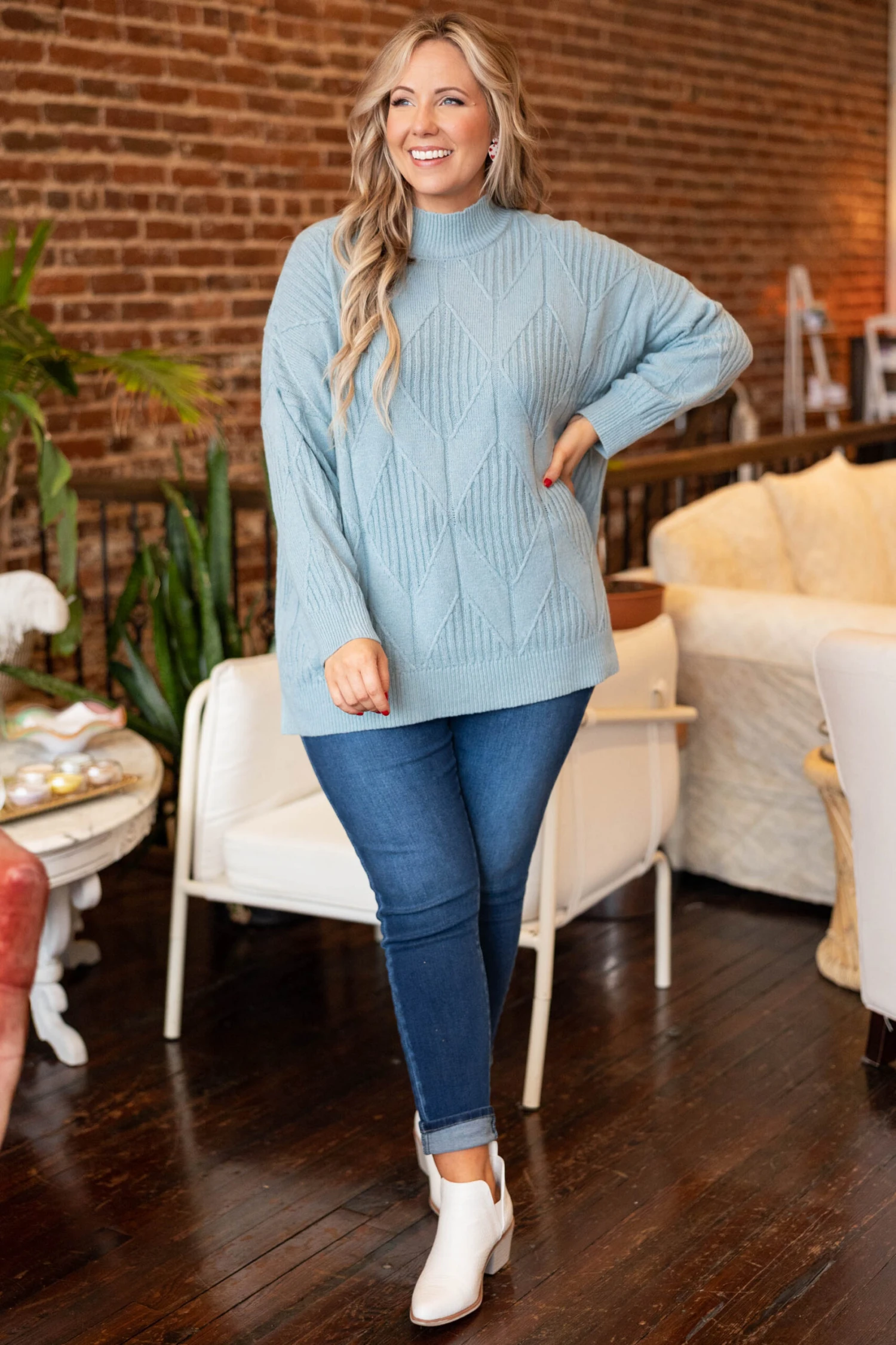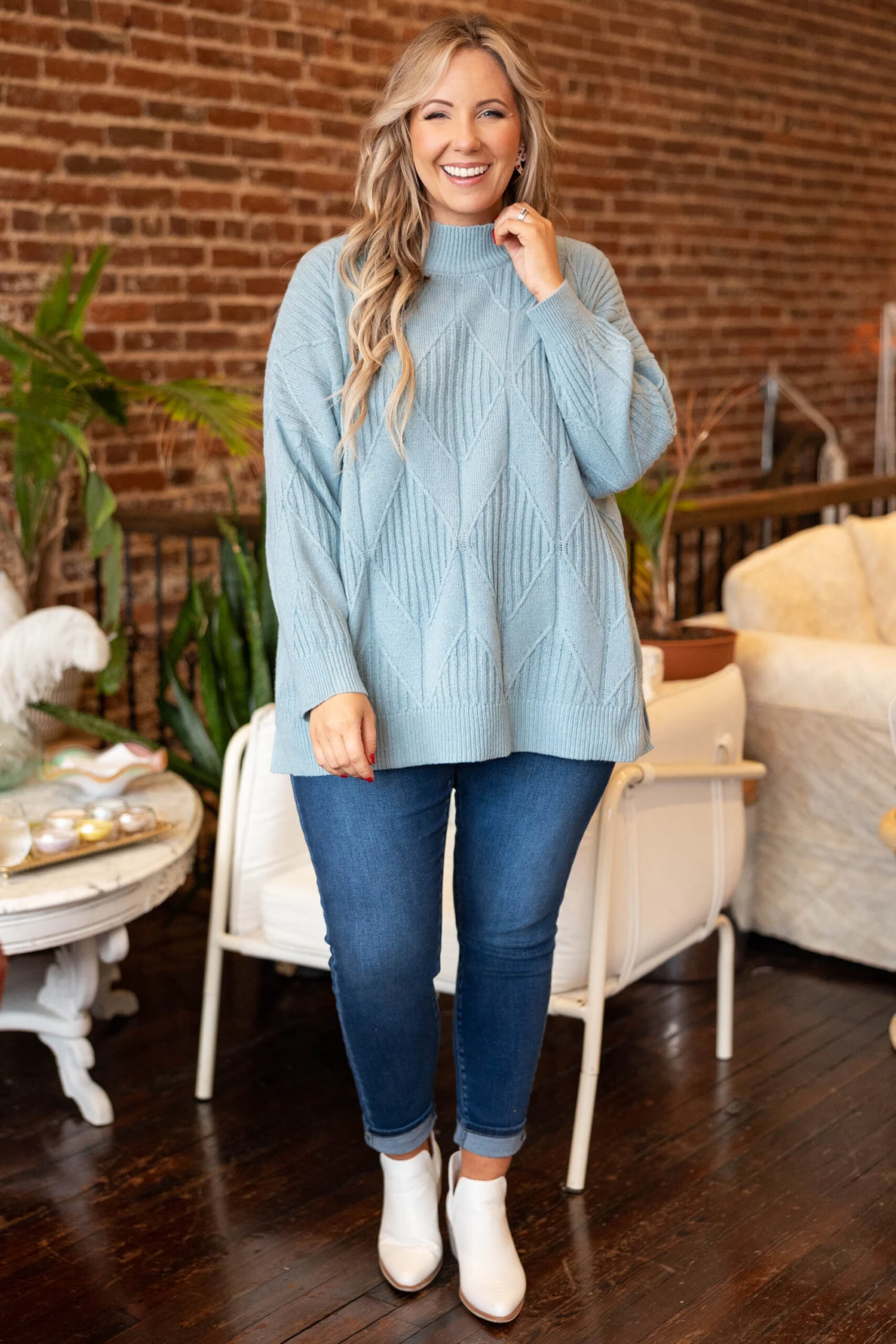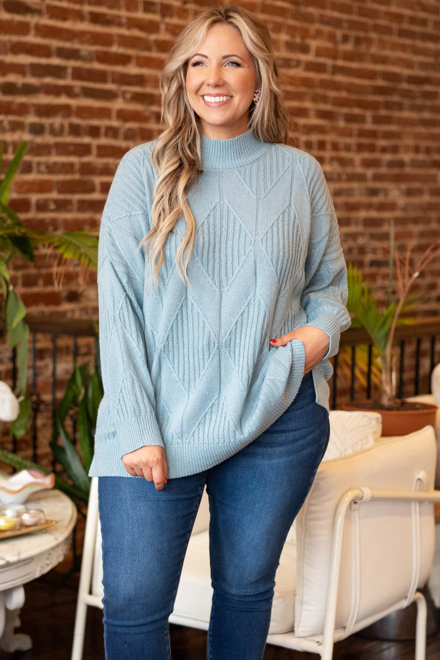 Every evening will be enchanted in this gorgeous sweater! This sweater has a light blue color with a knitted design and high neckline that is perfect for the season! It has a figure flattering fit and pairs well with skinnies or leggings for the ultimate look!