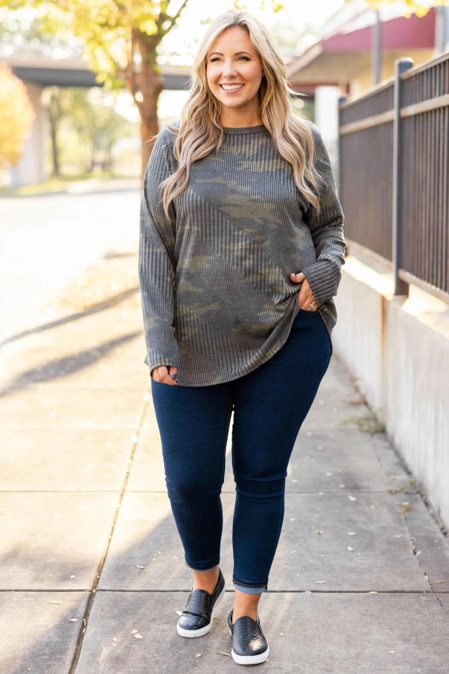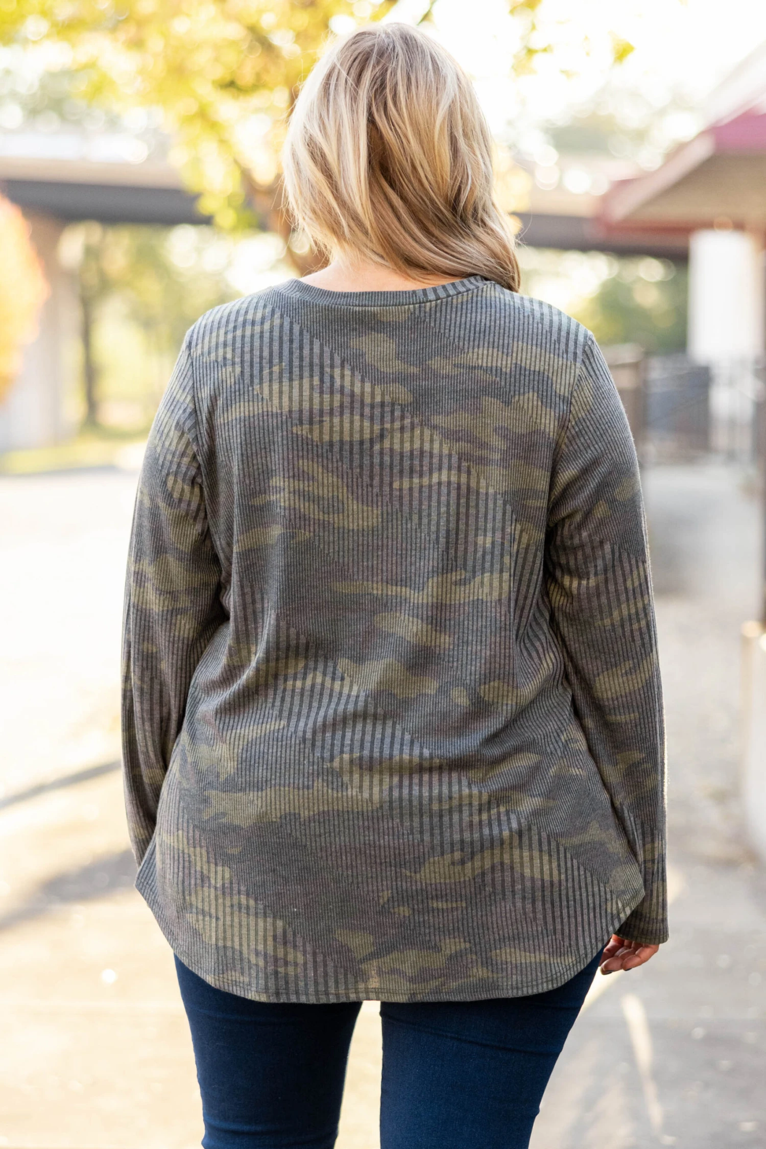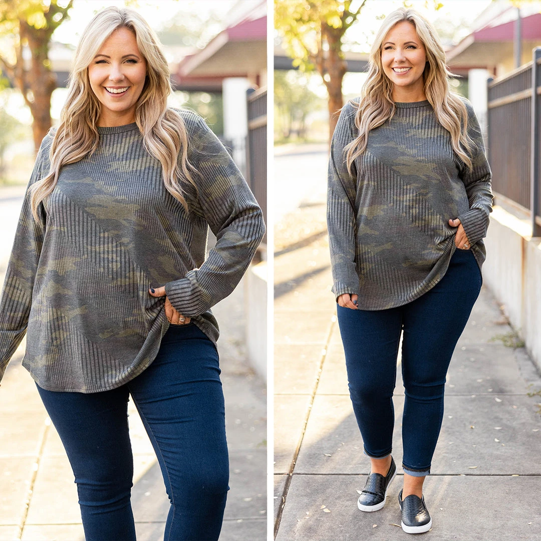 This top is a fashion dream! It has a beautiful camo pattern that is perfect for the season! The textured design is so chic! The lightweight, figure flattering fit is great for all day wear! Style this top with skinnies or leggings for a trendy casual look!