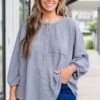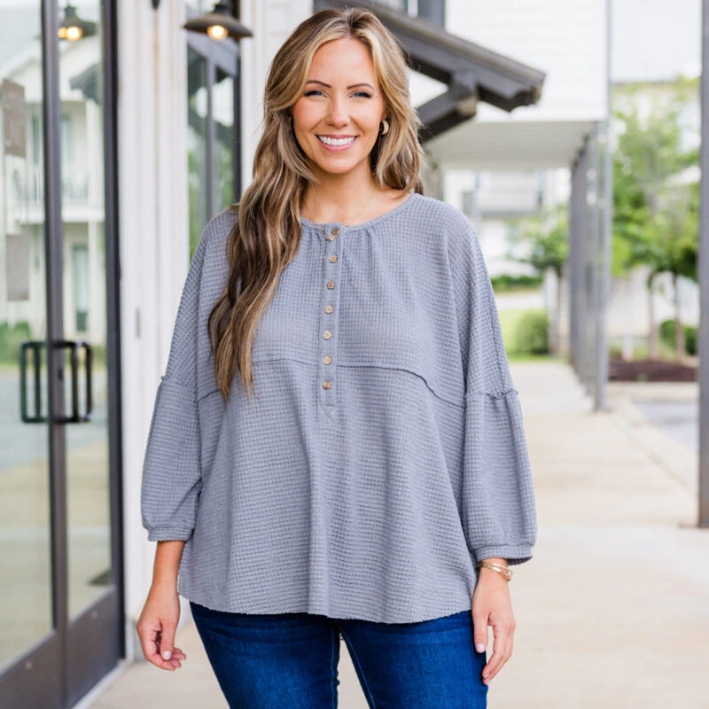 Get ready to embrace an eternal stylish look with our Eternal Embrace Top! Made with a textured material and featuring trendy bubble sleeves, this top is perfect for any occasion! The classic grey color adds a touch of fun to your wardrobe! Embrace the chic and playful vibe of this top now!