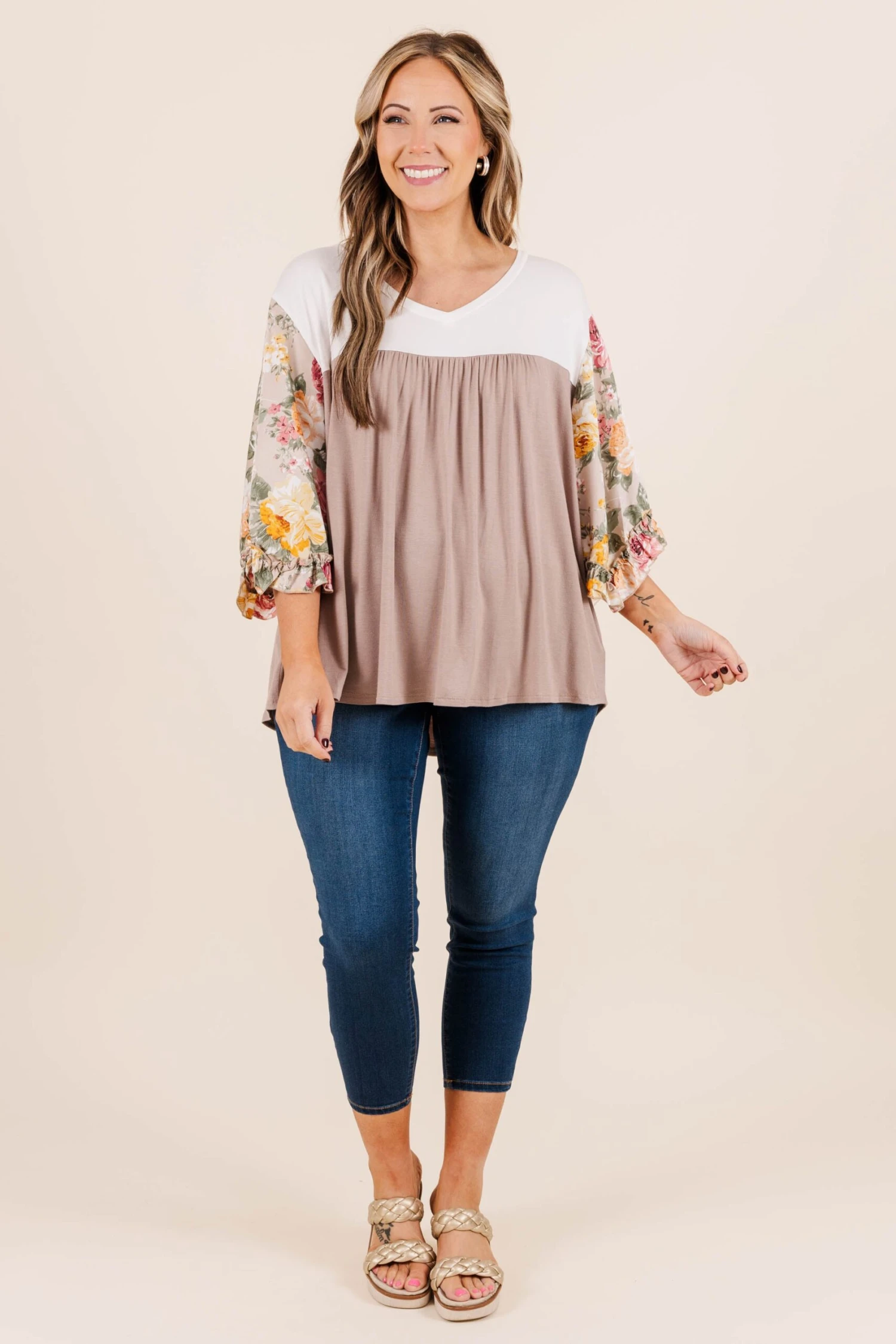 This top is everything you’ve ever wanted and more! Featuring a beautiful floral design on the sleeves, this top is perfect for achieving a casual chic look this season! The neutral colors make it a versatile addition to any wardrobe! Upgrade your style with this must-have piece!