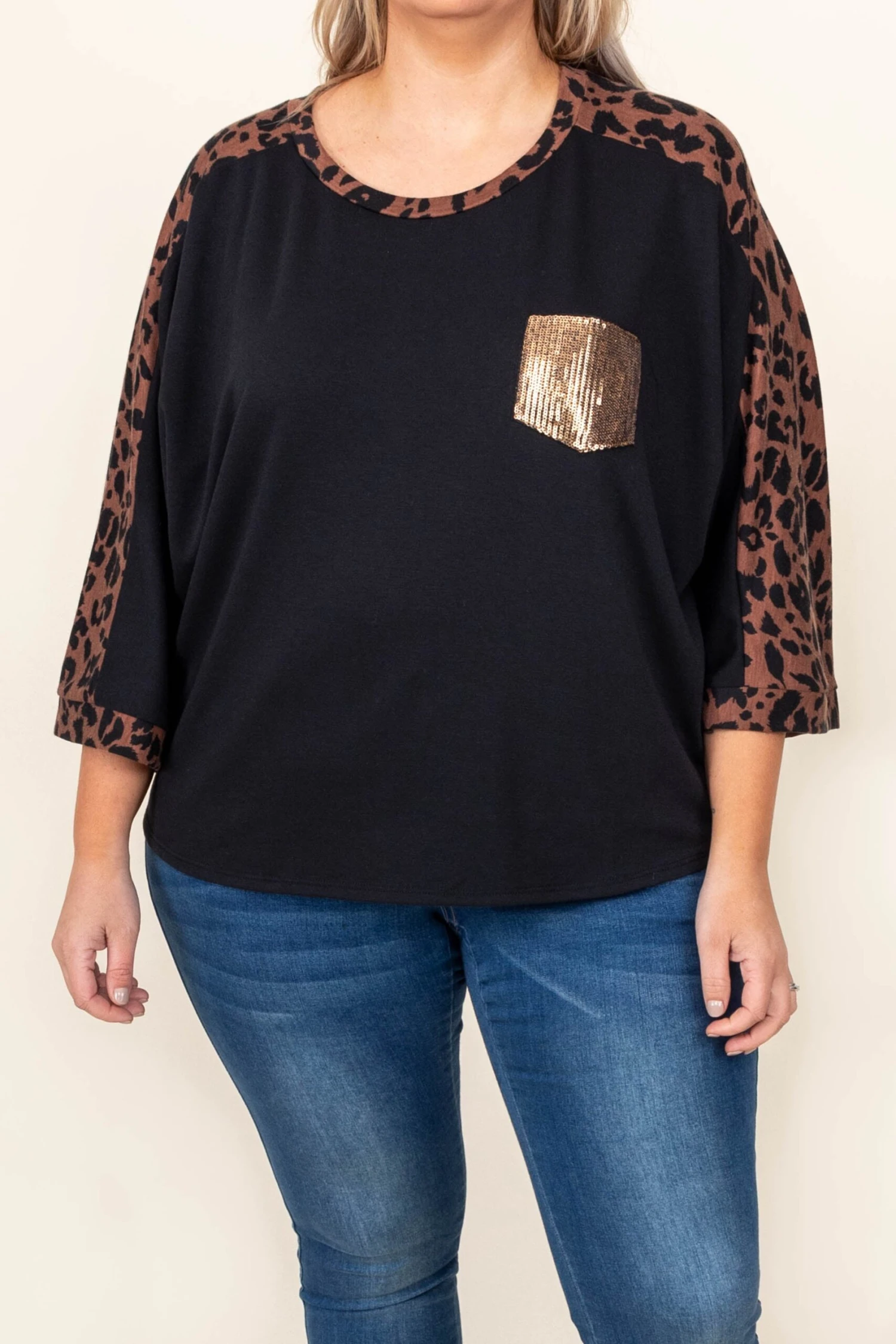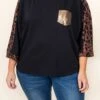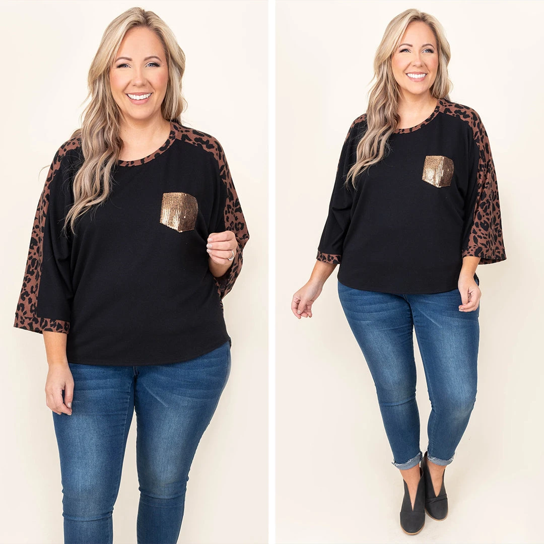 Show off your extravagant style in this fun top! The black color makes the leopard sleeve design and gold sequin pocket really pop! We love how soft this is making it perfect for all day wear! Pair it with some skinnies for a fabulous look!